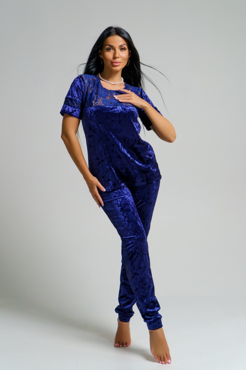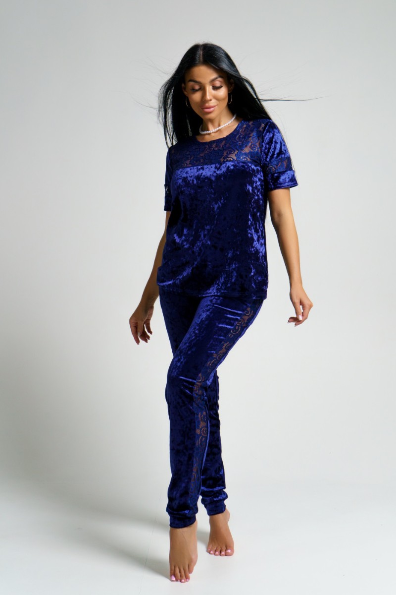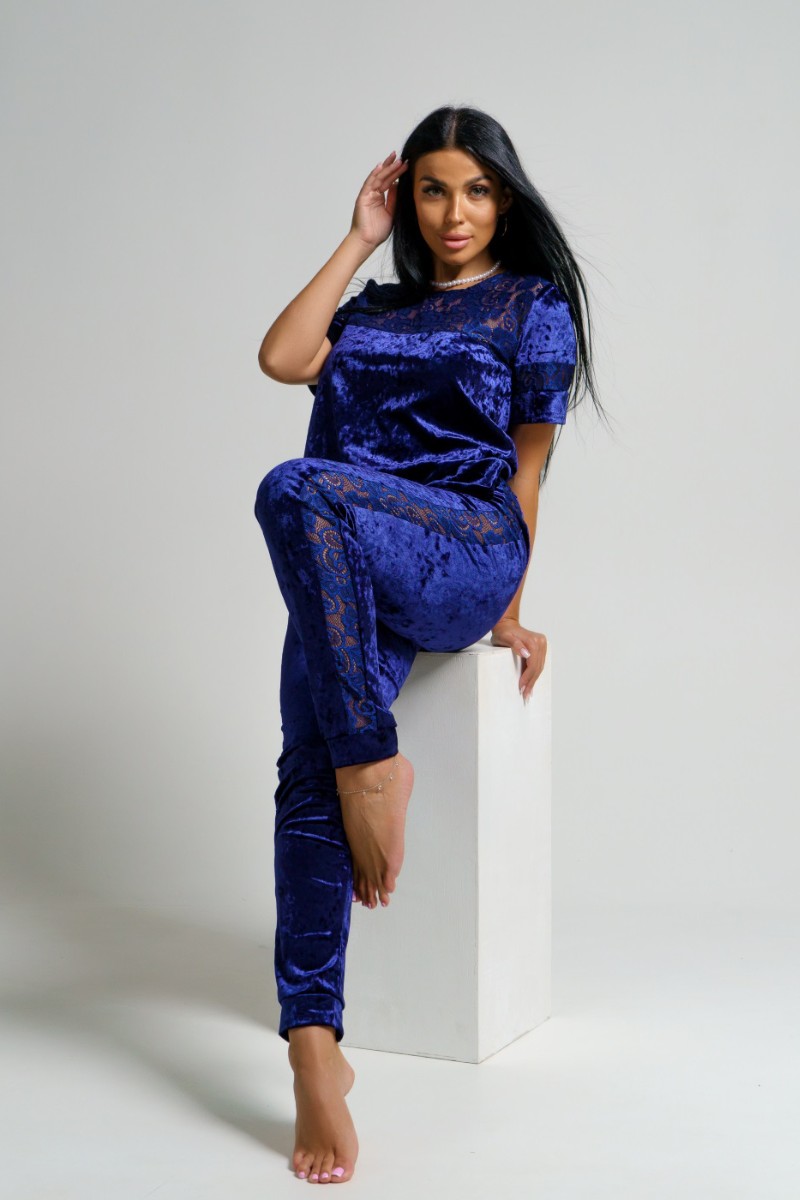 Представляем Вашему вниманию оригинальный женский костюм двойку из мраморного бархата в сочетании с набивным гипюром. Брюки с лампасами на манжетах. Кофта с кружевной кокеткой и вставками на рукавах.