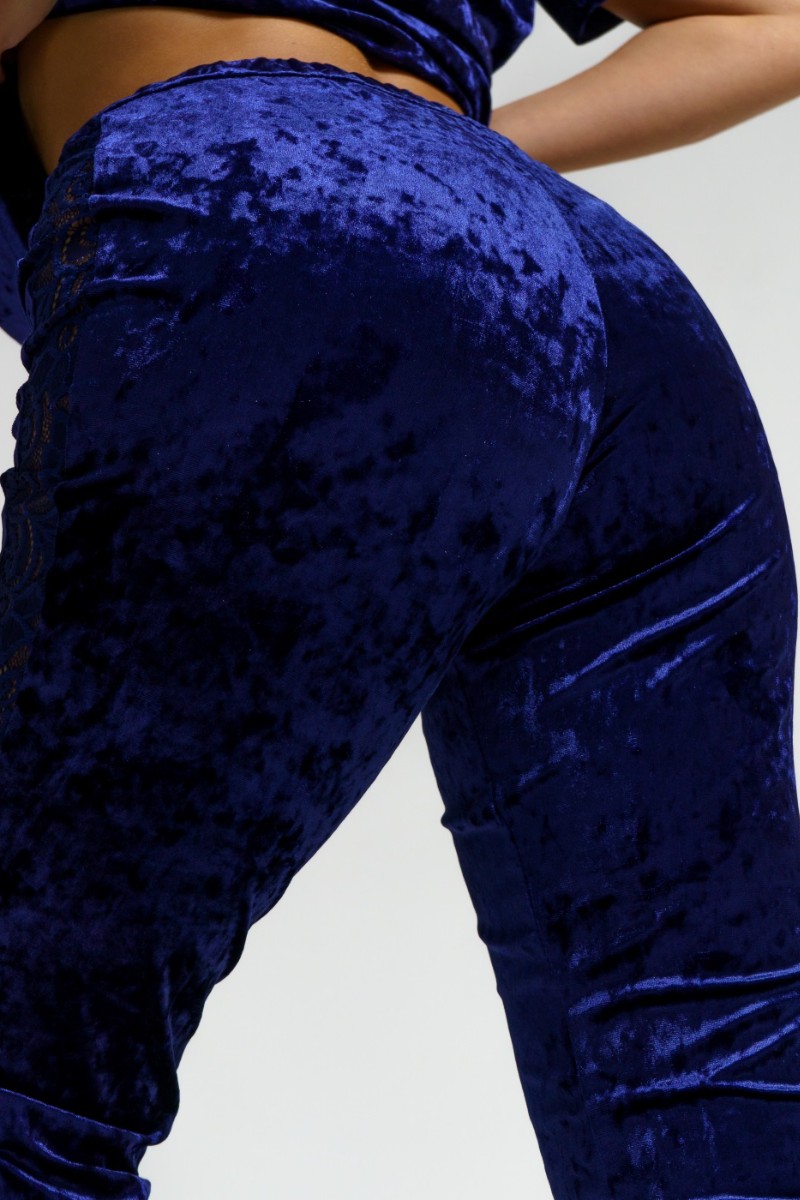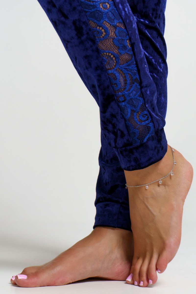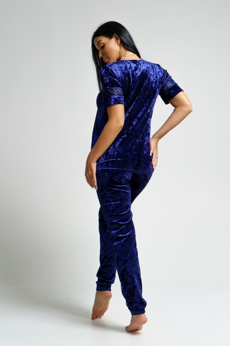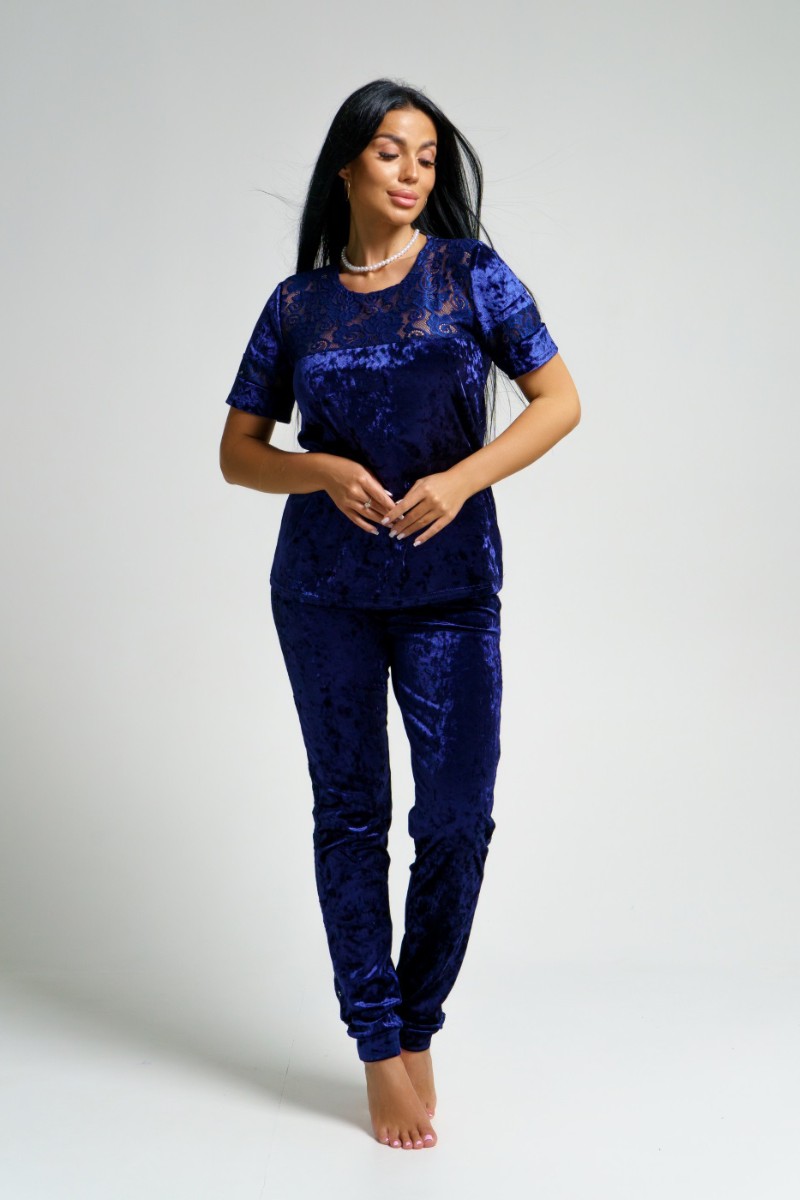 Представляем Вашему вниманию оригинальный женский костюм двойку из мраморного бархата в сочетании с набивным гипюром. Брюки с лампасами на манжетах. Кофта с кружевной кокеткой и вставками на рукавах.