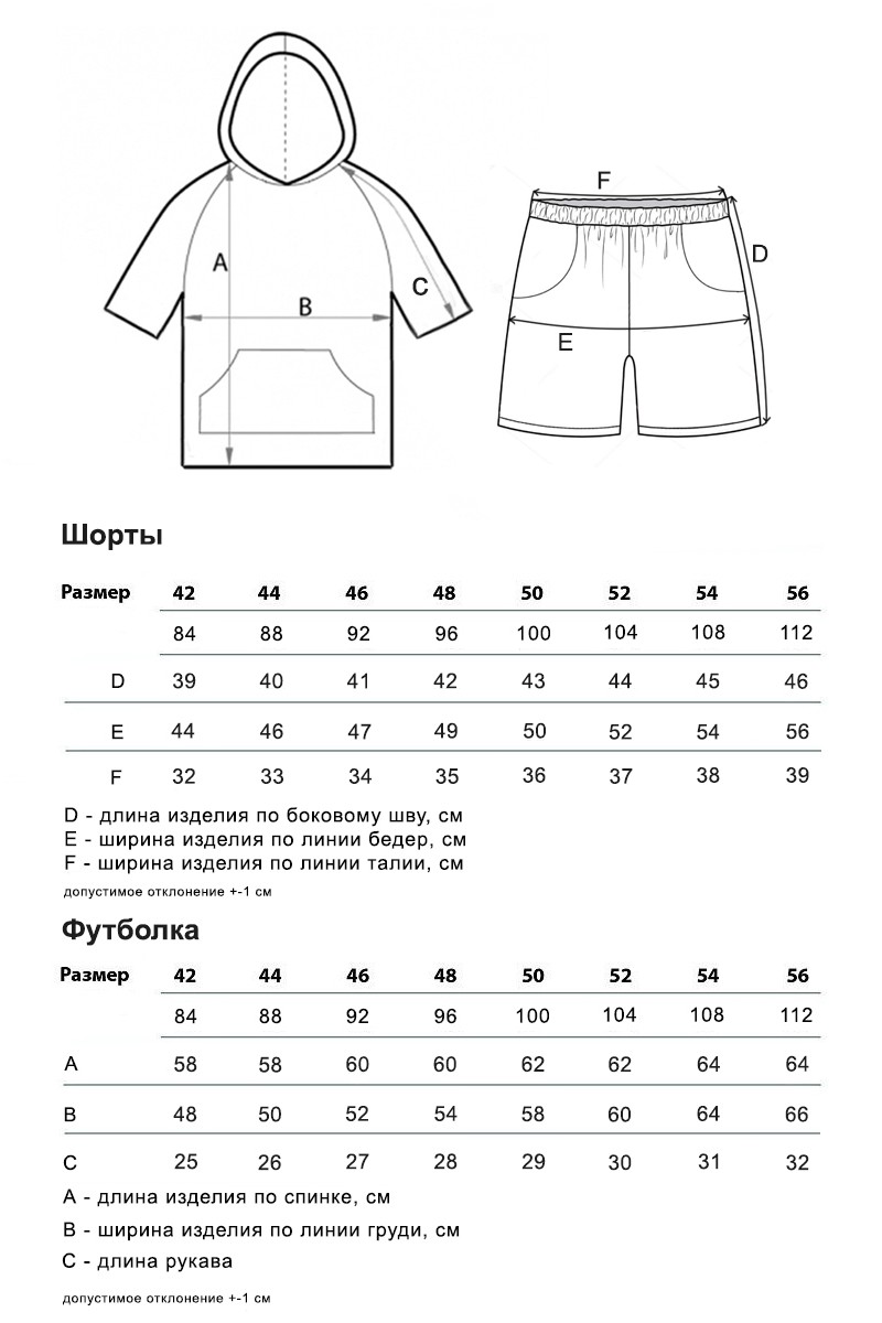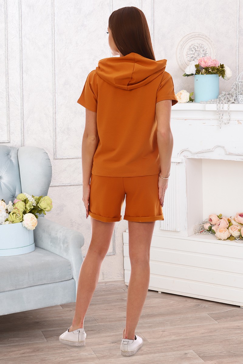 Представляем Вашему вниманию яркий женский костюм двойку. Футболка со спущенным плечом и капюшоном, на переде карман-кенгуру. Шорты на притачном поясе из отделочной ткани, с отворотами по низу. На передней части шорт — карманы.