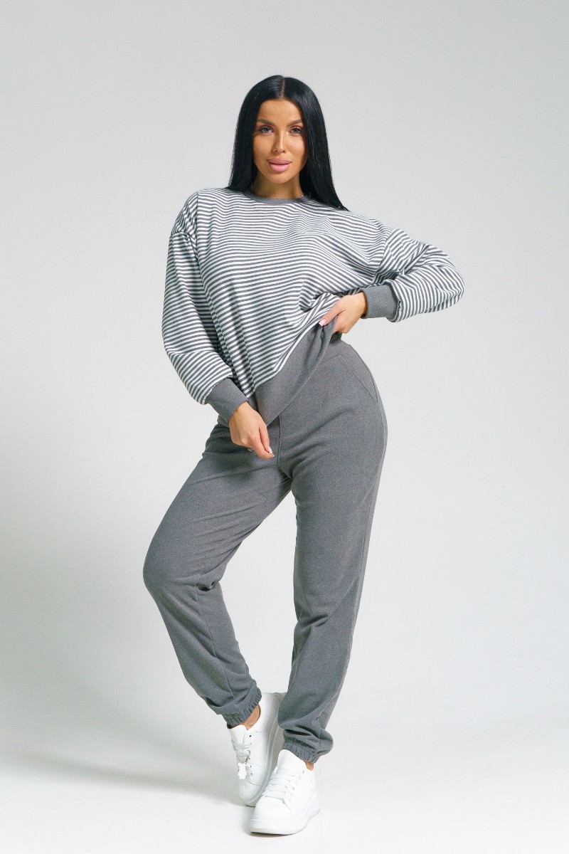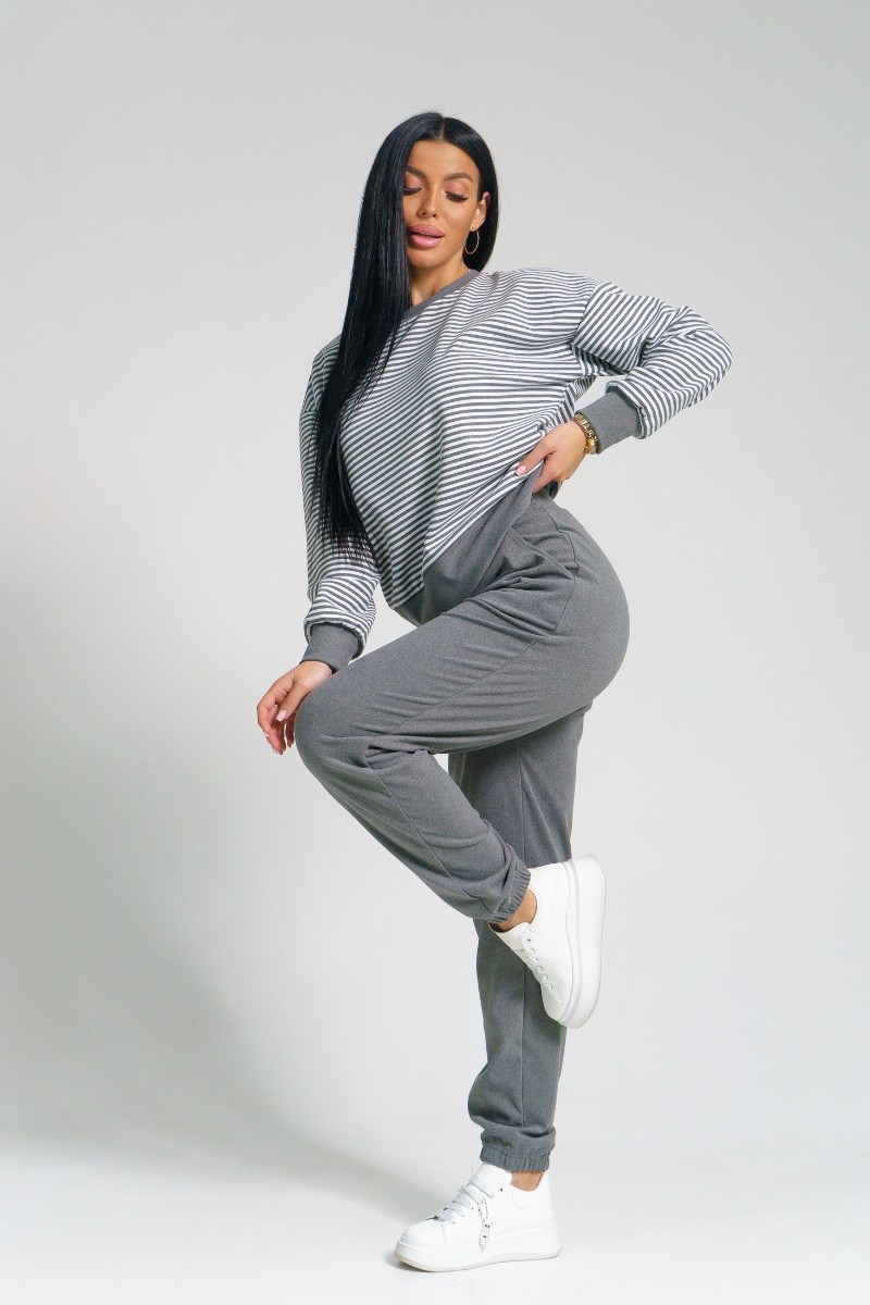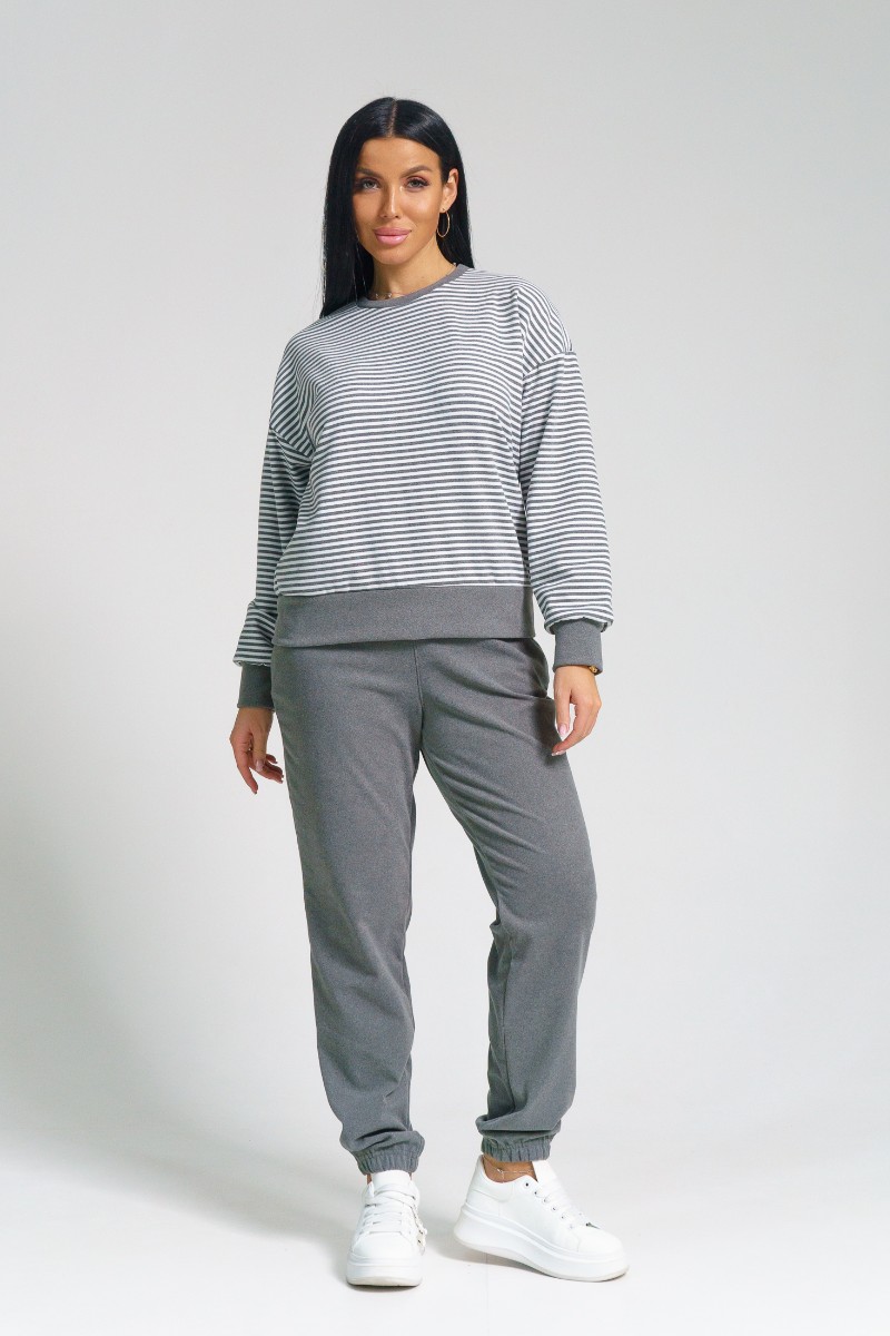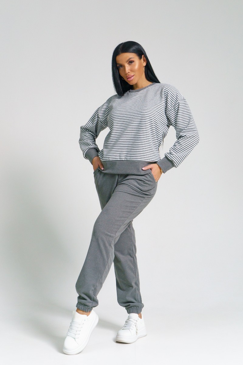 Представляем Вашему вниманию стильный костюм, состоящий из брюк и джемпера. Брюки с карманами, низ брюк на резинке. Срезы костюма отделаны рибаной в цвет.
