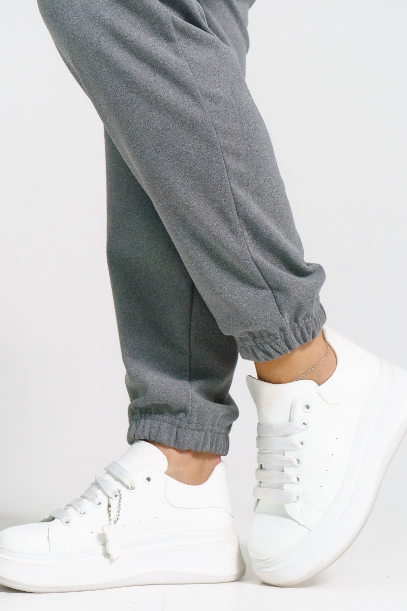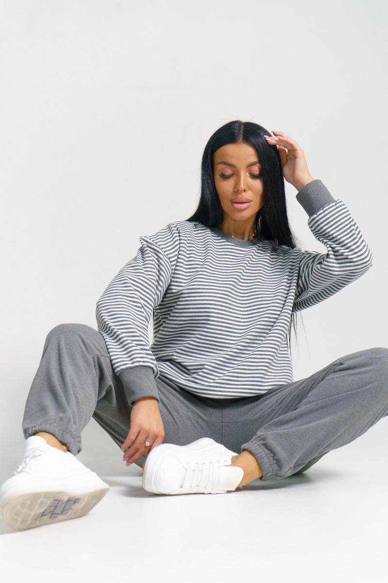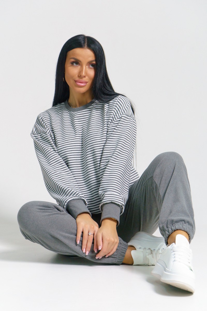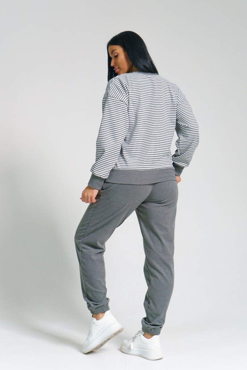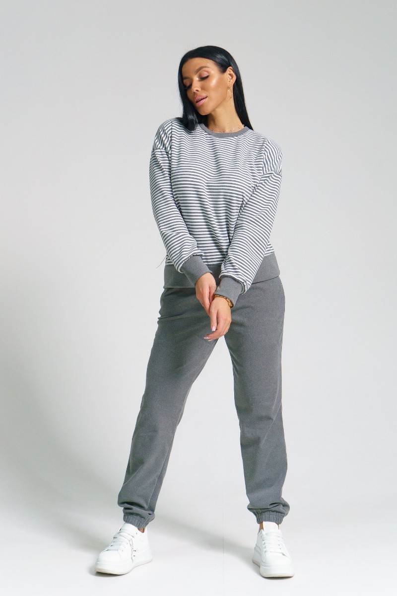 Представляем Вашему вниманию стильный костюм, состоящий из брюк и джемпера. Брюки с карманами, низ брюк на резинке. Срезы костюма отделаны рибаной в цвет.