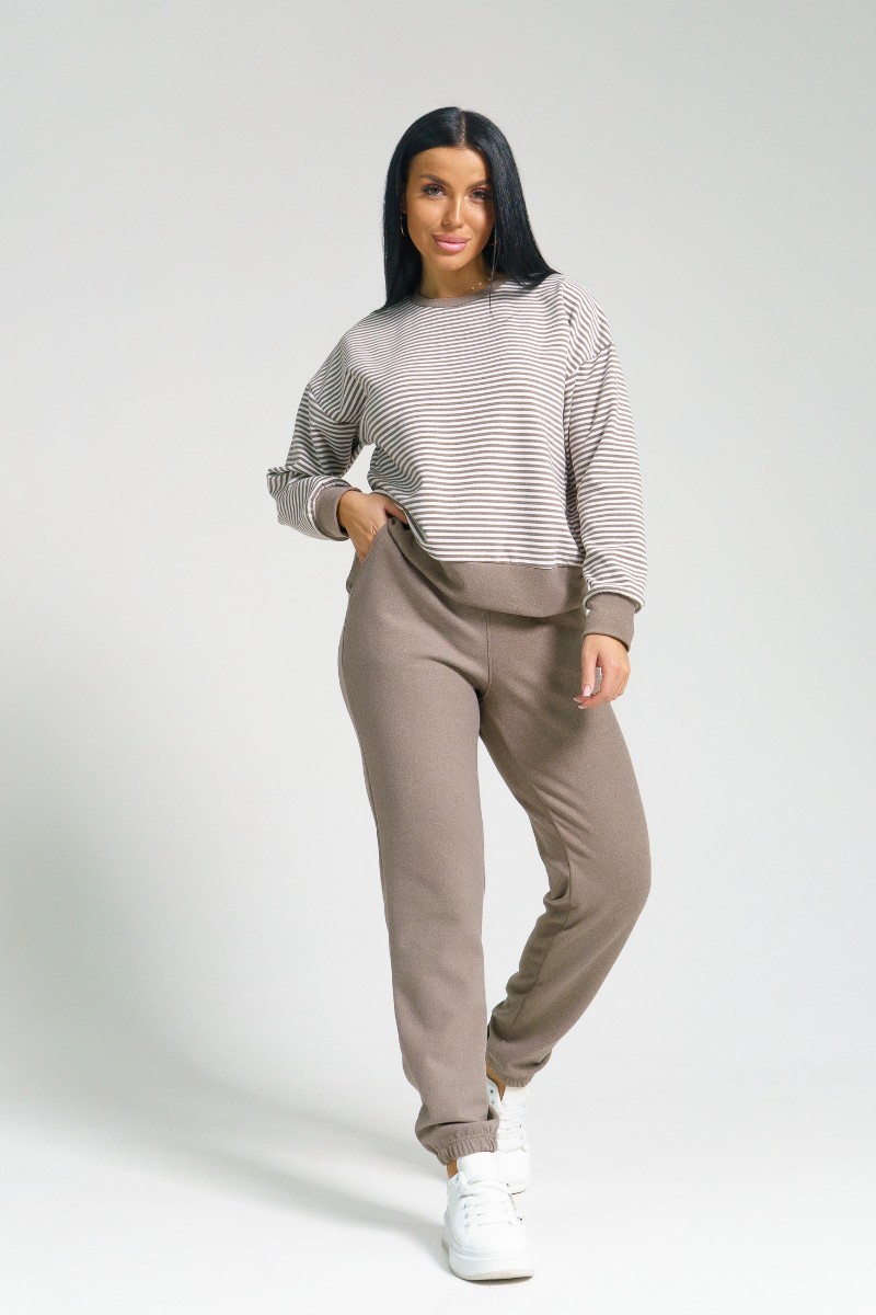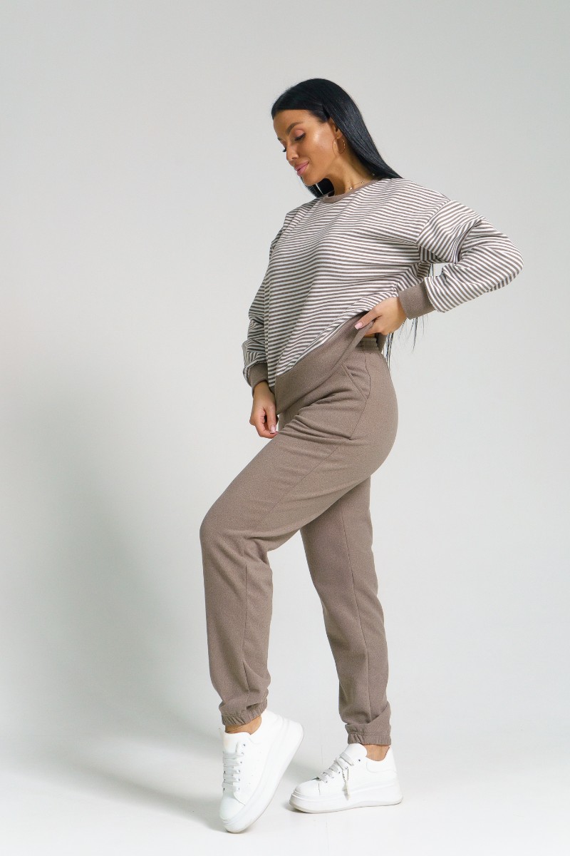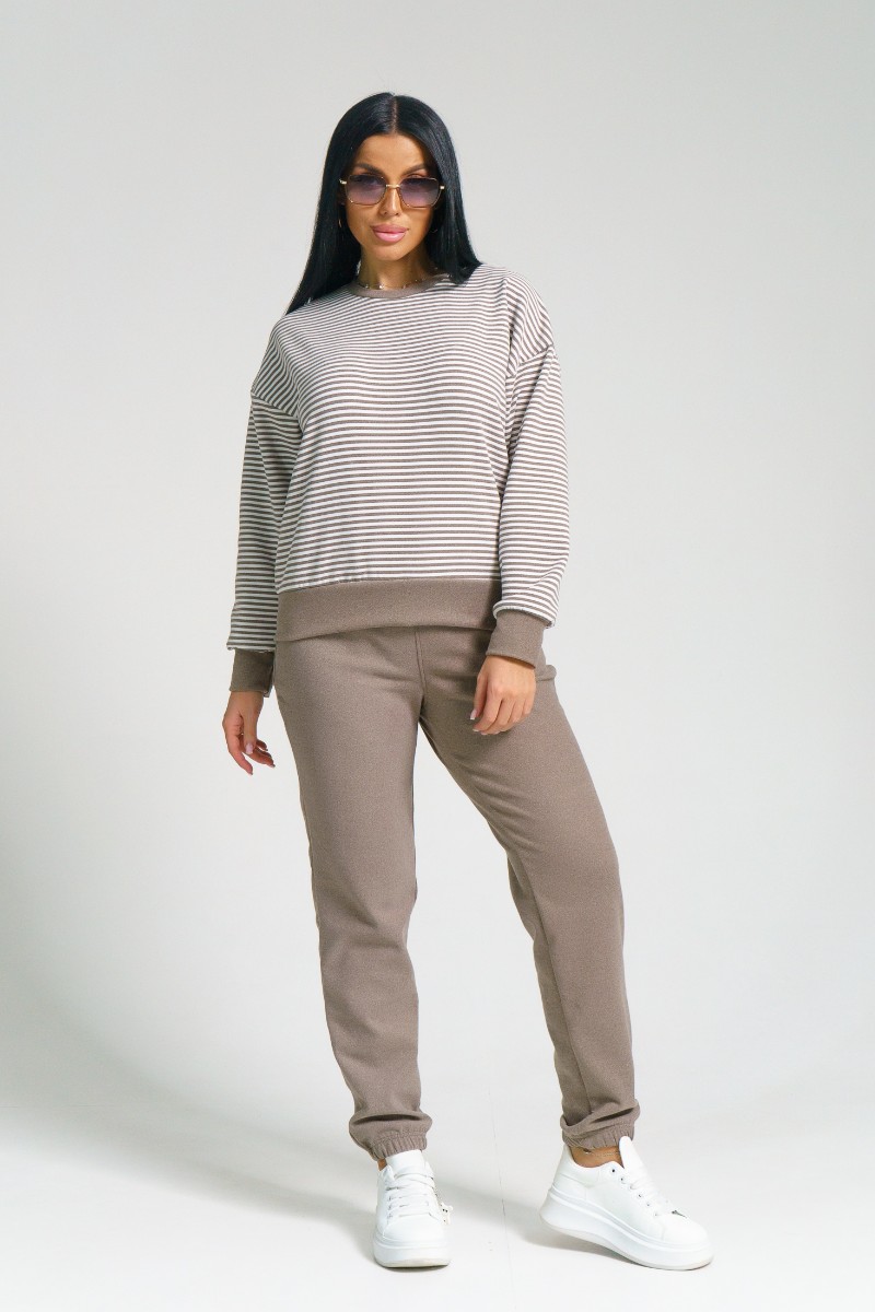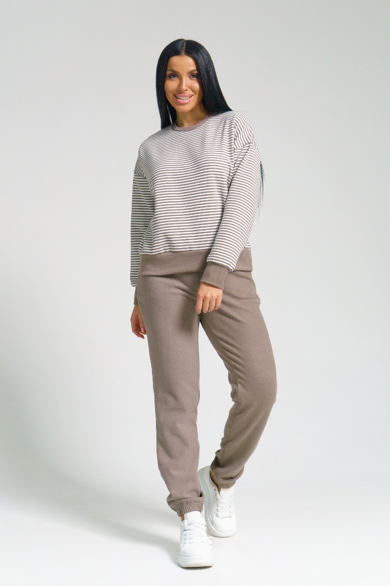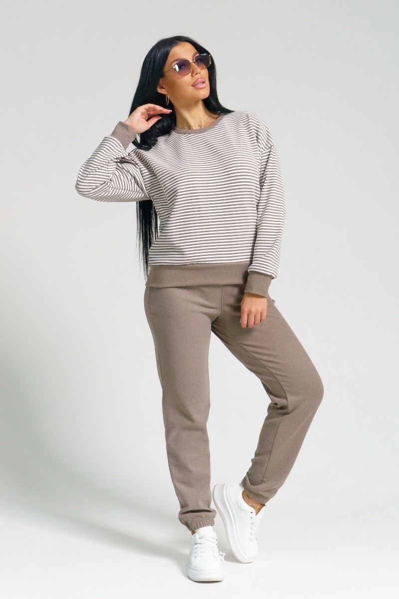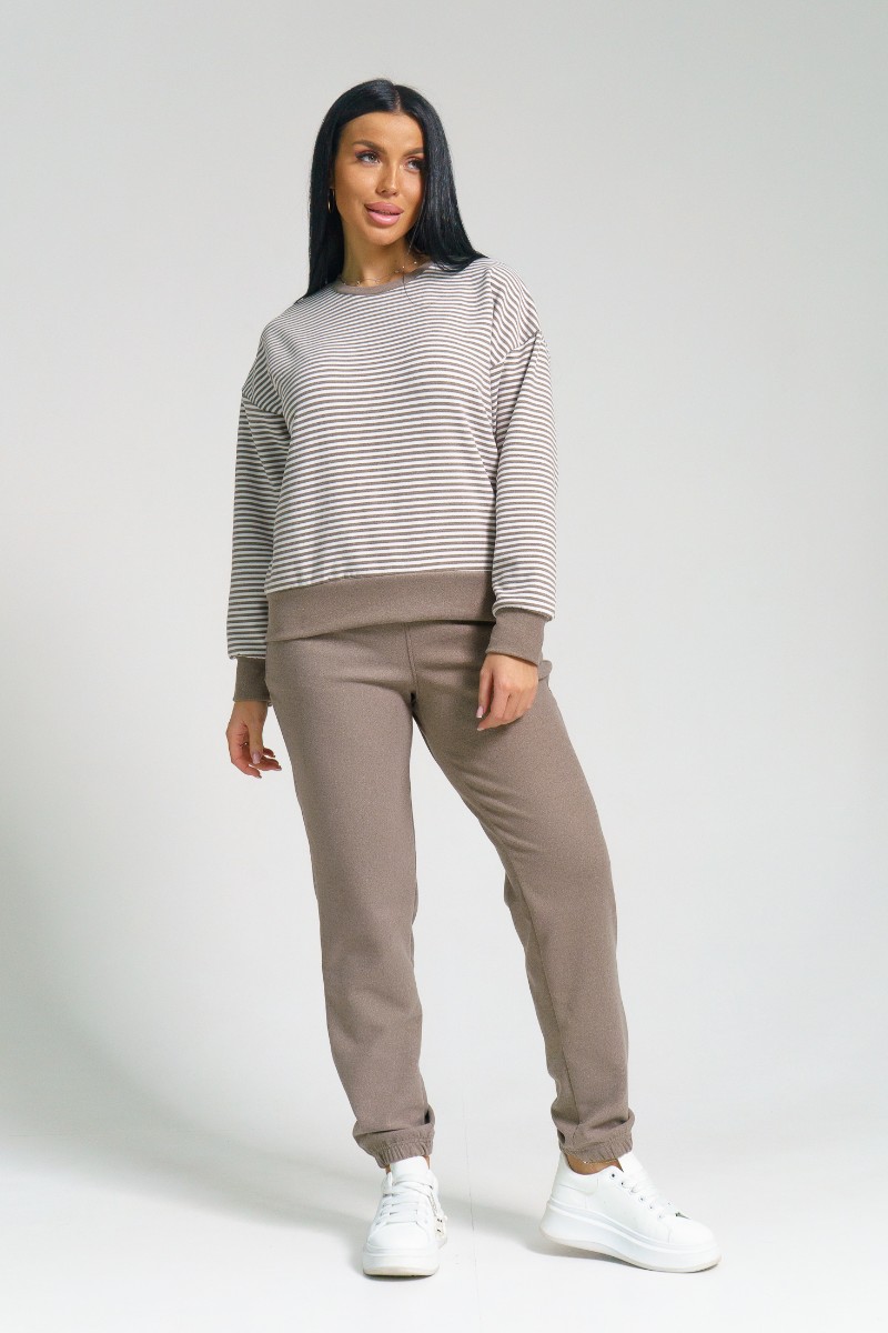 Представляем Вашему вниманию стильный костюм, состоящий из брюк и джемпера. Брюки с карманами, низ брюк на резинке. Срезы костюма отделаны рибаной в цвет.