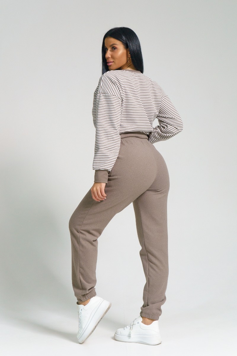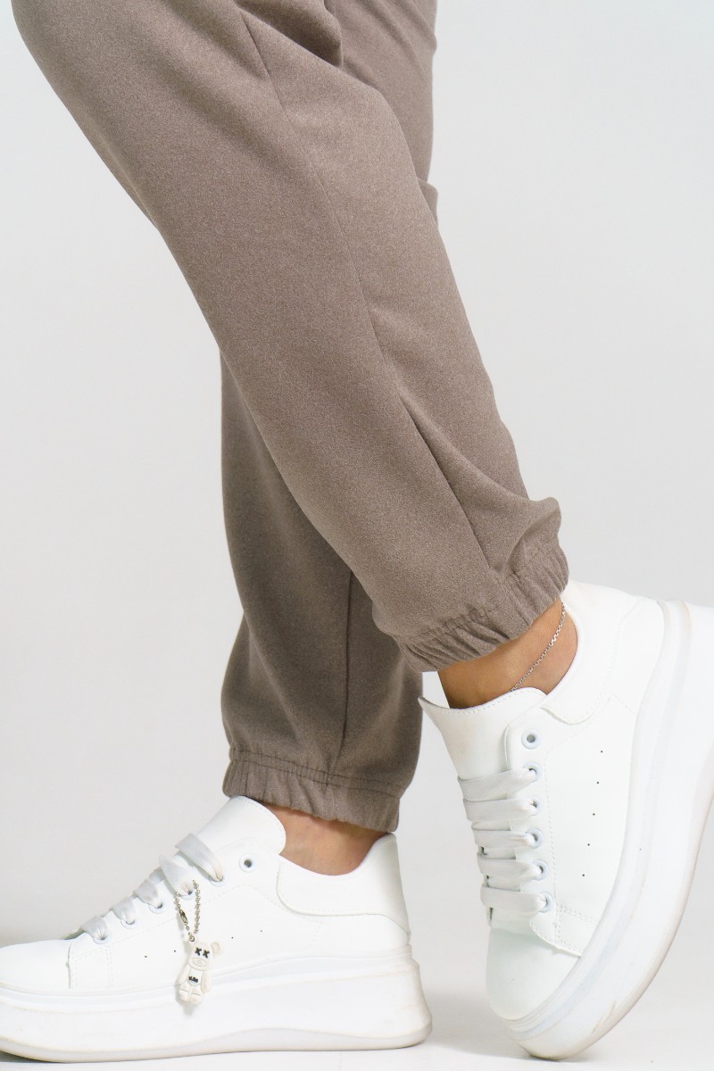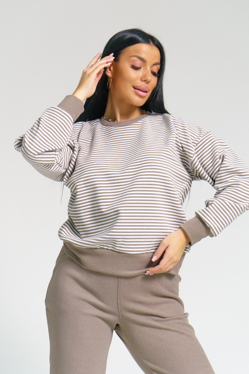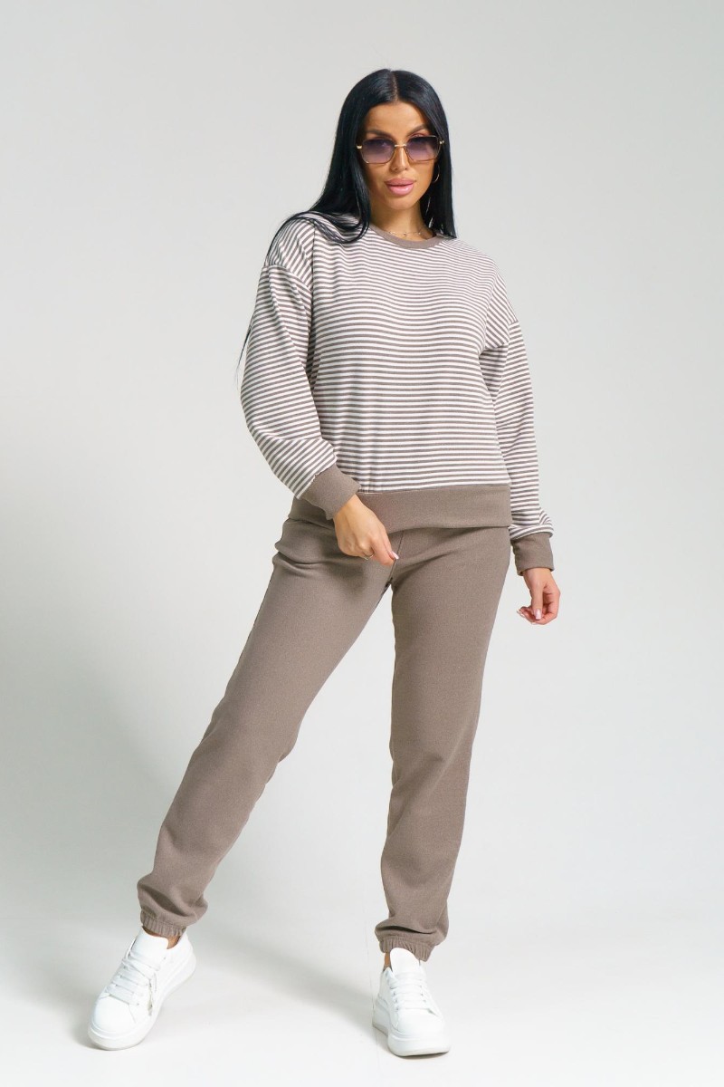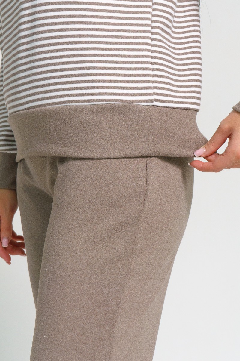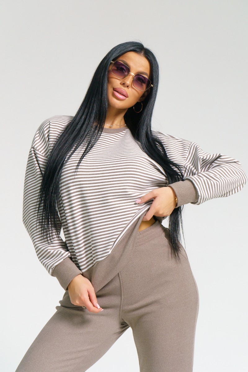 Представляем Вашему вниманию стильный костюм, состоящий из брюк и джемпера. Брюки с карманами, низ брюк на резинке. Срезы костюма отделаны рибаной в цвет.