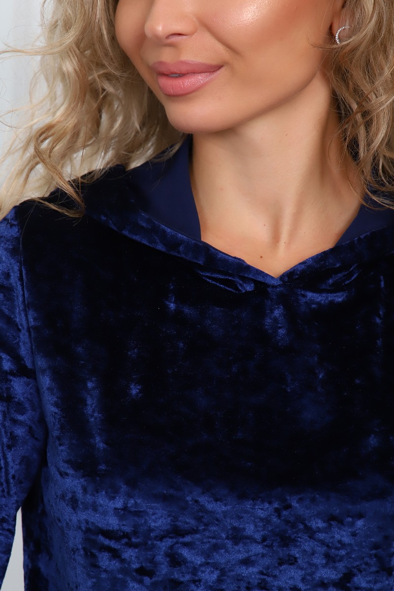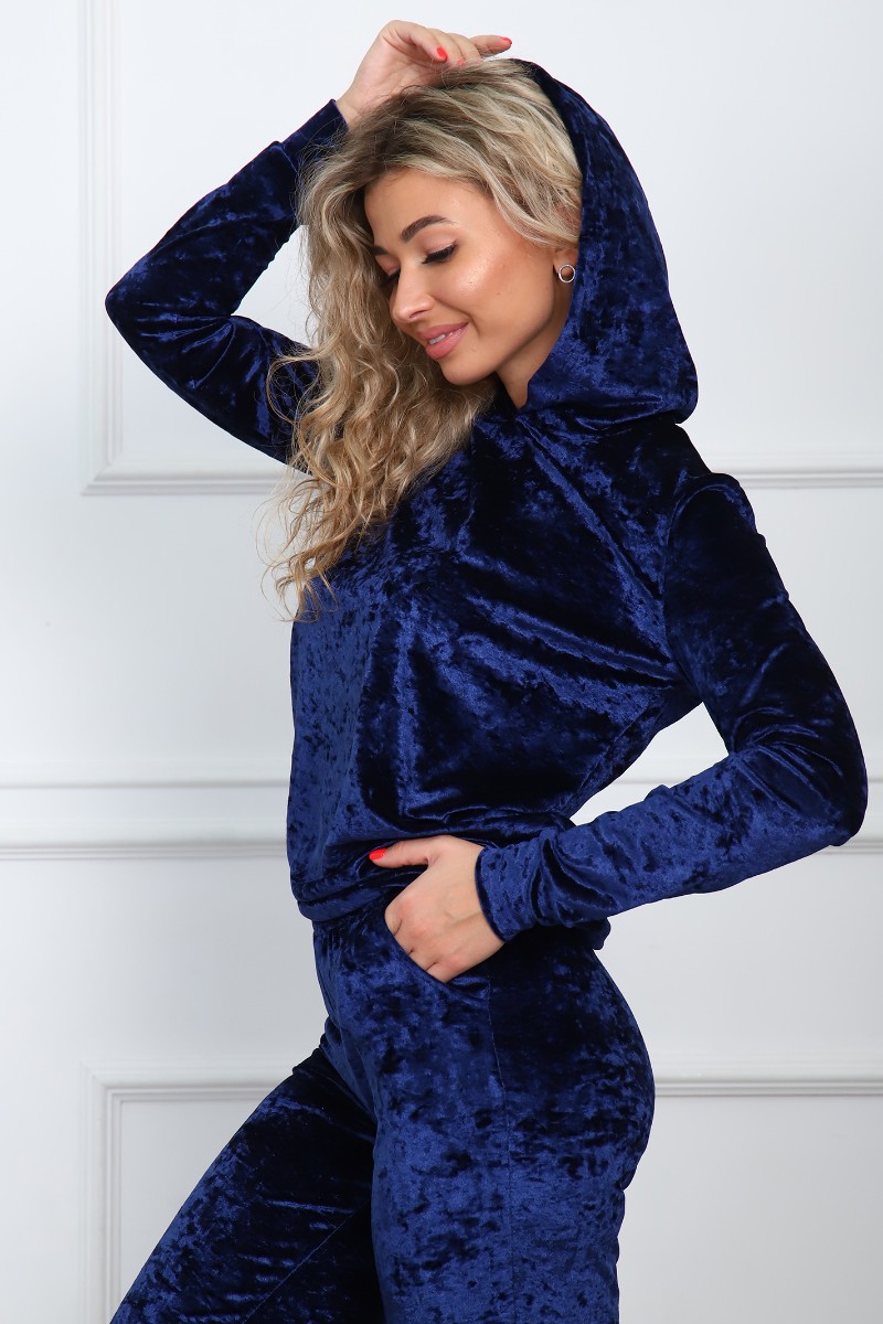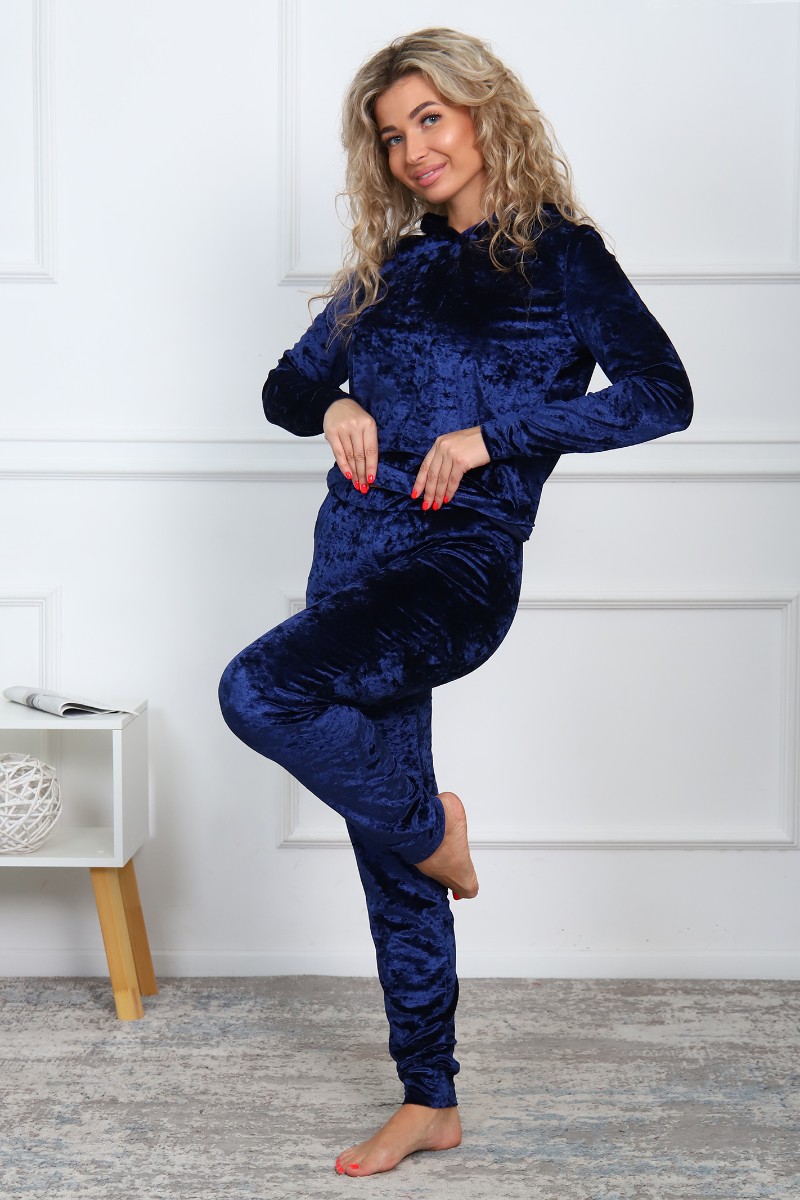 Представляем Вашему вниманию стильный женский костюм с капюшоном, сшитый из приятного телу, высококачественного мраморного велюра. Кофта с длинным рукавом на манжете, брюки с карманами.