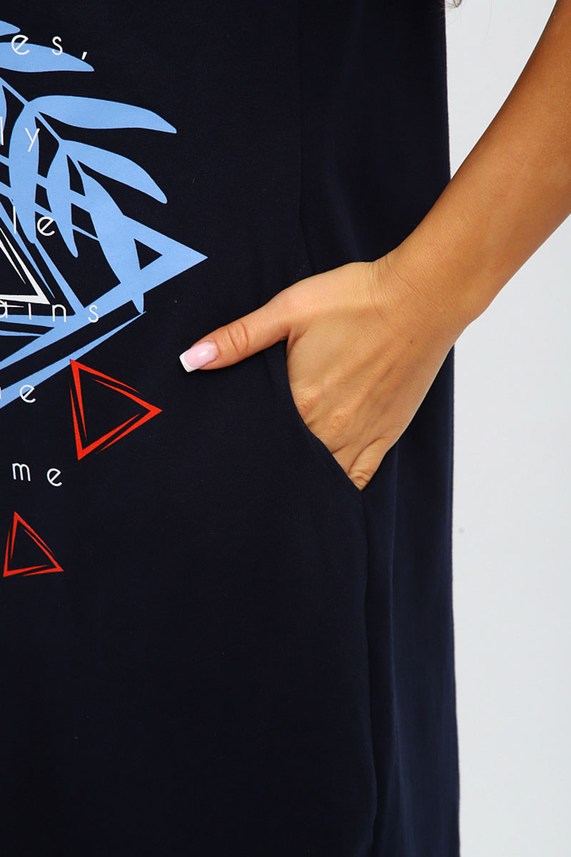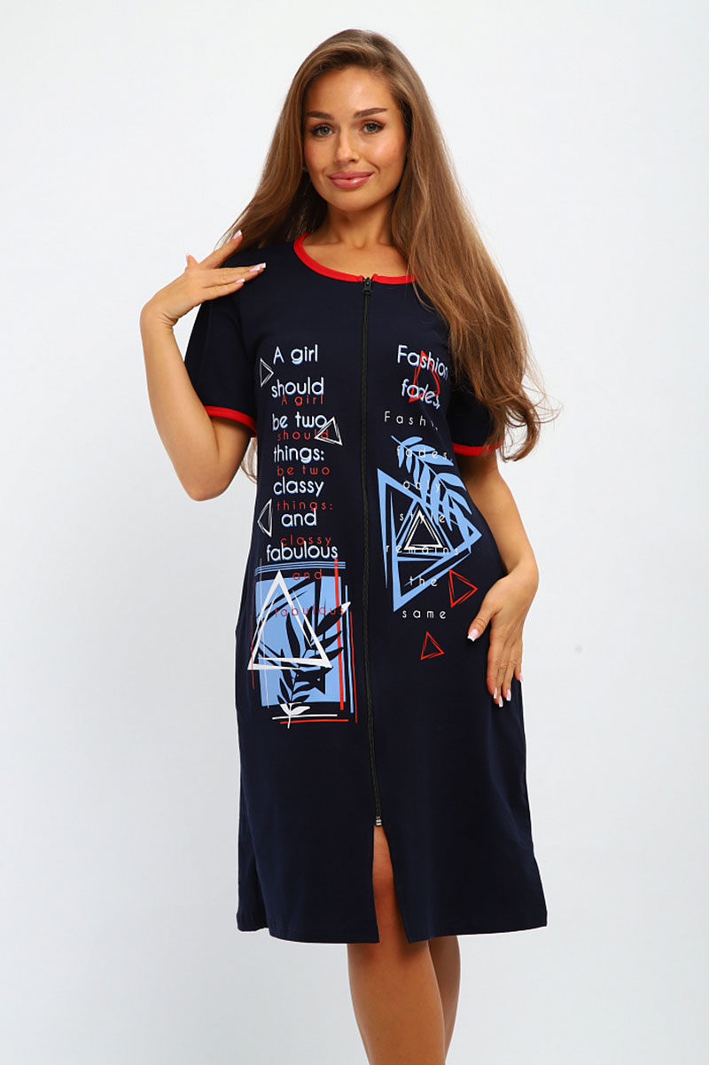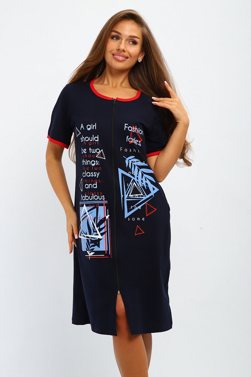 Представляем Вашему вниманию женский халат из трикотажного полотна "кулирка" (100% хлопок). Халат свободного силуэта, рукав короткий, карманы в боковых швах, застежка на молнию. Горловина и рукава окантованы, на полочках выполнена печать. Комфортный и стильный наряд для домашнего отдыха!