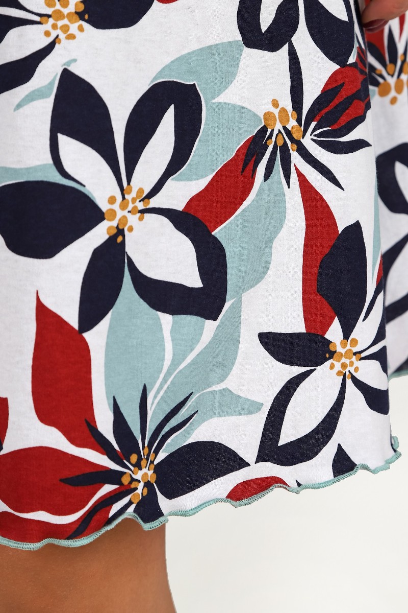 Представляем Вашему вниманию женскую сорочку из трикотажного полотна «кулирка» с набивным рисунком, расширенная книзу, без рукавов, с расширенной, углубленной горловиной овальной формы и притачной кокеткой по переду. Срезы пройм и горловины, а также шов притачивания кокетки, обработаны фасонной эластичной тесьмой с кружевным краем. Низ изделия обработан узкой обметочной строчкой.