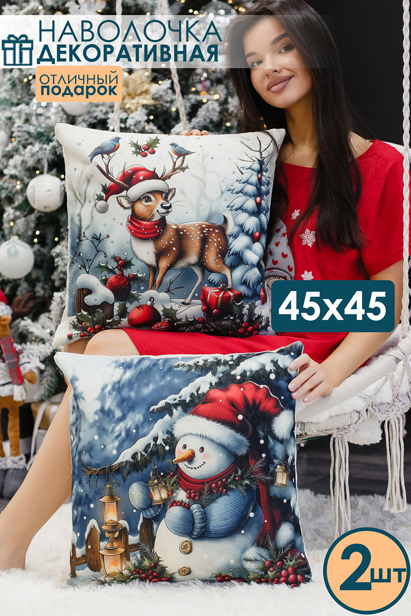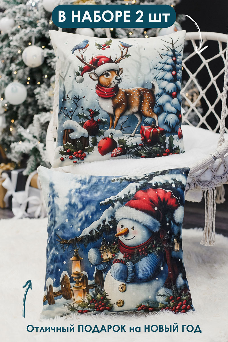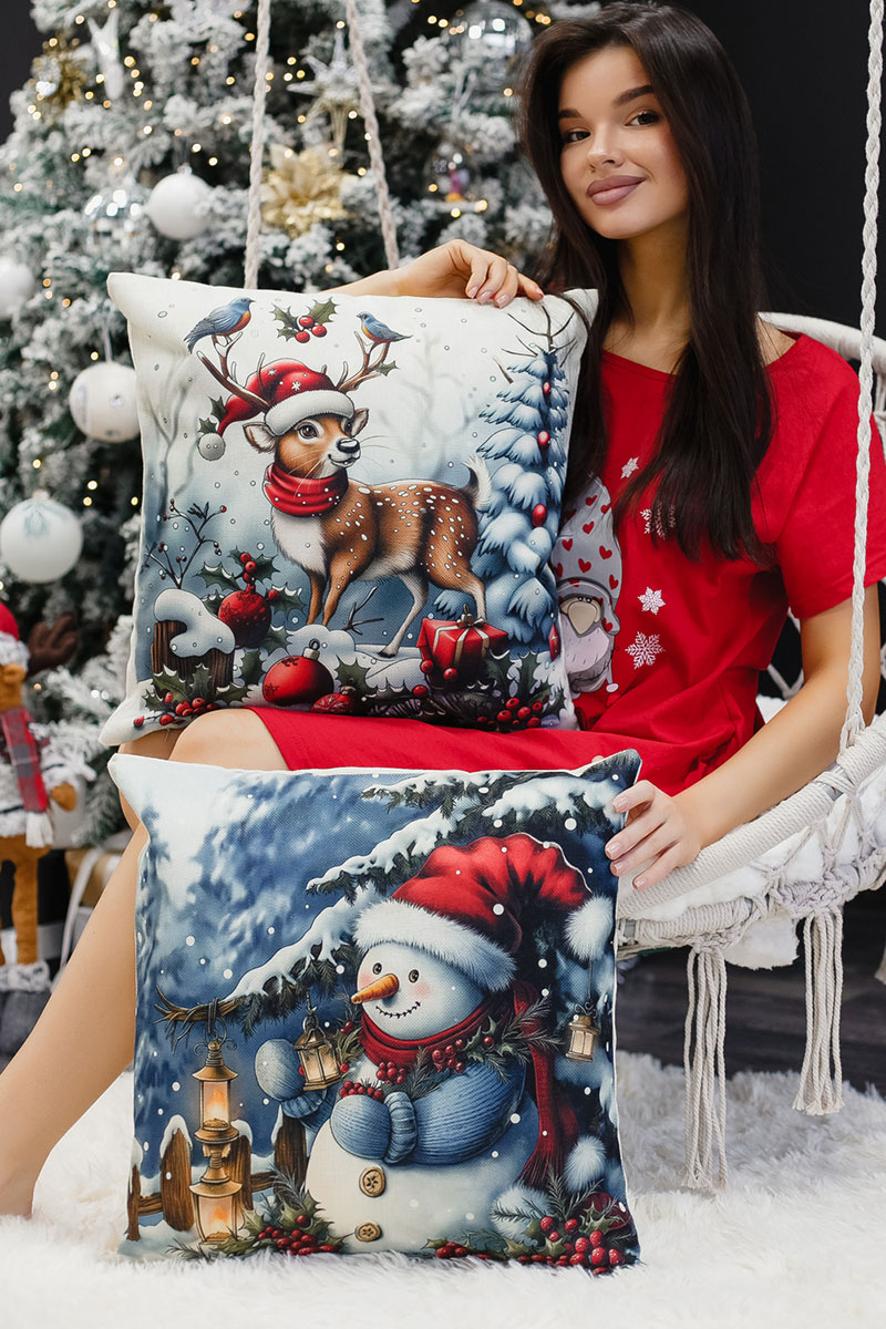 Наволочка-чехол декоративная на молнии "Олень, шапка, снеговик" 2 шт.