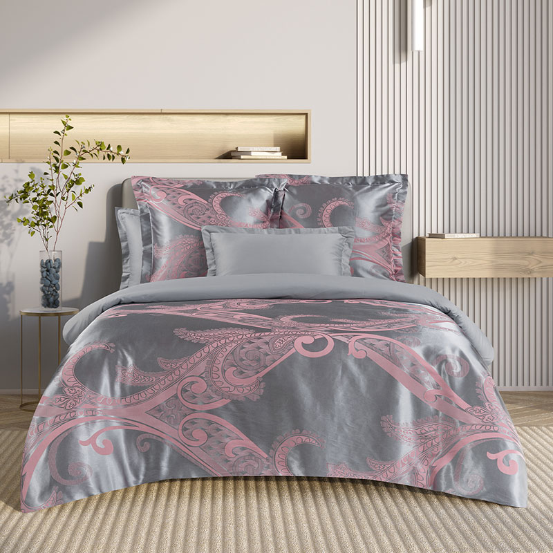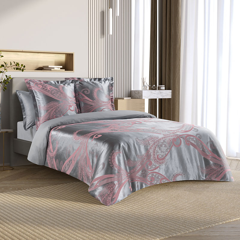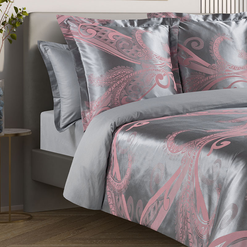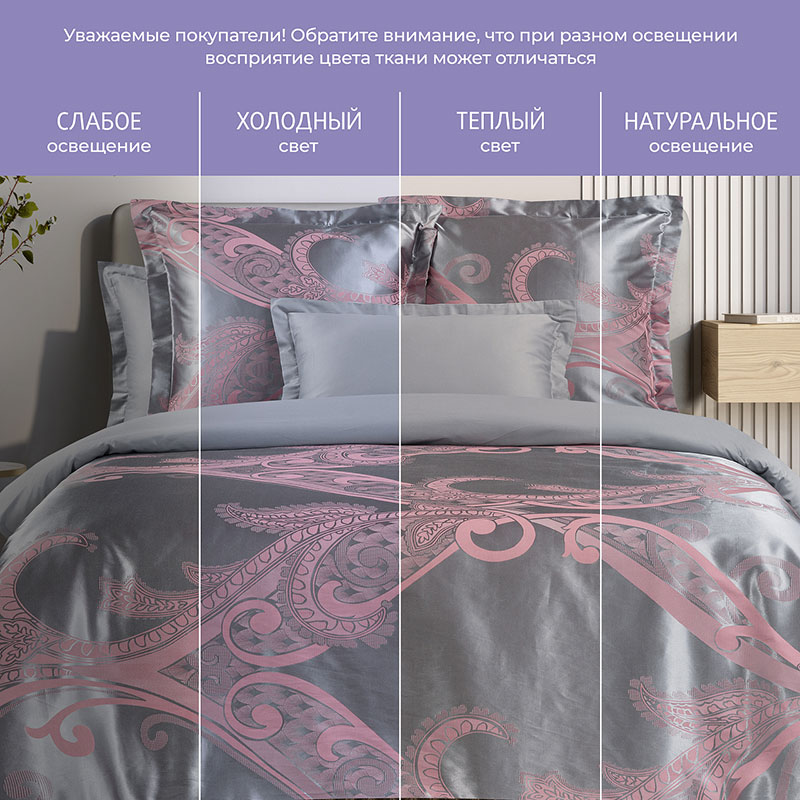 Особенности: пододеяльник с молнией, наволочки с ушками. На верхней части пододеяльника и наволочек 70х70 блестящий узор выполнен шелковой нитью из вискозы.
