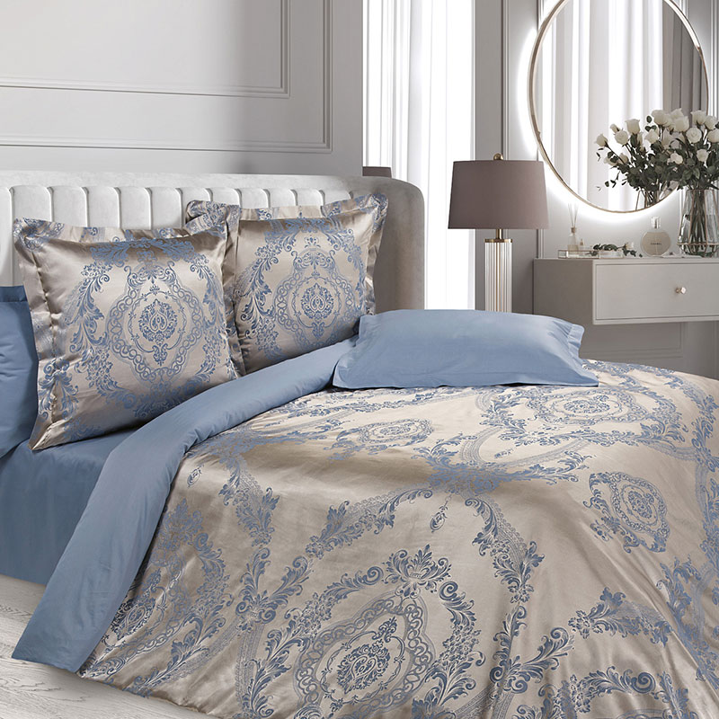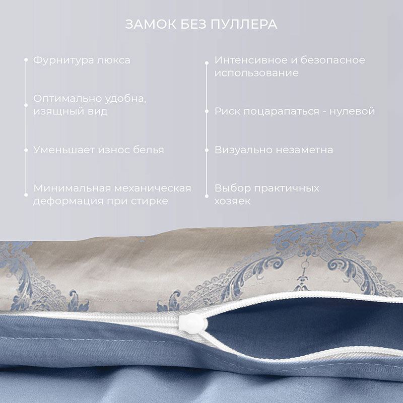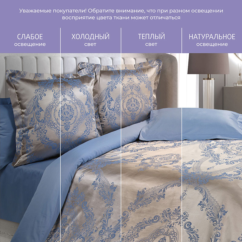Особенности: пододеяльник с молнией, наволочки с ушками. На верхней части пододеяльника и наволочек 70х70 блестящий узор выполнен шелковой нитью из вискозы.