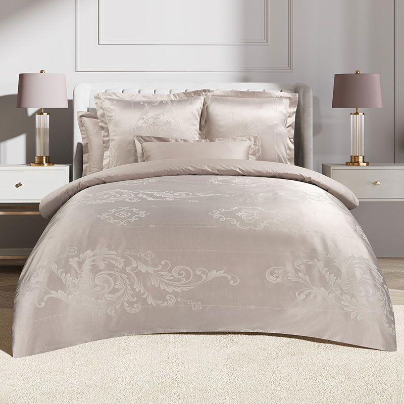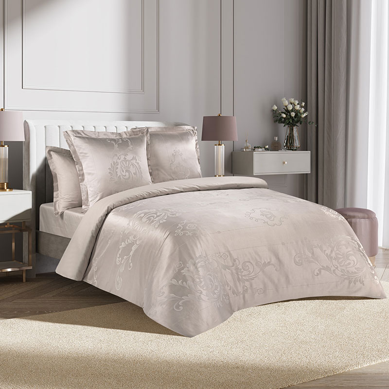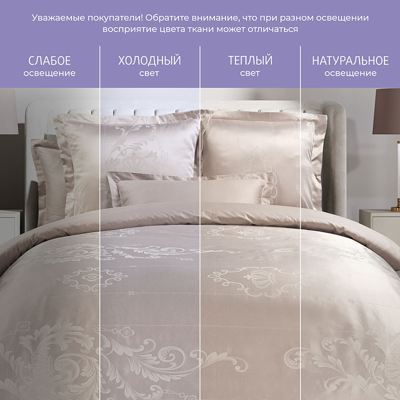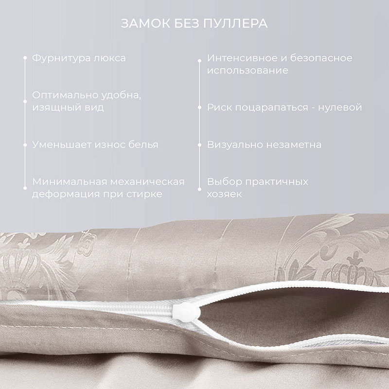 Особенности: пододеяльник с молнией, наволочки с ушками. На верхней части пододеяльника и наволочек 70х70 блестящий узор выполнен шелковой нитью из вискозы.