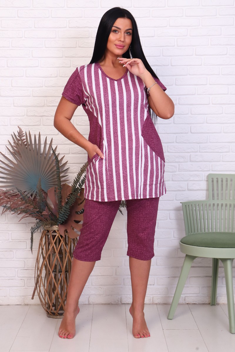 Представляем Вашему вниманию легкий женский костюм двойку из кулирки - 100% натурального, дышащего хлопка. Карманы в боковых швах, V-образный вырез горловины, бриджи на резинке. Комплект имеет интересную расцветку, которая красиво смотрится и поднимает настроение. Костюм хорошо сидит на фигуре и подчеркивает её достоинства. В нём Вы будете чувствовать себя комфортно и уверенно.