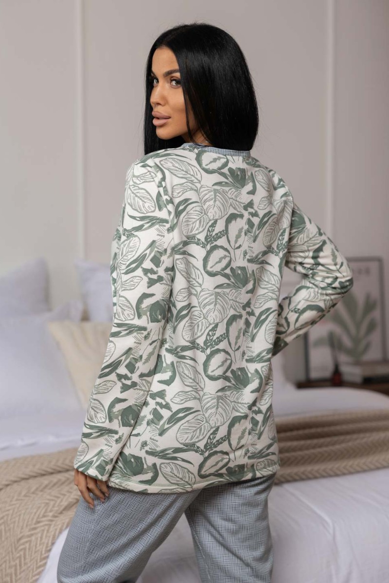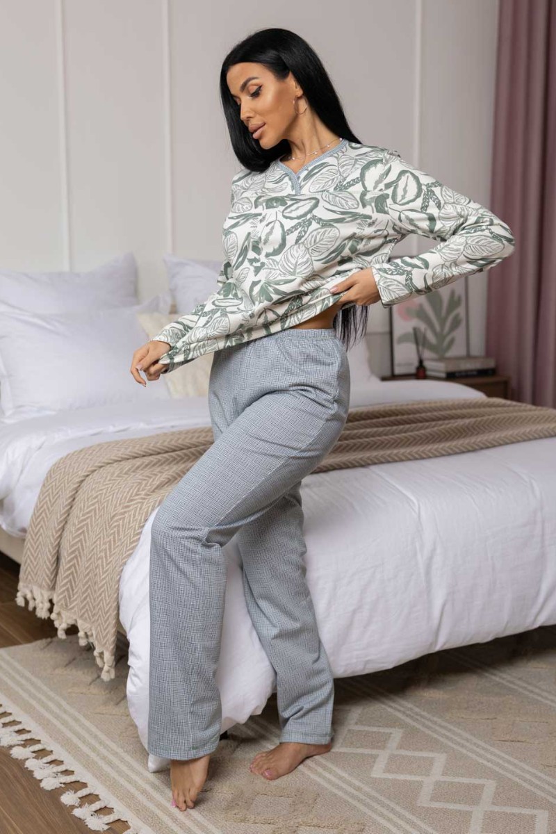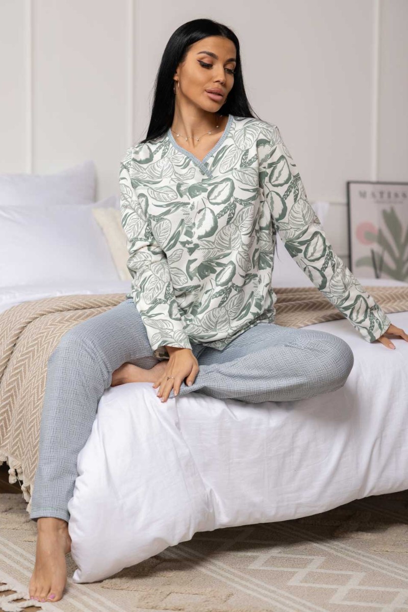 Представляем Вашему вниманию женскую пижаму, сшитую из приятной трикотажной ткани с мягким начесом. Отличный комплект для сна и отдыха, в нем Вы будете засыпать с комфортом. Пижама выполнена из тканей компаньонов, которые идеально подходят друг другу. Верх свободного силуэта, не сковывает движения, с кокеткой на запах. Брюки свободного силуэта, полноценной длины, без карманов.