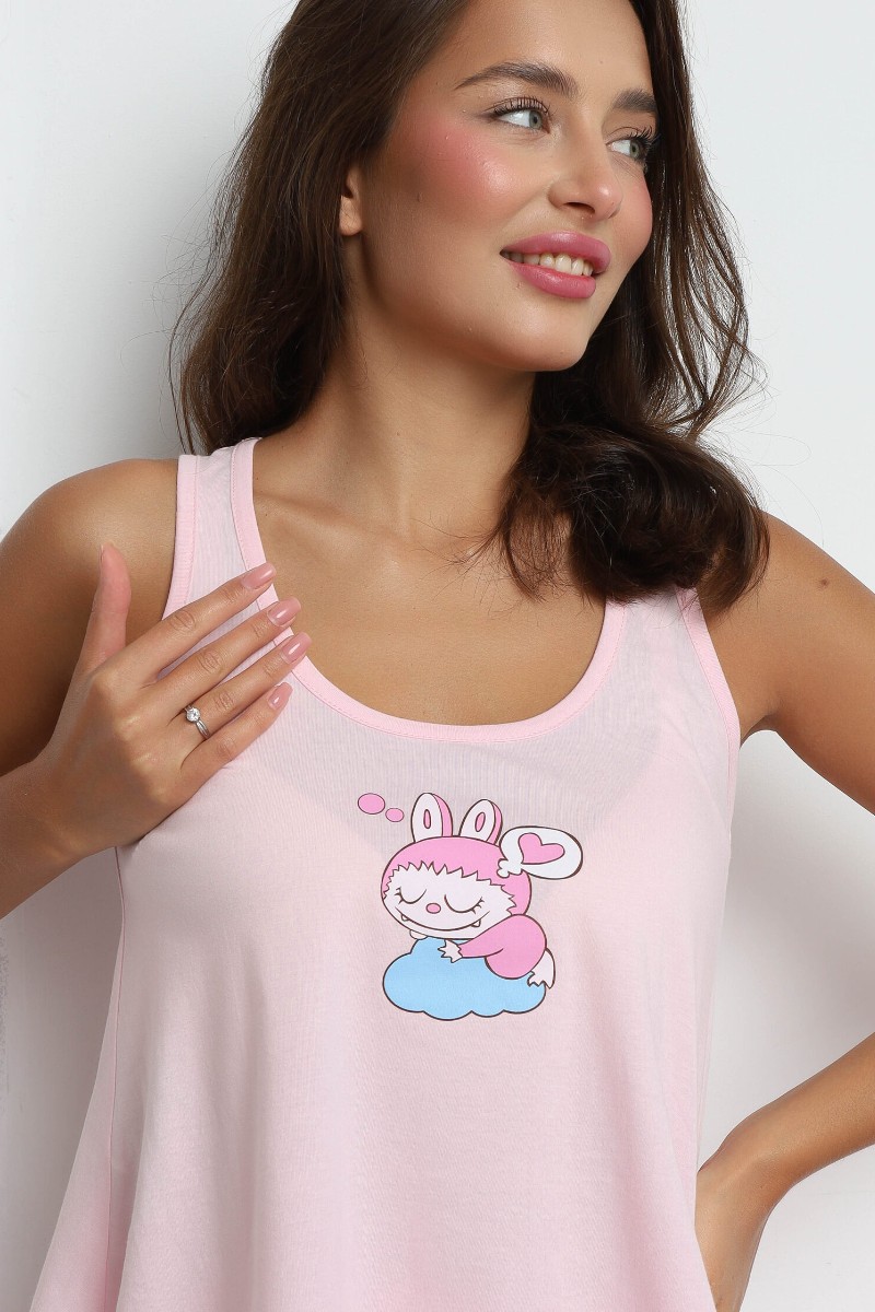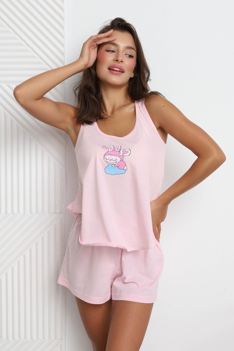 Представляем Вашему вниманию женский домашний костюм - идеальное решение для тех, кто любит комфорт и уют. Костюм из хлопка подарит Вам нежные и мягкие ощущения, а свободный крой позволит свободно двигаться дома. Комплект пижамы - это идеальный выбор для беременных и кормящих мам. Комплект включает в себя майку с принтом лабубу и шорты на резинке.