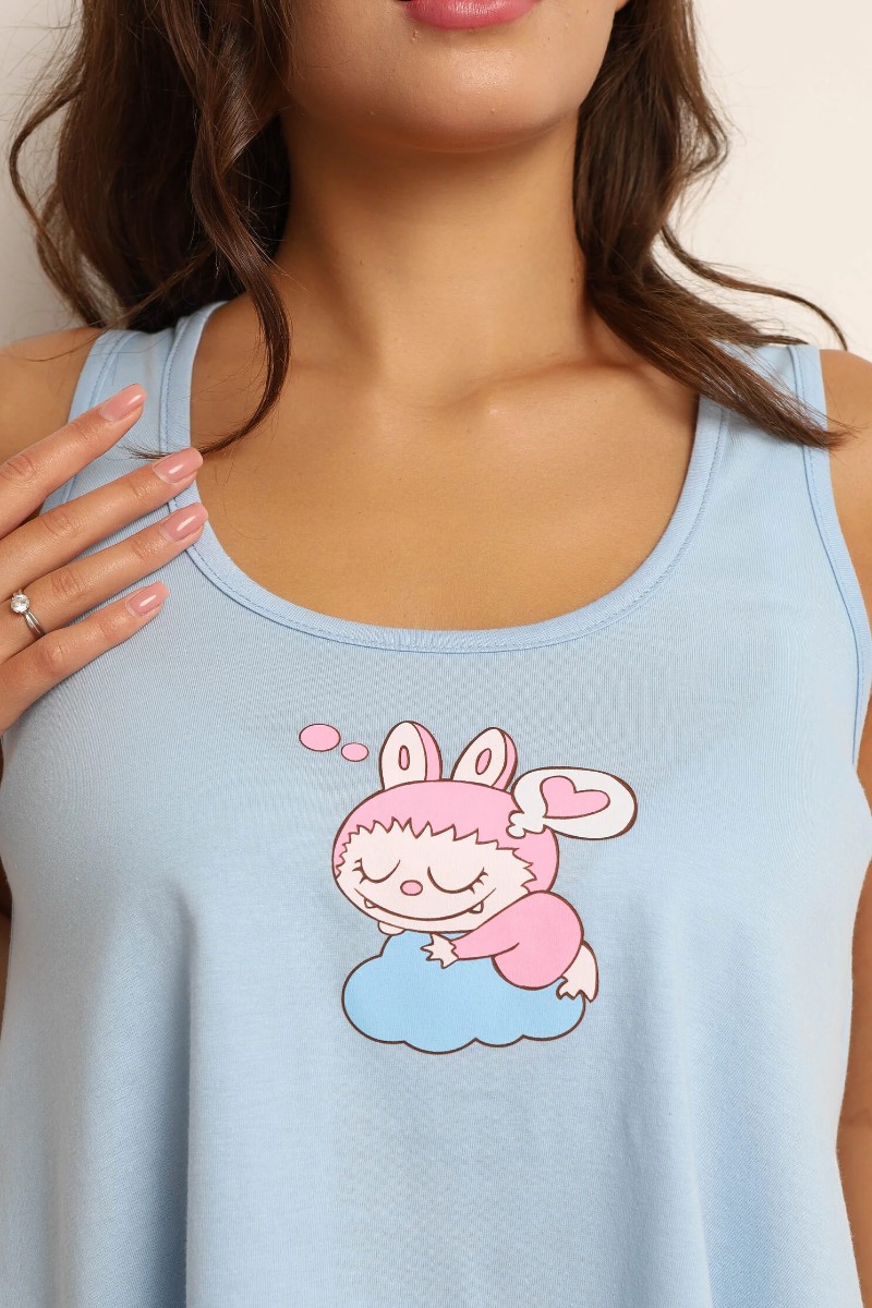 Представляем Вашему вниманию женский домашний костюм - идеальное решение для тех, кто любит комфорт и уют. Костюм из хлопка подарит Вам нежные и мягкие ощущения, а свободный крой позволит свободно двигаться дома. Комплект пижамы - это идеальный выбор для беременных и кормящих мам. Комплект включает в себя майку с принтом лабубу и шорты на резинке.
