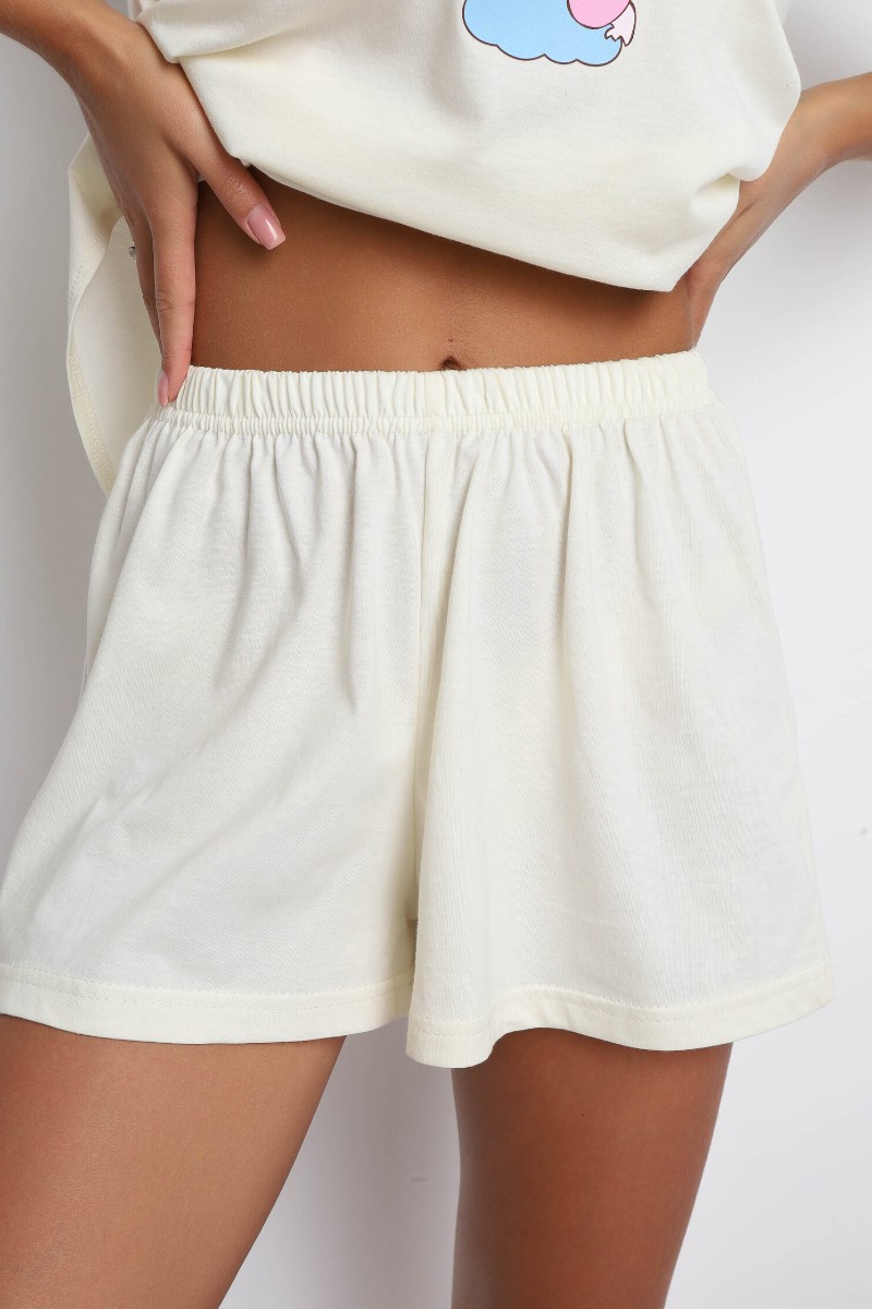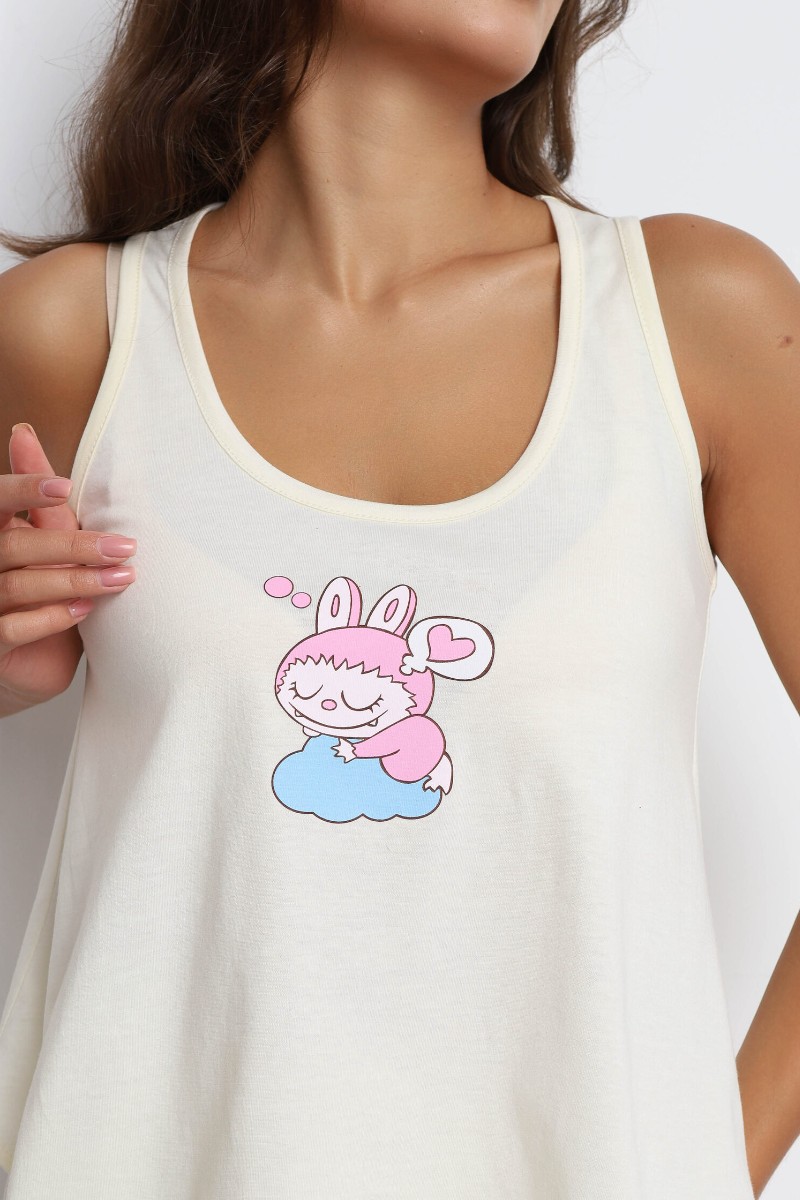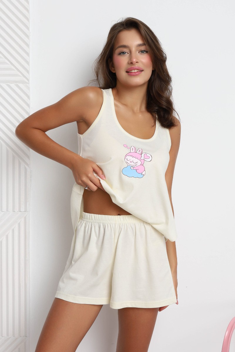 Представляем Вашему вниманию женский домашний костюм - идеальное решение для тех, кто любит комфорт и уют. Костюм из хлопка подарит Вам нежные и мягкие ощущения, а свободный крой позволит свободно двигаться дома. Комплект пижамы - это идеальный выбор для беременных и кормящих мам. Комплект включает в себя майку с принтом лабубу и шорты на резинке.