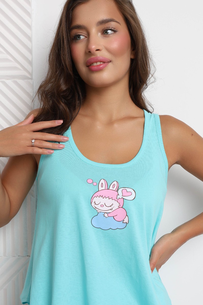 Представляем Вашему вниманию женский домашний костюм - идеальное решение для тех, кто любит комфорт и уют. Костюм из хлопка подарит Вам нежные и мягкие ощущения, а свободный крой позволит свободно двигаться дома. Комплект пижамы - это идеальный выбор для беременных и кормящих мам. Комплект включает в себя майку с принтом лабубу и шорты на резинке.
