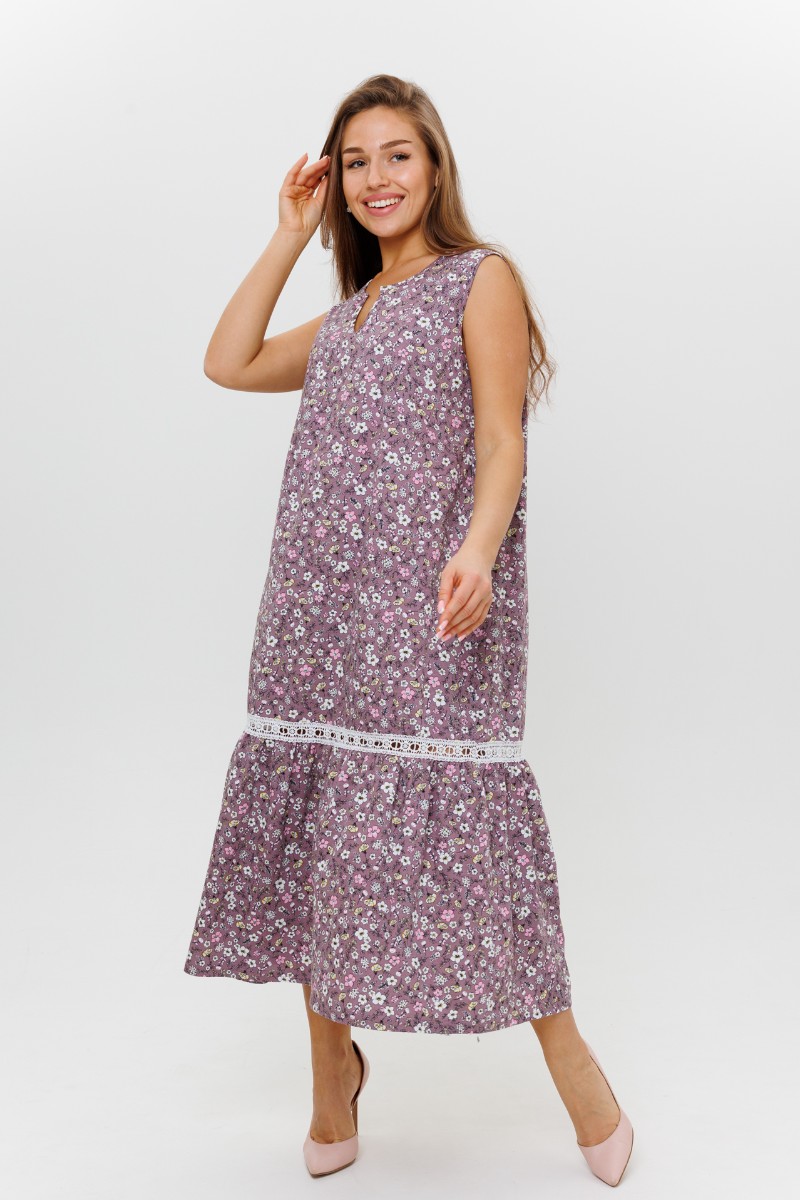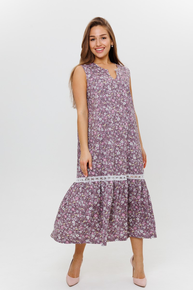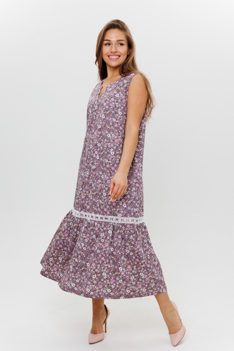 Представляем Вашему вниманию сарафан свободного кроя. Горловина круглая с V-образной капелькой. Горловина и пройма окантованы. Низ изделия завершен широкой оборкой. Оборка декорирована хлопковым кружевом. Длина изделия ниже колена. Красивый мелкоцветочный рисунок полотна. Сарафан очень удобен и комфортен для жаркой погоды. При желании Вы можете добавить аксессуары: пояс, бусы, браслет.