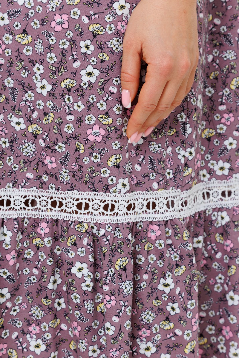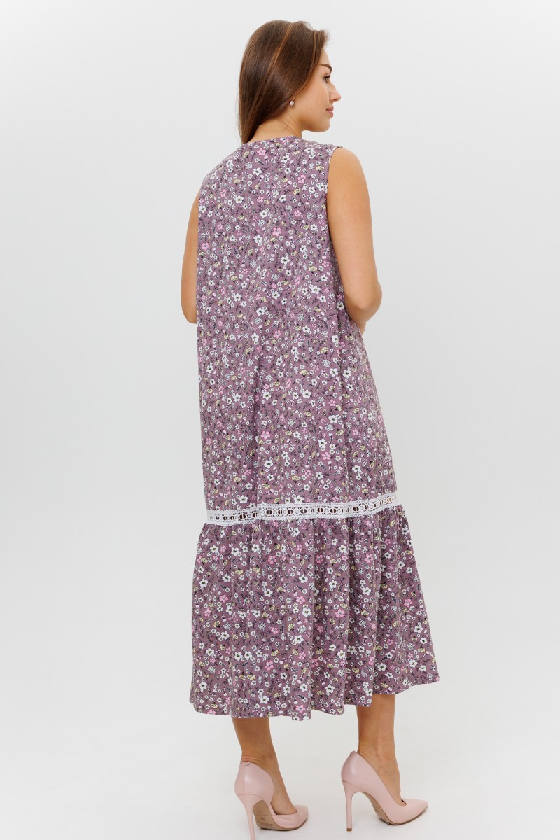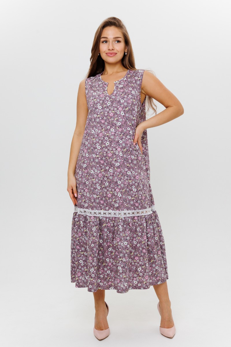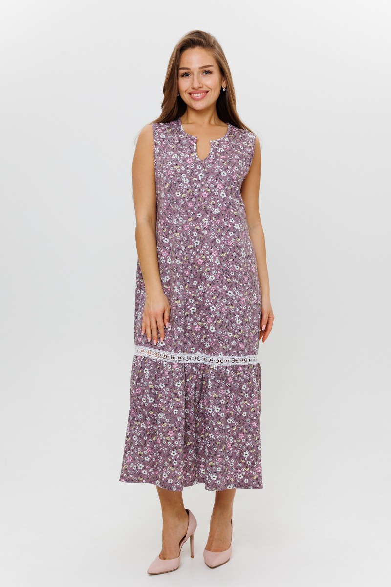 Представляем Вашему вниманию сарафан свободного кроя. Горловина круглая с V-образной капелькой. Горловина и пройма окантованы. Низ изделия завершен широкой оборкой. Оборка декорирована хлопковым кружевом. Длина изделия ниже колена. Красивый мелкоцветочный рисунок полотна. Сарафан очень удобен и комфортен для жаркой погоды. При желании Вы можете добавить аксессуары: пояс, бусы, браслет.