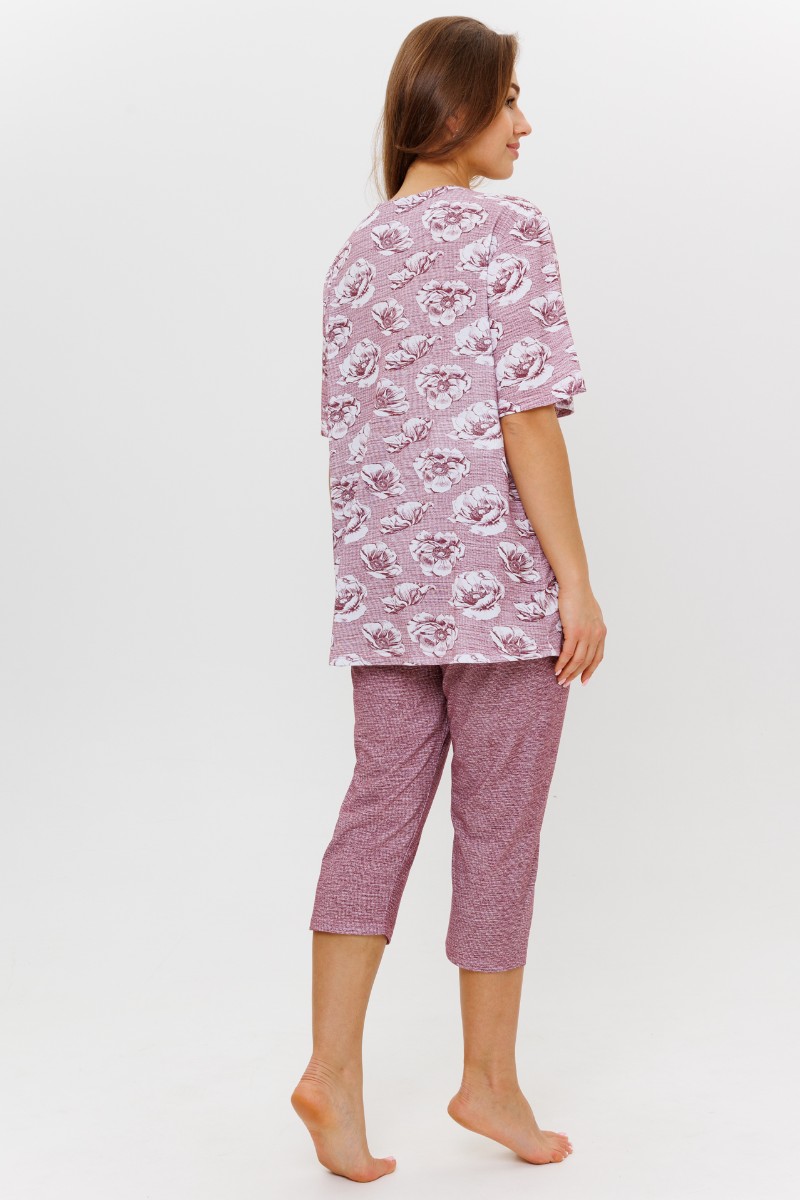 Представляем Вашему вниманию легкую женскую пижаму с бриджами. Комплект имеет элегантную расцветку, которая интересно смотрится и поднимает настроение. Изделие красиво сидит на фигуре и подчеркивает её достоинства. В ней Ваш сон будет максимально приятным и расслабляющим.