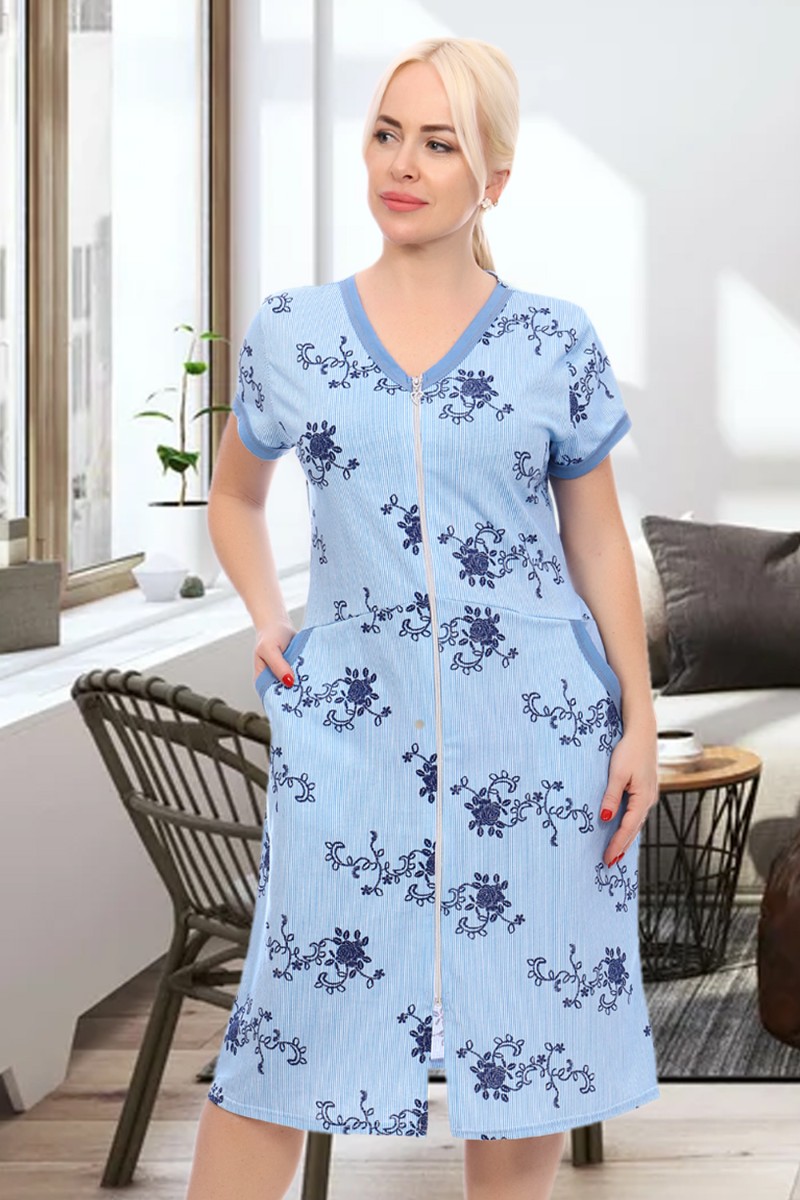 Представляем Вашему вниманию милый и удобный домашний халат на молнии. Короткий рукав, с карманами, отделка контрастной тканью на рукавах, горловине и карманах. Декоративная молния, на талии подрез. В этом халате Вы будете чувствовать себя комфортно и привлекательно.