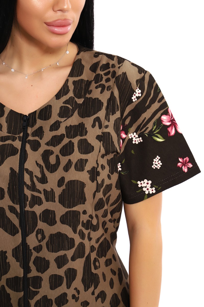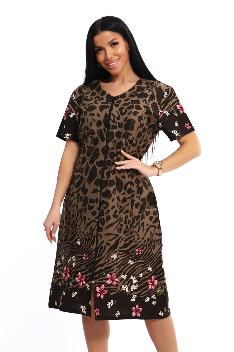 Представляем Вашему вниманию уютный и удобный домашний женский халат из легкой хлопковой ткани создан для настоящих ценительниц качества и стиля! Это именно та домашняя одежда, в которой комфортно готовить еду, заниматься уборкой, стиркой и прочими бытовыми делами. Дизайн ткани представляет собой комбинацию принта с ярким цветочным рисунком, переходящим в модную леопардовую расцветку. Халат застегивается на молнию, поясок завязывается сзади. Короткий рукав позволяет носить халат в жаркое время года дома и на даче.