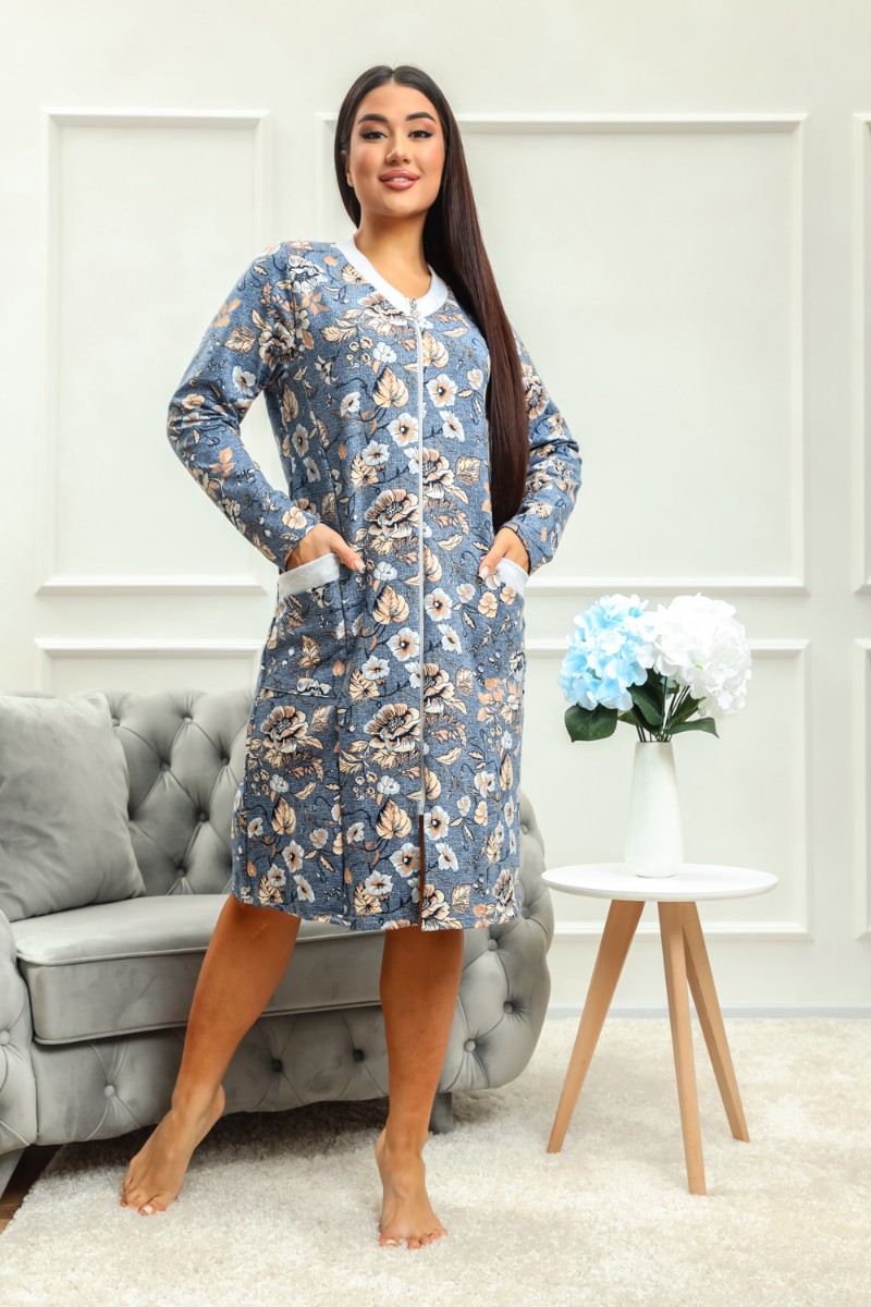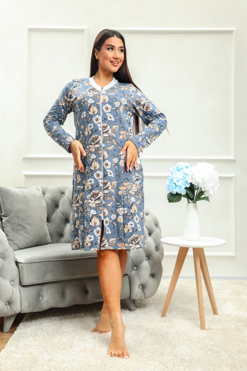 Представляем Вашему вниманию халат домашний на серебристой молнии, выполнен из ткани футер 2-нитка качества пенье. Горловина имеет V-образный вырез, отделана, как и карманы, тканью контрастного цвета, рукав длинный. Халат идеально подойдет для дома и отдыха.