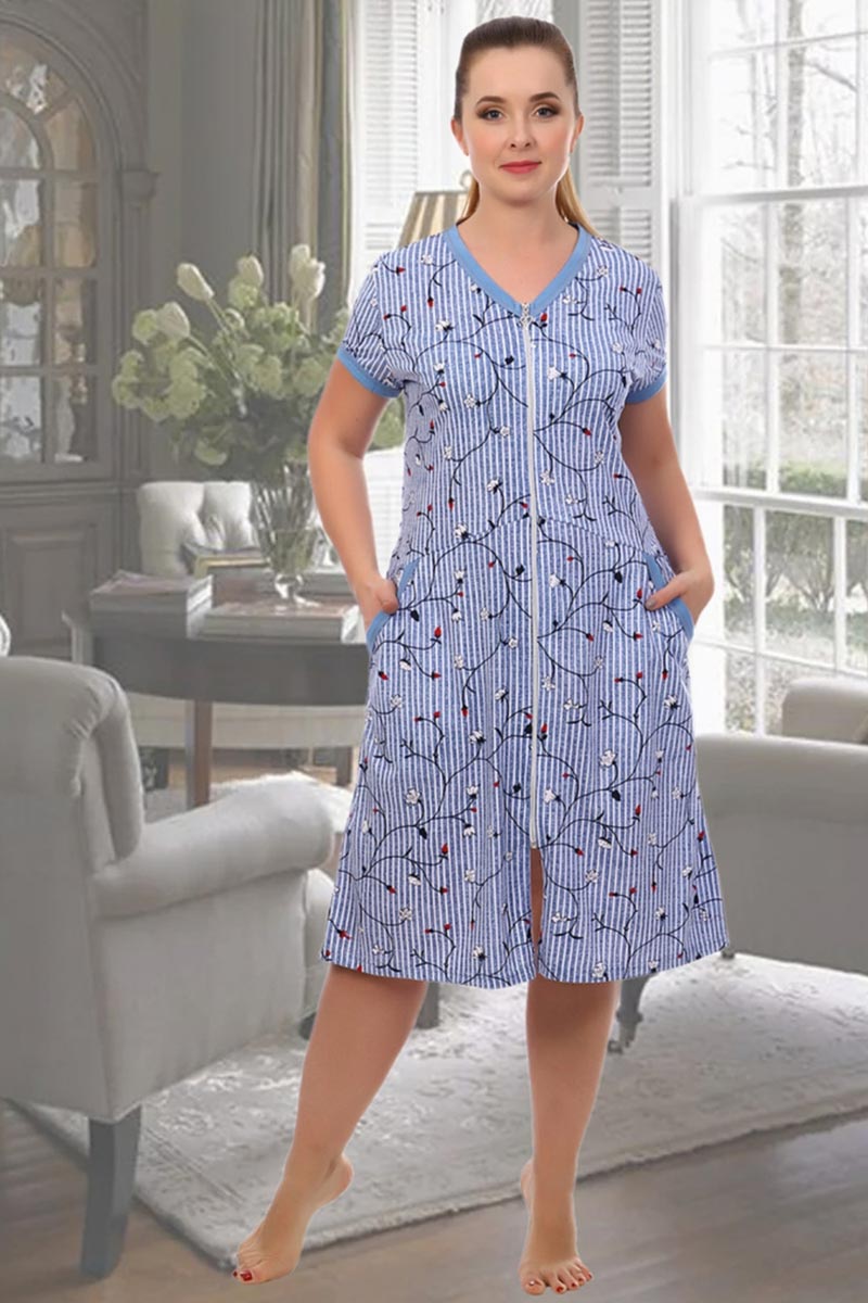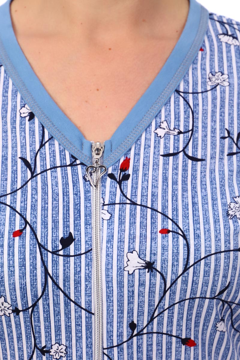 Представляем Вашему вниманию милый и удобный домашний халат на молнии. Короткий рукав, с карманами, отделка контрастной тканью на рукавах, горловине и карманах. Декоративная молния, на талии подрез. В этом халате Вы будете чувствовать себя комфортно и привлекательно.
