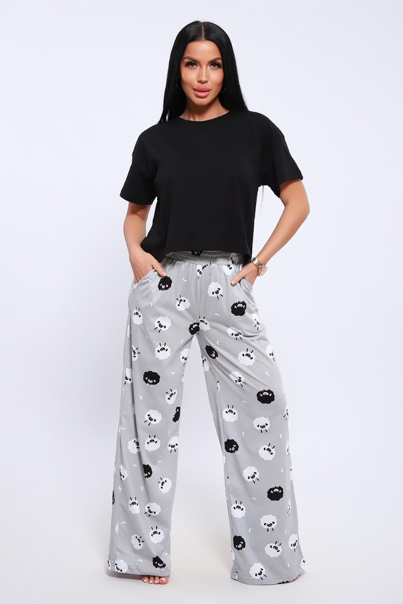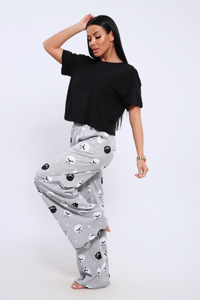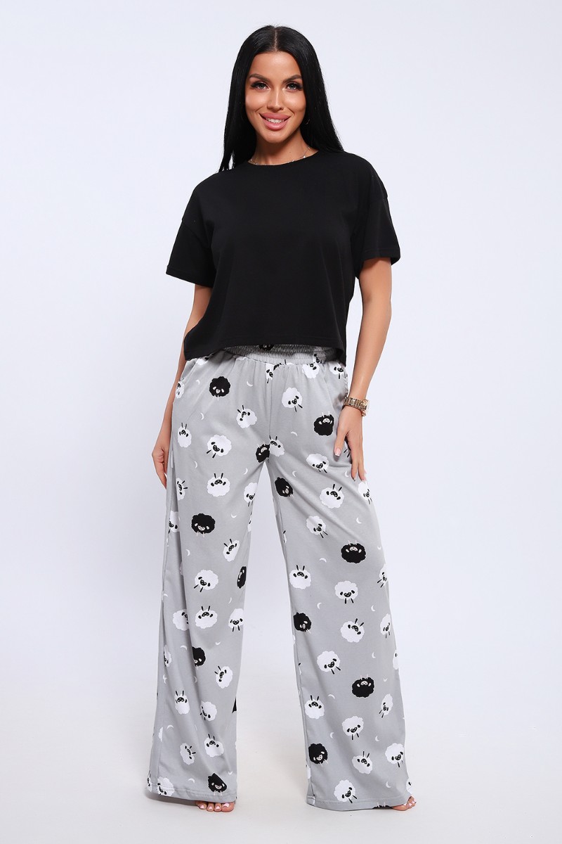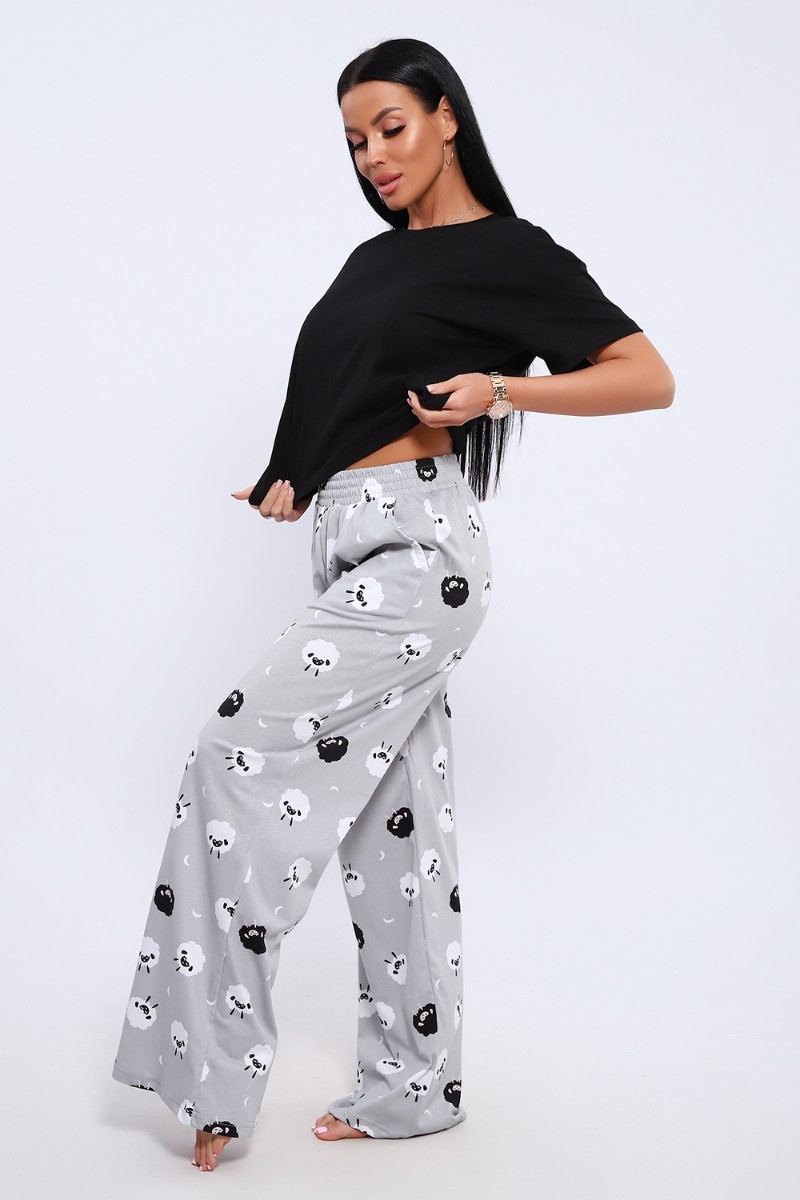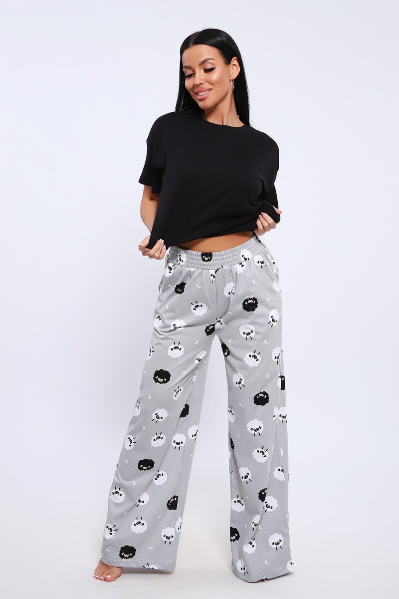 Представляем Вашему вниманию домашнюю женскую пижаму их мягкого хлопка. Свободная футболка прямого кроя, со смещенными плечевыми швами. Вырез горловины округлой формы с обтачкой. Длина футболки укорочена выше линии бедер, что является трендом сезона. Широкие брюки прямого кроя с высокой посадкой, с вместительными боковыми карманами, пояс на резинке с декоративной отстрочкой и атласным милым бантиком. Длина брюк стандартна, чуть ниже щиколотки.
