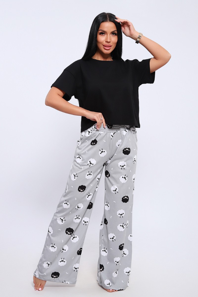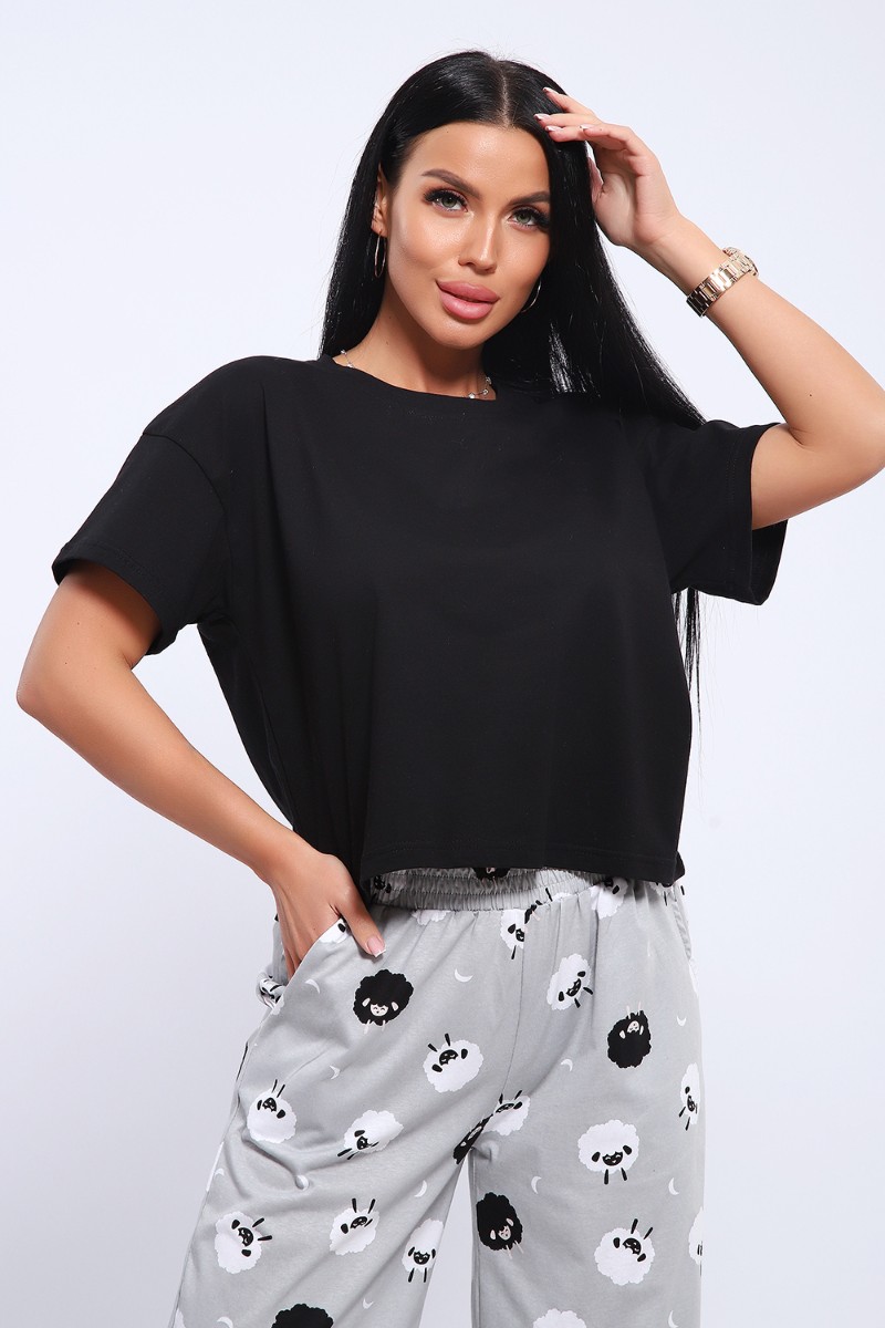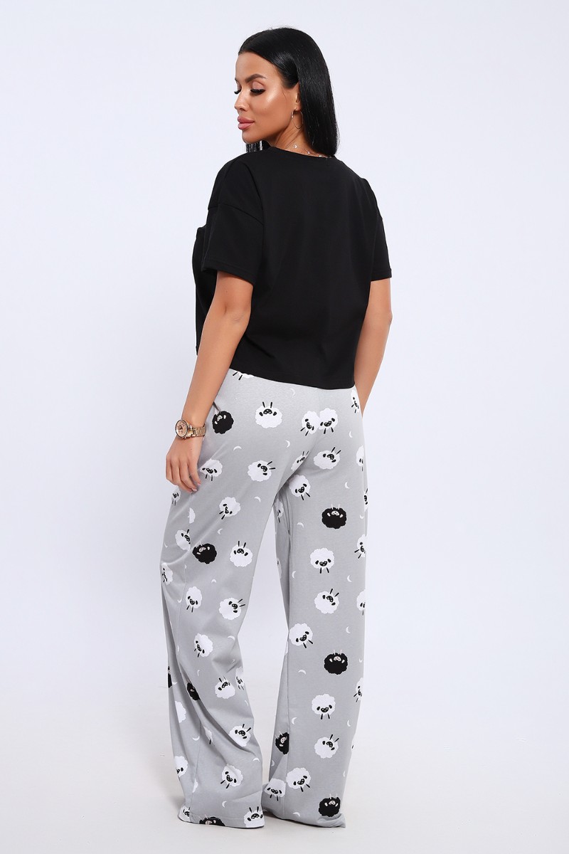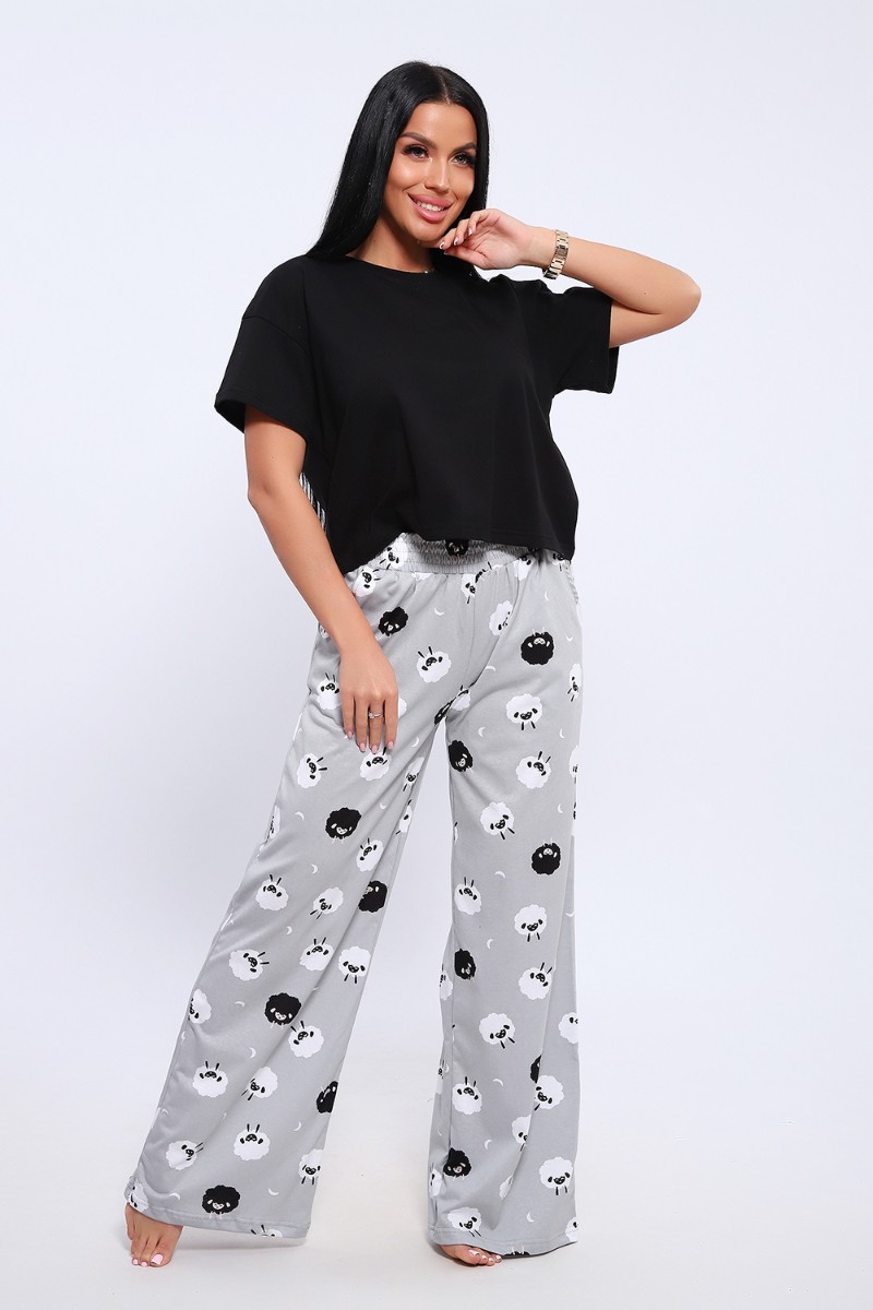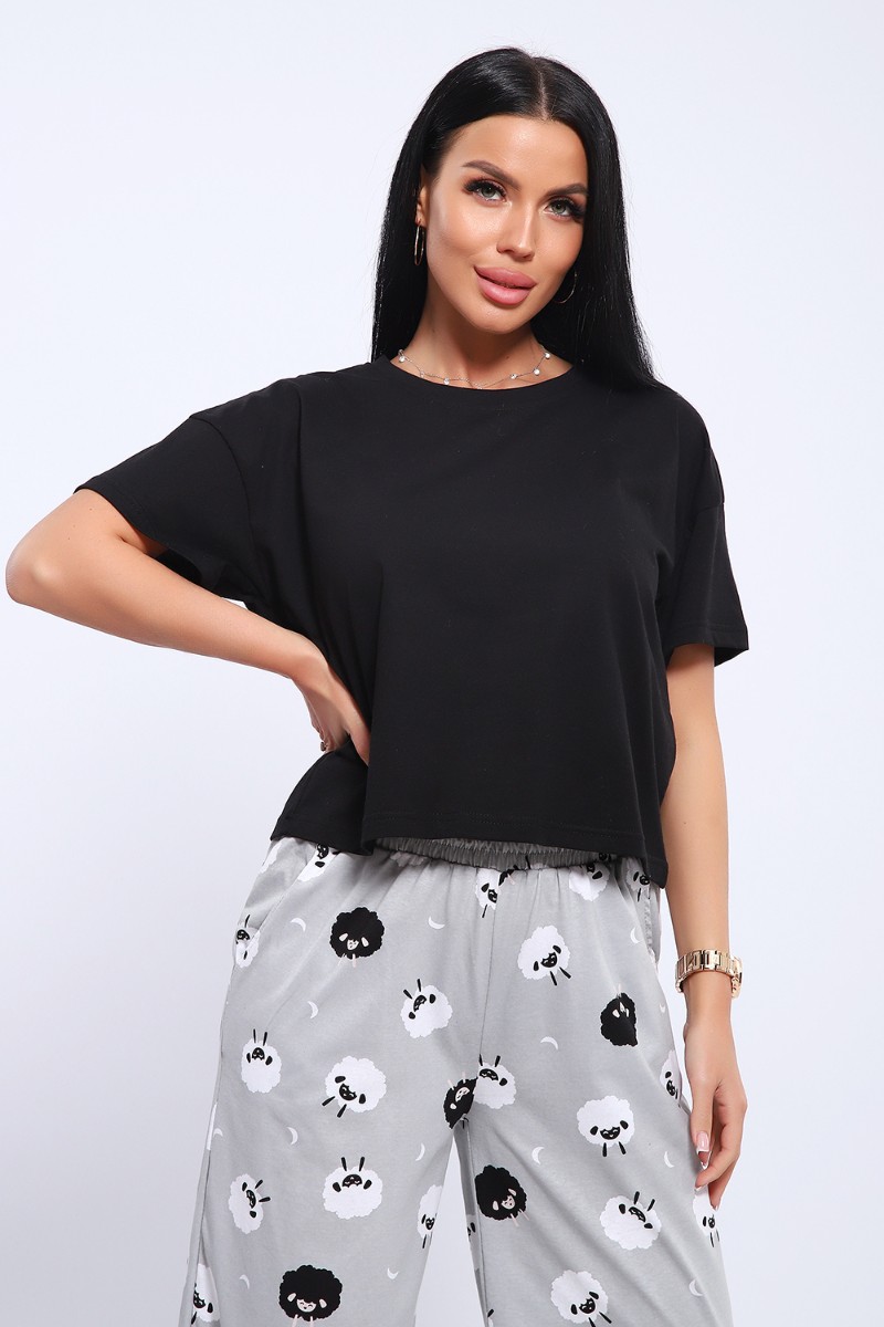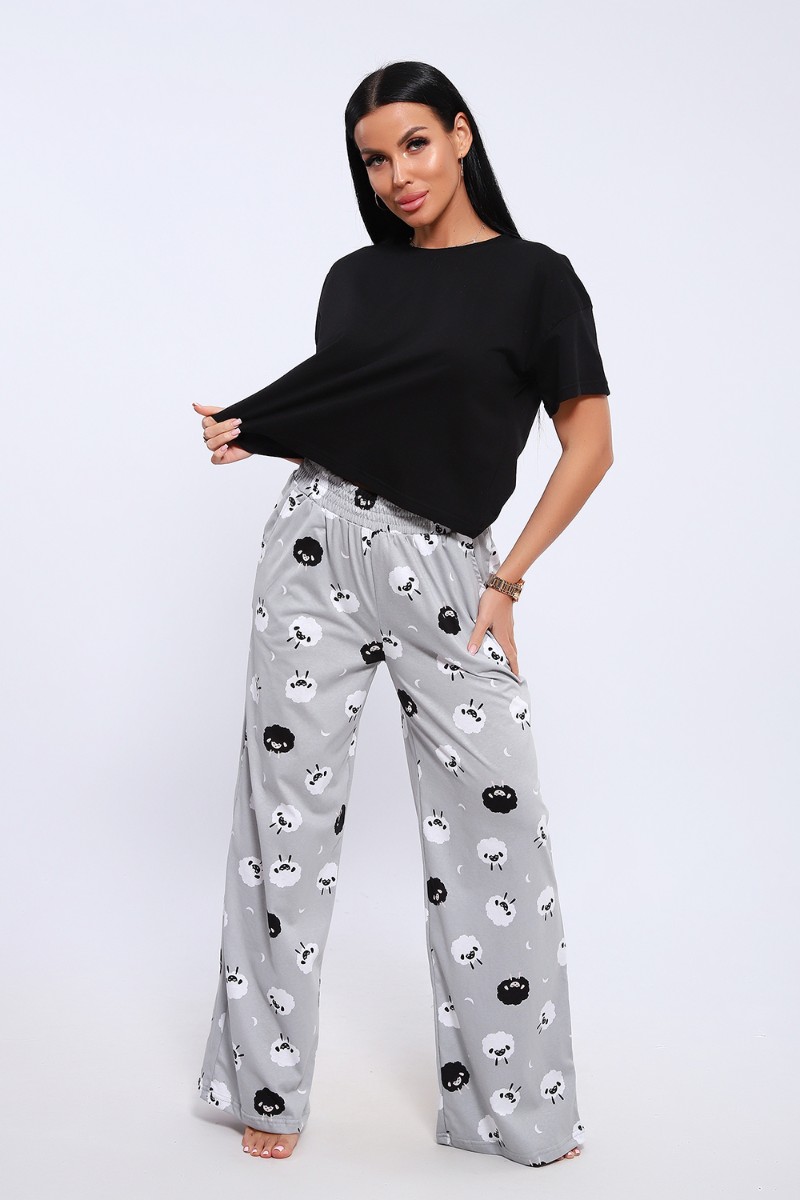 Представляем Вашему вниманию домашнюю женскую пижаму их мягкого хлопка. Свободная футболка прямого кроя, со смещенными плечевыми швами. Вырез горловины округлой формы с обтачкой. Длина футболки укорочена выше линии бедер, что является трендом сезона. Широкие брюки прямого кроя с высокой посадкой, с вместительными боковыми карманами, пояс на резинке с декоративной отстрочкой и атласным милым бантиком. Длина брюк стандартна, чуть ниже щиколотки.