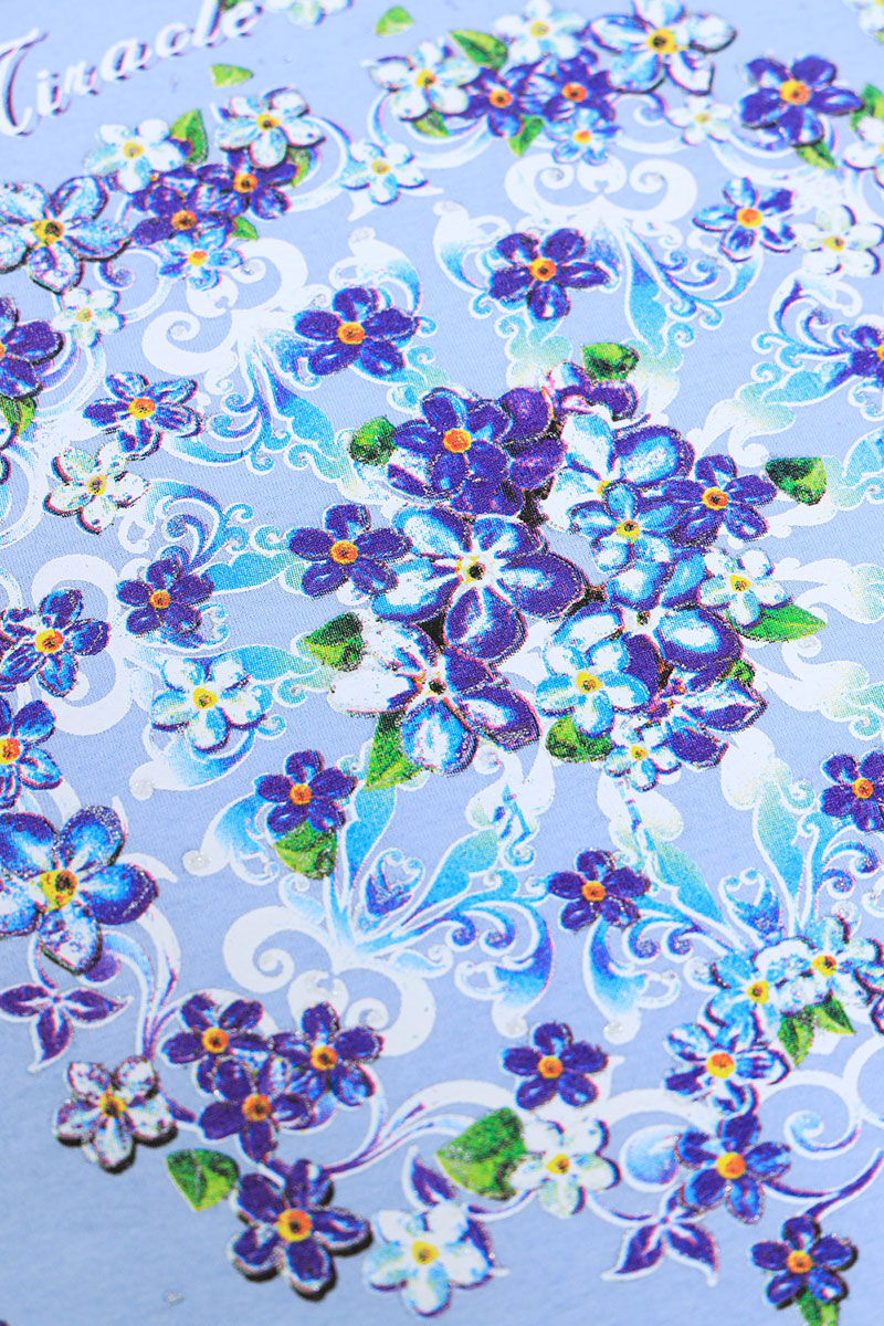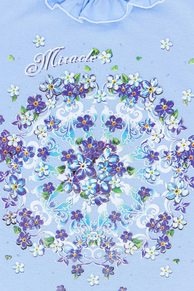 Представляем Вашему вниманию уютную и удобную женскую пижаму с симпатичной рюшей по горловине. Очень свободный и удобный крой. Рукав-реглан не стесняет движение рук. Обработка рукава и низа изделия в виде лёгкой волны придаёт лёгкость и воздушность. Шикарный принт в виде орнамента из россыпи цветов.