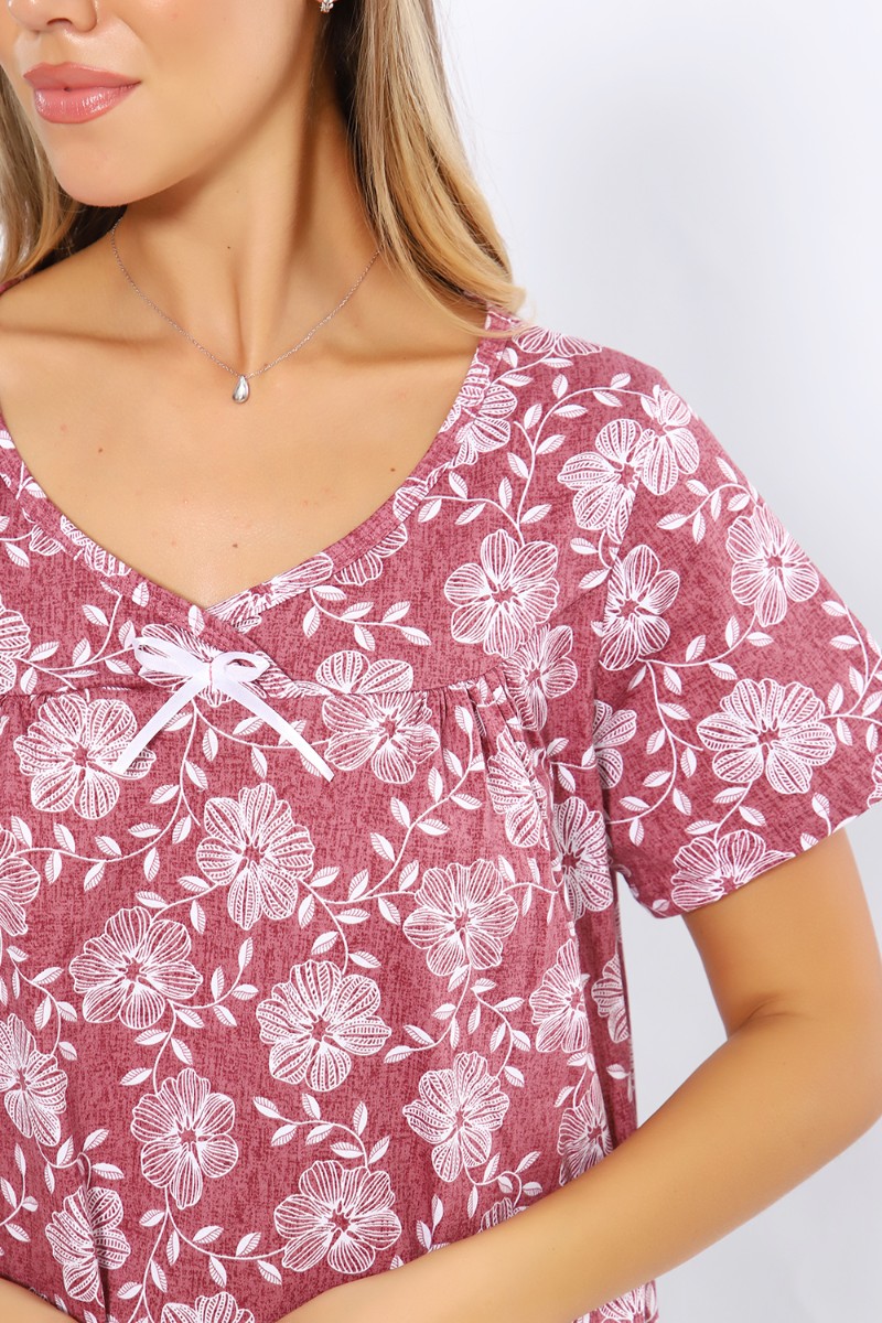 Представляем Вашему вниманию изящную женскую сорочку свободного кроя с короткими рукавами. Полочка с отрезной кокеткой и сборкой над грудью. Вырез декольте украшен бантиком. Комфортна для повседневной носки и сна.