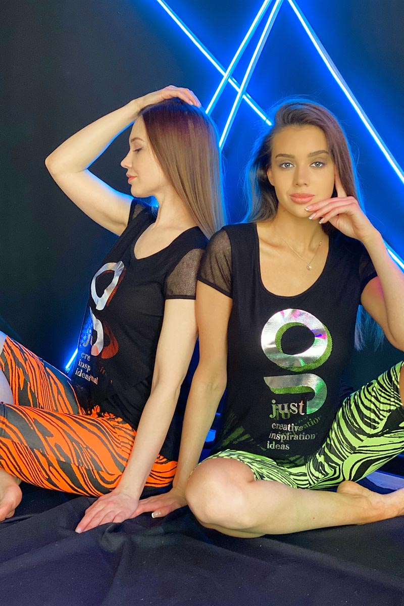 Представляем Вашему вниманию яркую женскую футболку. Футболка полуприлегающего силуэта, с округлой горловиной, длиной до середины бедра, с фигурным низом. Рукав втачной короткий, из сетки. Полочка выполнена из двух полотен, наложенных одно на другое. Верхнее полотно из сетки с принтом. Горловина обработана бейкой из основного полотна.