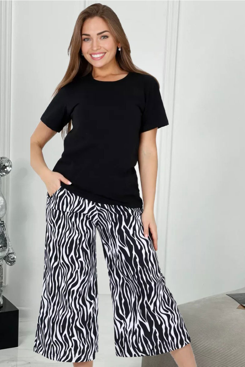 Представляем Вашему вниманию модный стильный костюм - идеальное решение для тех, кто ищет легкую и красивую одежду на каждый день, для дома, спорта и отдыха. Футболка и брюки-кюлоты выполнены из 100% хлопка. Костюм представлен в стильной расцветке, которая дарит хорошее настроение.