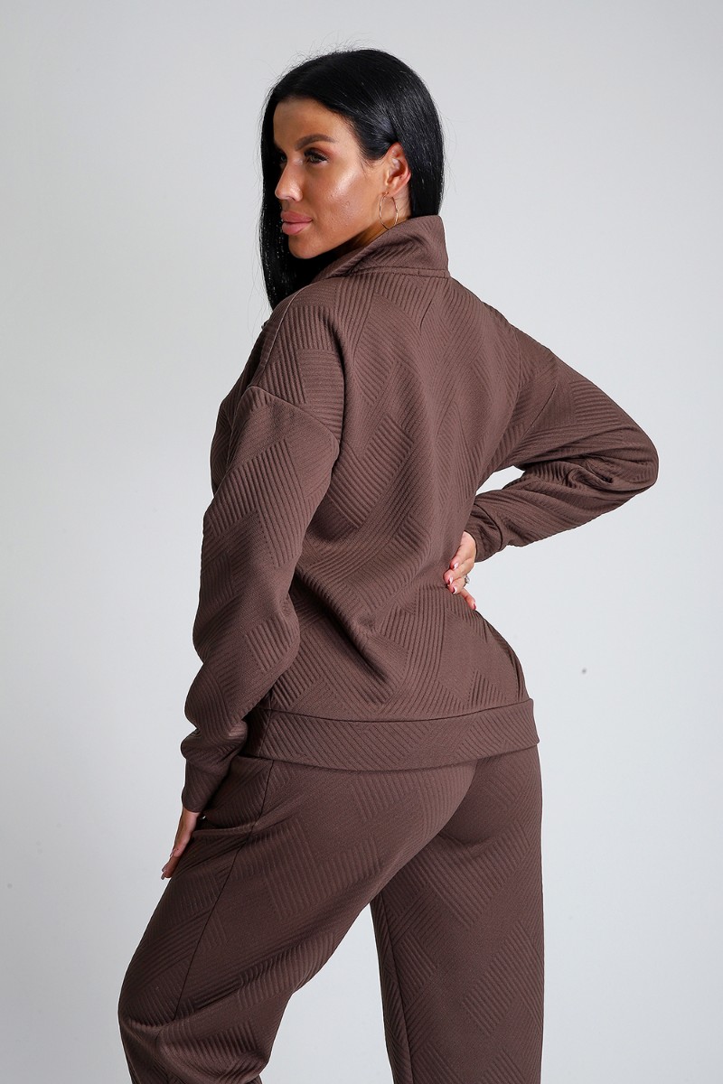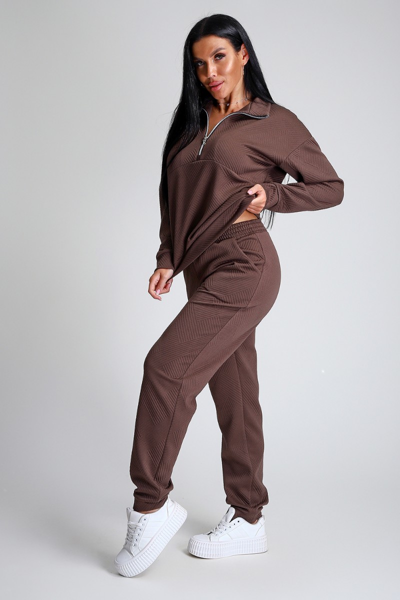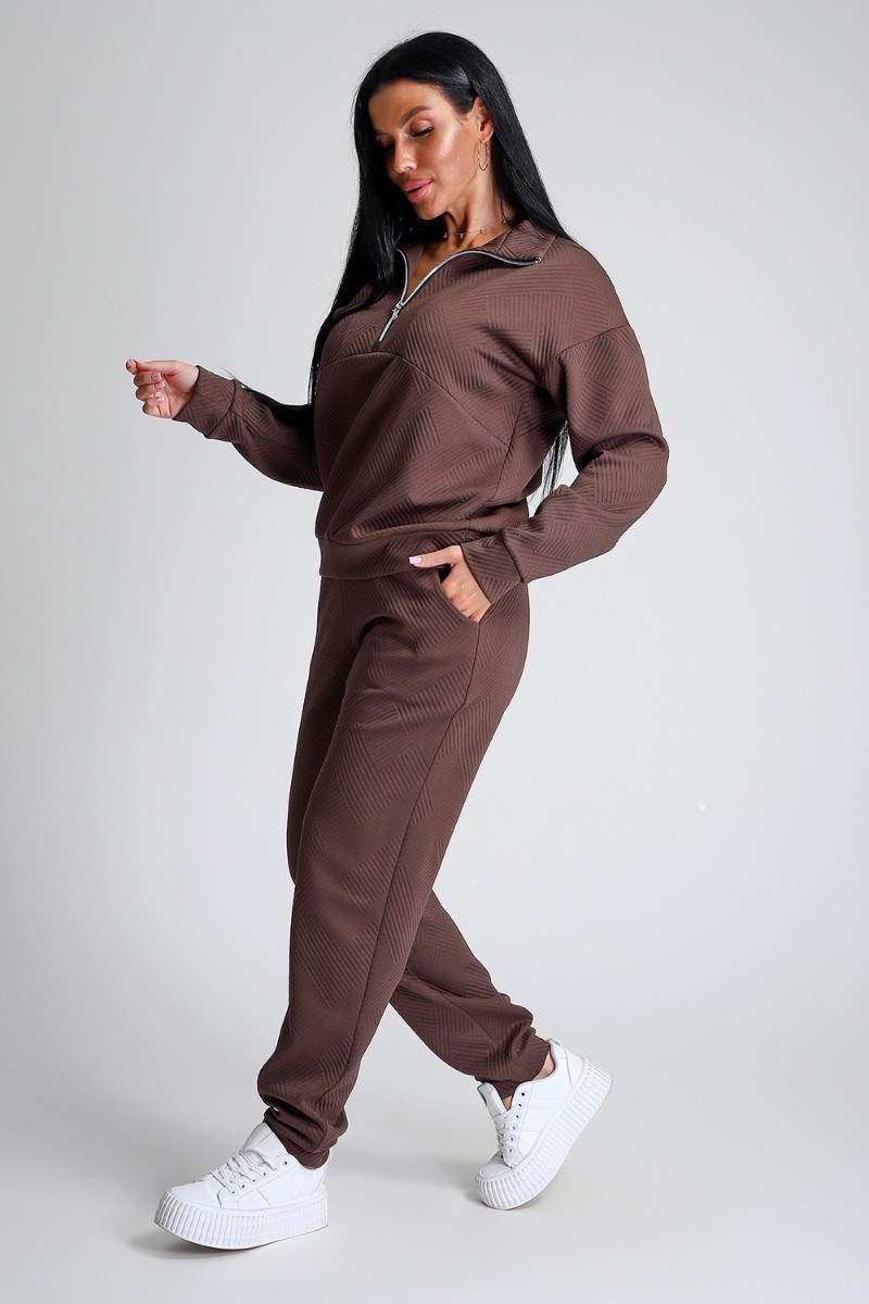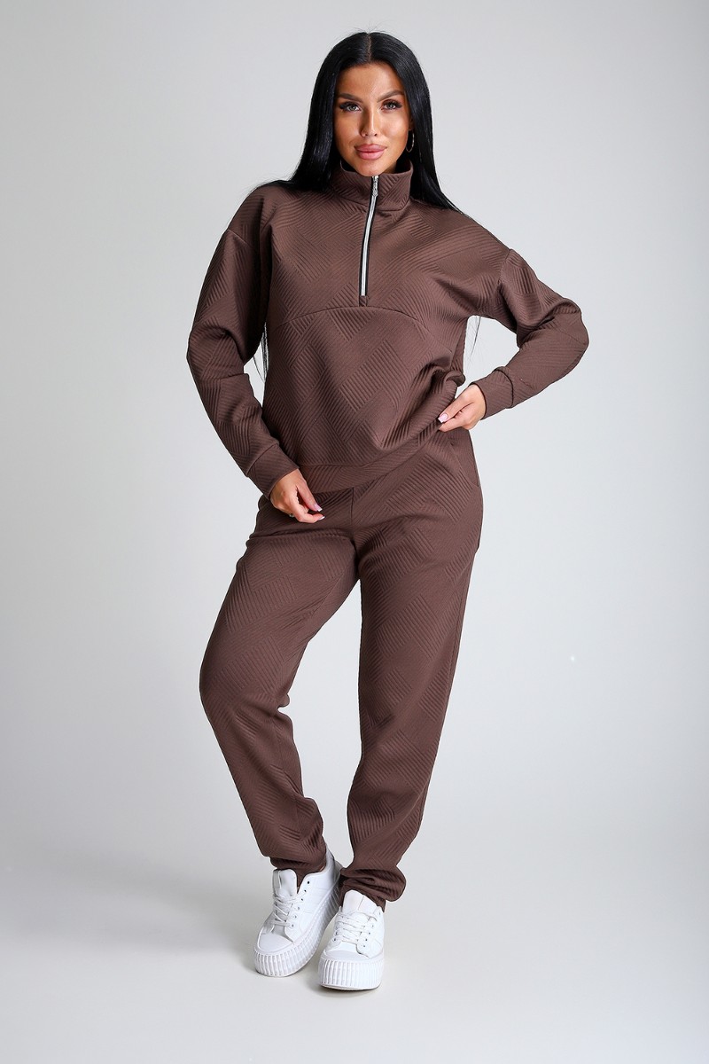 Представляем Вашему вниманию спортивный женский костюм двойку - элегантное и практичное решение для тех, кто ценит удобство, свободу движений и современный модный стиль. Костюм для активных девушек, взрослых женщин и подростков состоит из толстовки и брюк джоггеров. Выполнен костюм из приятного к телу эластичного трикотажа с геометрически рельефной структурой. Модная толстовка свободного кроя, воротник-стойка застегивается на молнию, спущенный рукав обеспечивает свободу движения. Брюки прямого кроя с боковыми карманами, удобный пояс на резинке выполнен на спецмашине, по низу брюк притачные манжеты. Повседневный трендовый костюм подходит для любой фигуры, подчеркивая ваши достоинства, будет идеален на отдыхе, прогулке и на спортивных тренировках.