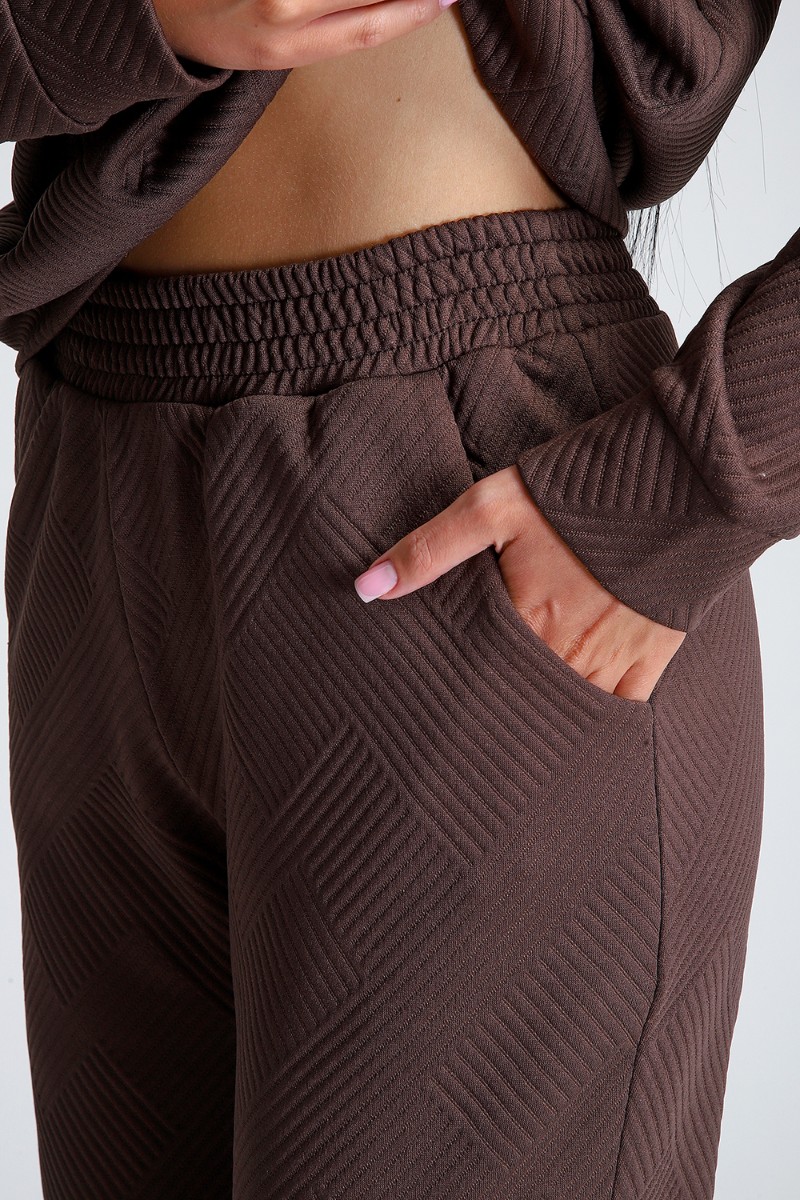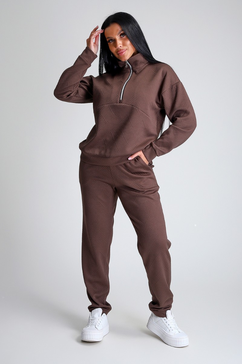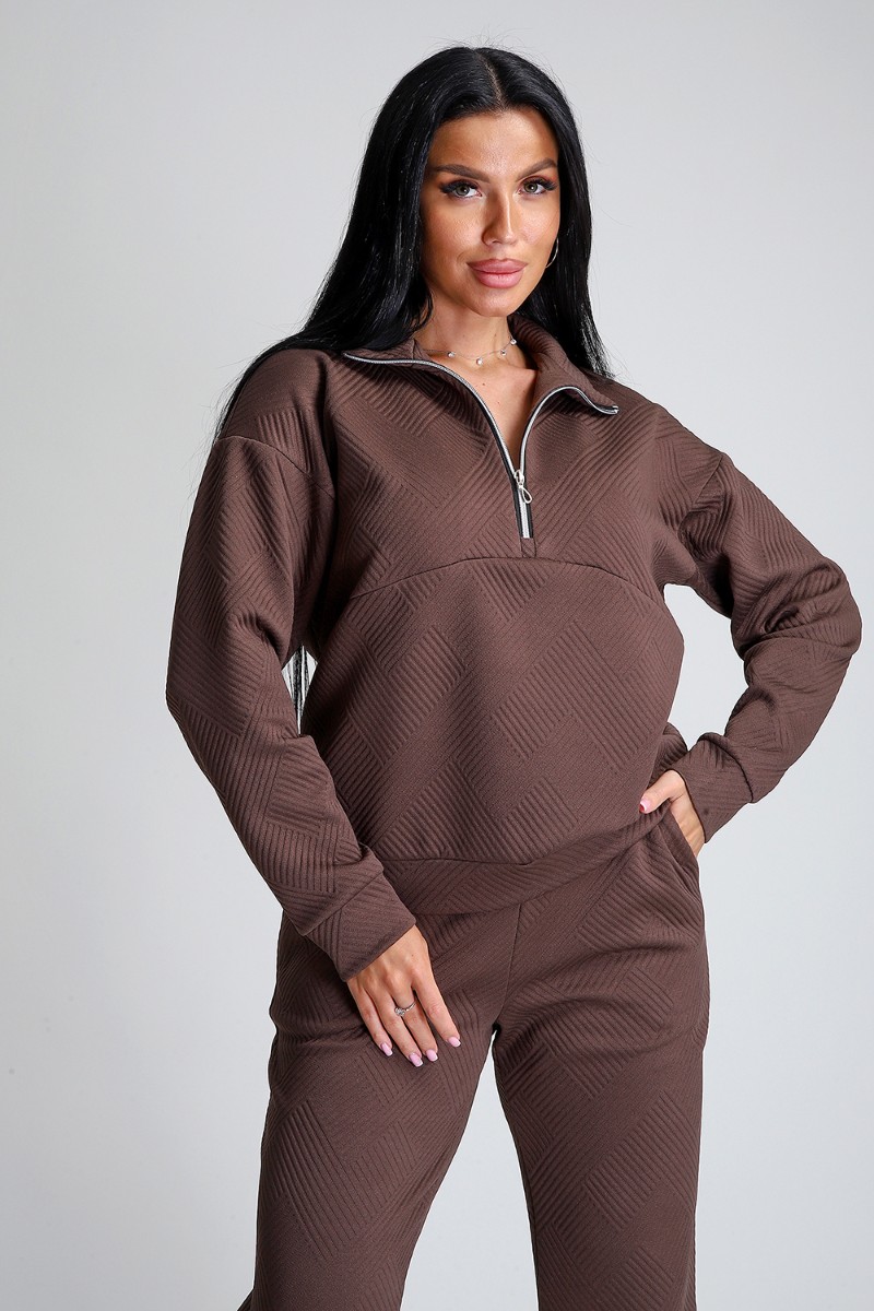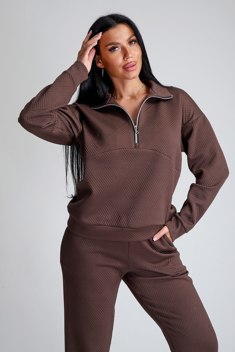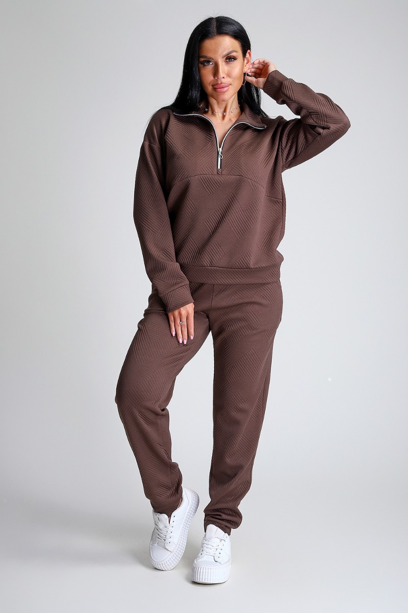 Представляем Вашему вниманию спортивный женский костюм двойку - элегантное и практичное решение для тех, кто ценит удобство, свободу движений и современный модный стиль. Костюм для активных девушек, взрослых женщин и подростков состоит из толстовки и брюк джоггеров. Выполнен костюм из приятного к телу эластичного трикотажа с геометрически рельефной структурой. Модная толстовка свободного кроя, воротник-стойка застегивается на молнию, спущенный рукав обеспечивает свободу движения. Брюки прямого кроя с боковыми карманами, удобный пояс на резинке выполнен на спецмашине, по низу брюк притачные манжеты. Повседневный трендовый костюм подходит для любой фигуры, подчеркивая ваши достоинства, будет идеален на отдыхе, прогулке и на спортивных тренировках.