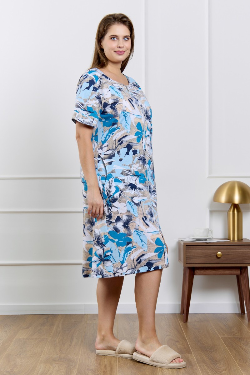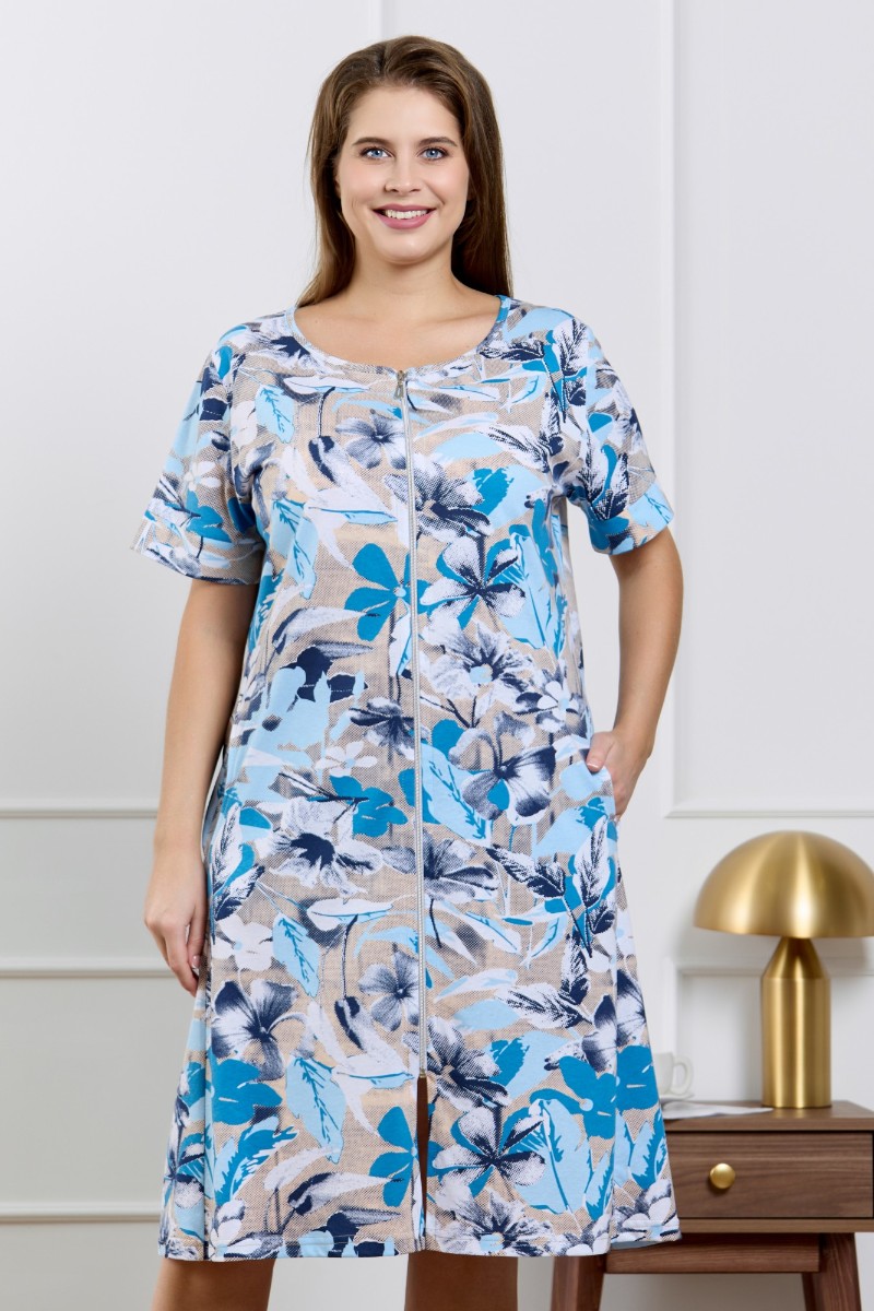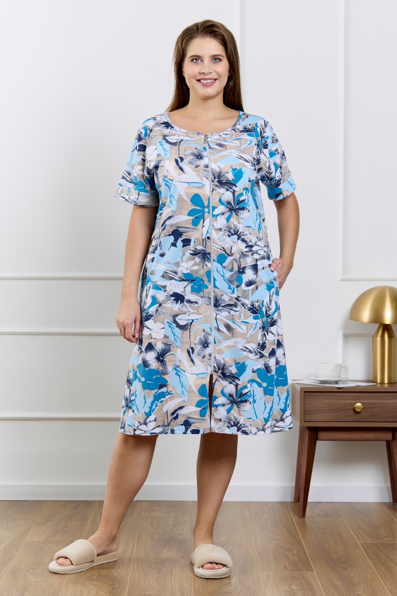 Представляем Вашему вниманию халат женский из трикотажного полотна кулирка с набивным рисунком, прямого силуэта, с короткими втачными рукавами, обработанными манжетами, бортовой застежкой на тесьму «молния» и карманами в боковых швах. Горловина овальной формы окантована основным материалом.