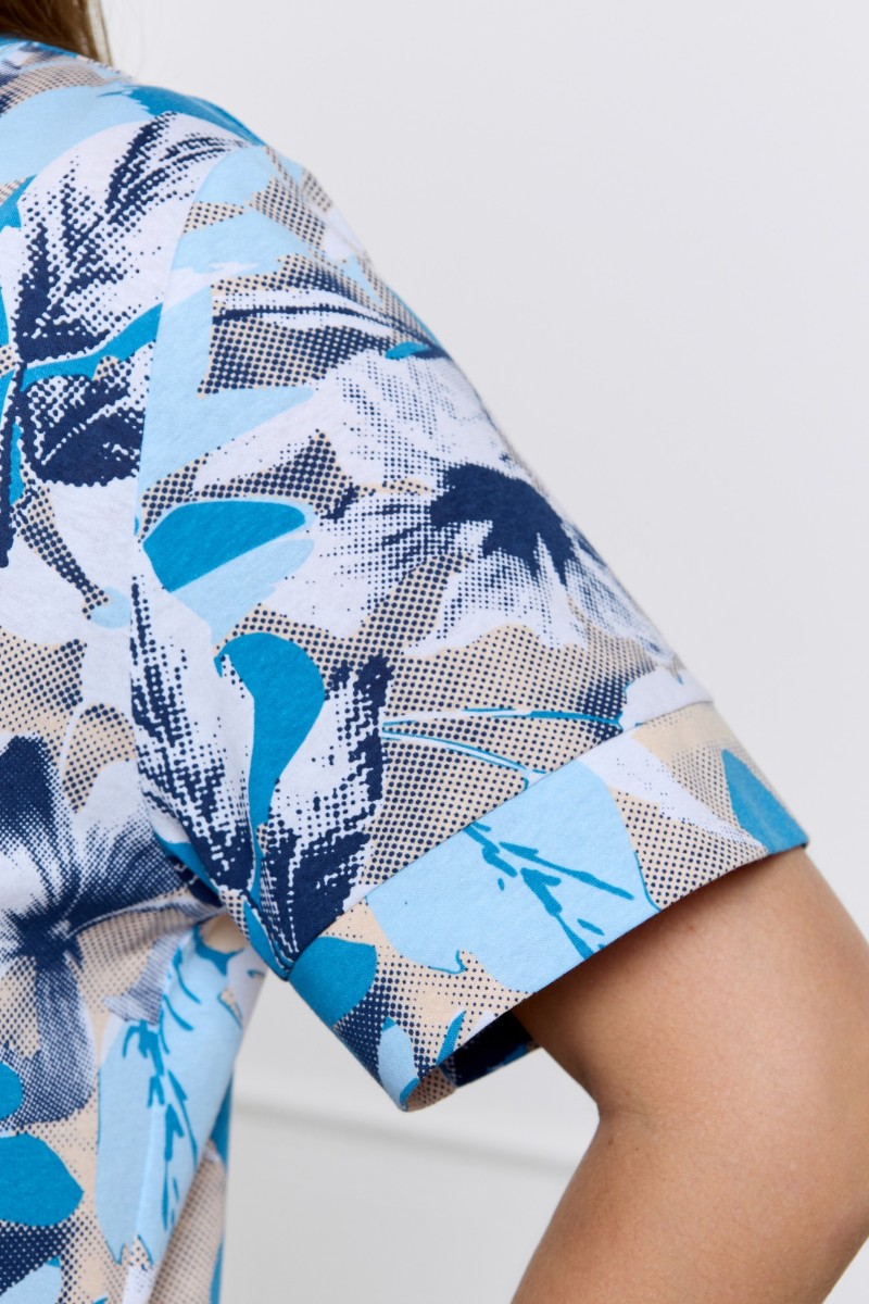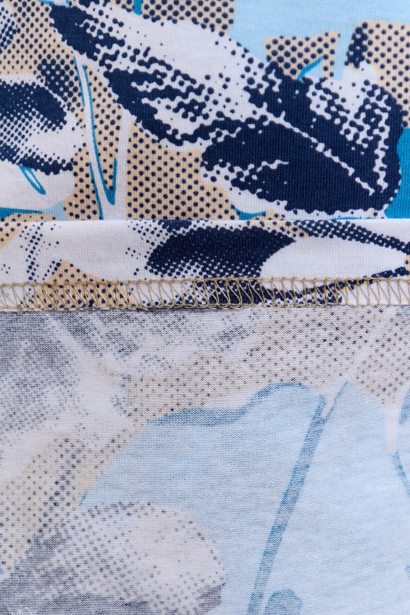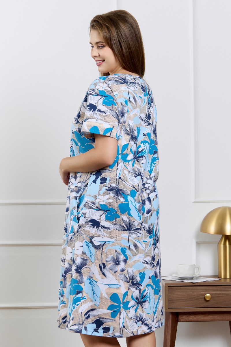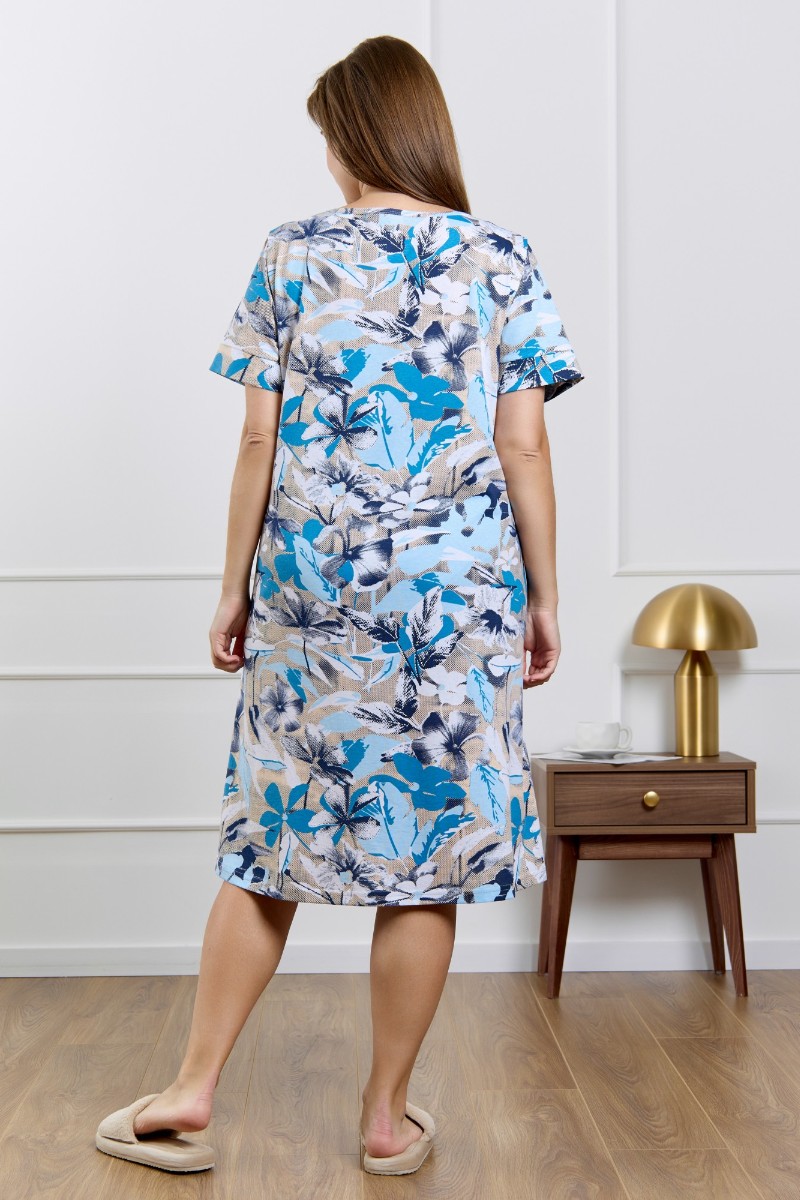 Представляем Вашему вниманию халат женский из трикотажного полотна кулирка с набивным рисунком, прямого силуэта, с короткими втачными рукавами, обработанными манжетами, бортовой застежкой на тесьму «молния» и карманами в боковых швах. Горловина овальной формы окантована основным материалом.