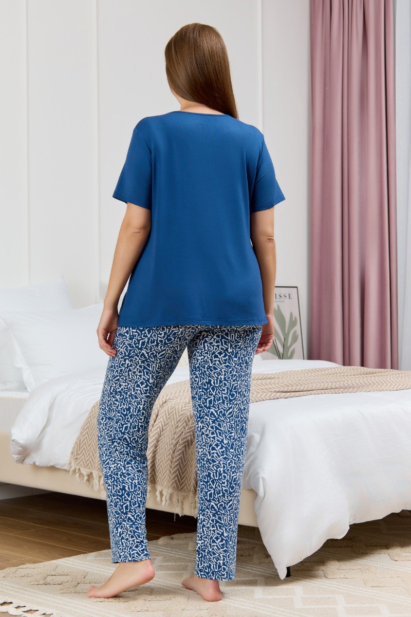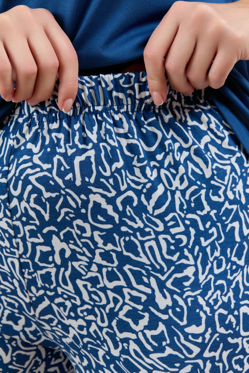 Представляем Вашему вниманию костюм женский из трикотажного вискозного полотна в комбинации двух видов тканей: гладкокрашеной и с набивным рисунком, состоящий из футболки и брюк. Футболка – из гладкокрашеного полотна с короткими втачными рукавами, V-образной горловиной, окантованной основным материалом и принтом на полочке, выполненным в технике «шелкографии».Брюки — из полотна с набивным рисунком, прилегающего силуэта, с эластичной тесьмой по талии.