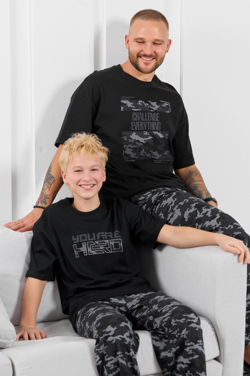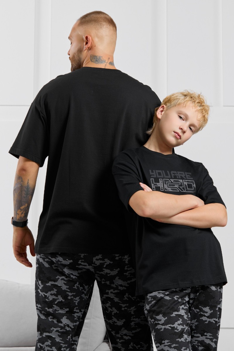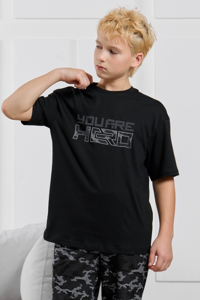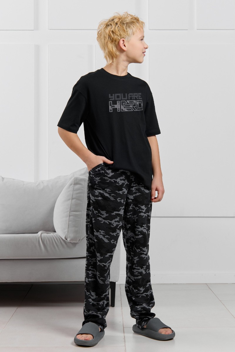 Представляем Вашему вниманию костюм для мальчика, состоящий из футболки и брюк. Футболка однотонная с принтом на груди; модель свободная, со спущенной линией плеч, овальным вырезом горловины. Брюки из полотна с набивным рисунком эксклюзивного дизайна, прямые, с боковыми карманами с обтачными входами, на притачном поясе с отстроченной эластичной тесьмой.