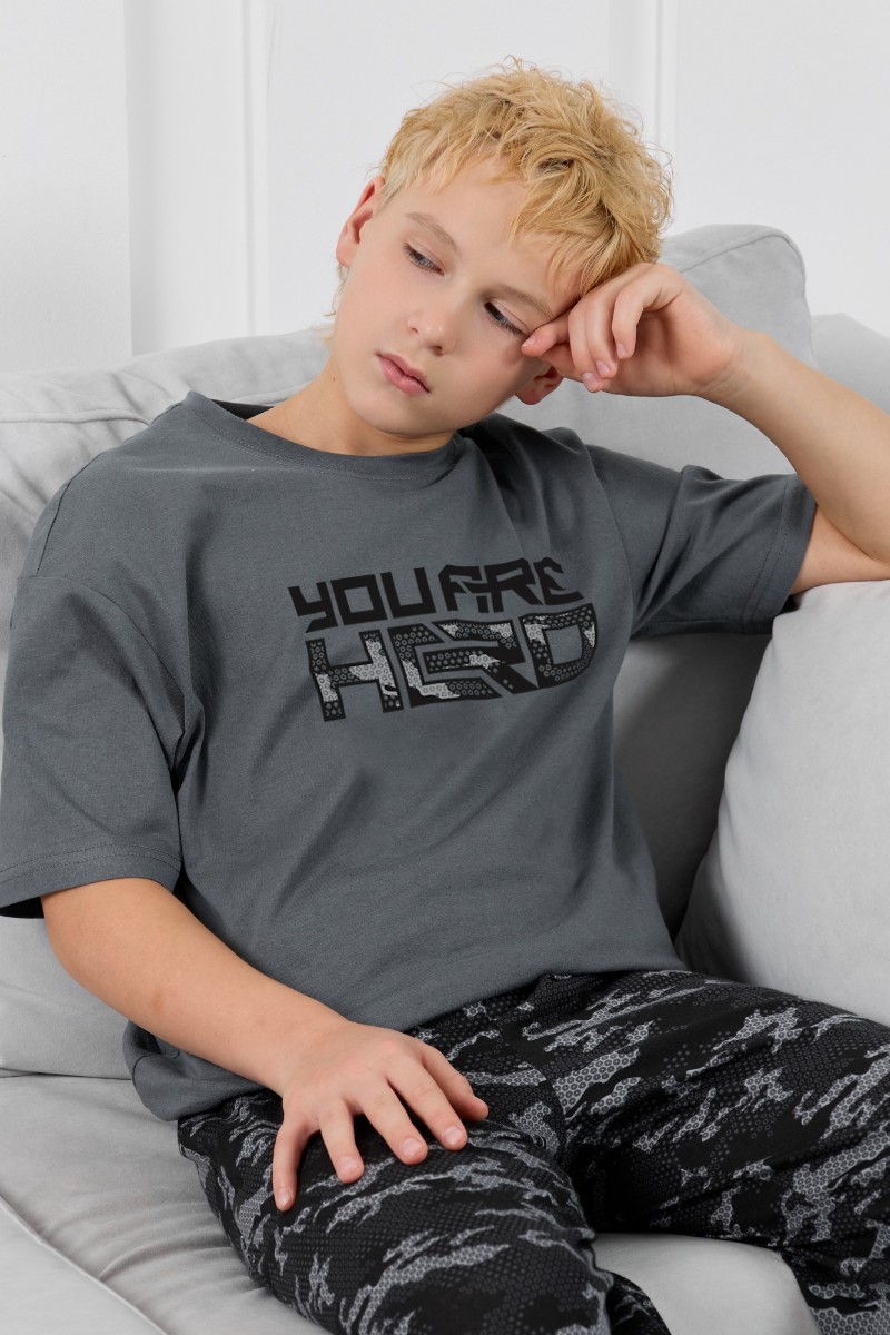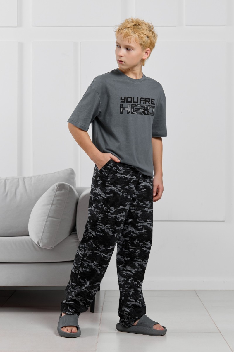 Представляем Вашему вниманию костюм для мальчика, состоящий из футболки и брюк. Футболка однотонная с принтом на груди; модель свободная, со спущенной линией плеч, овальным вырезом горловины. Брюки из полотна с набивным рисунком эксклюзивного дизайна, прямые, с боковыми карманами с обтачными входами, на притачном поясе с отстроченной эластичной тесьмой.