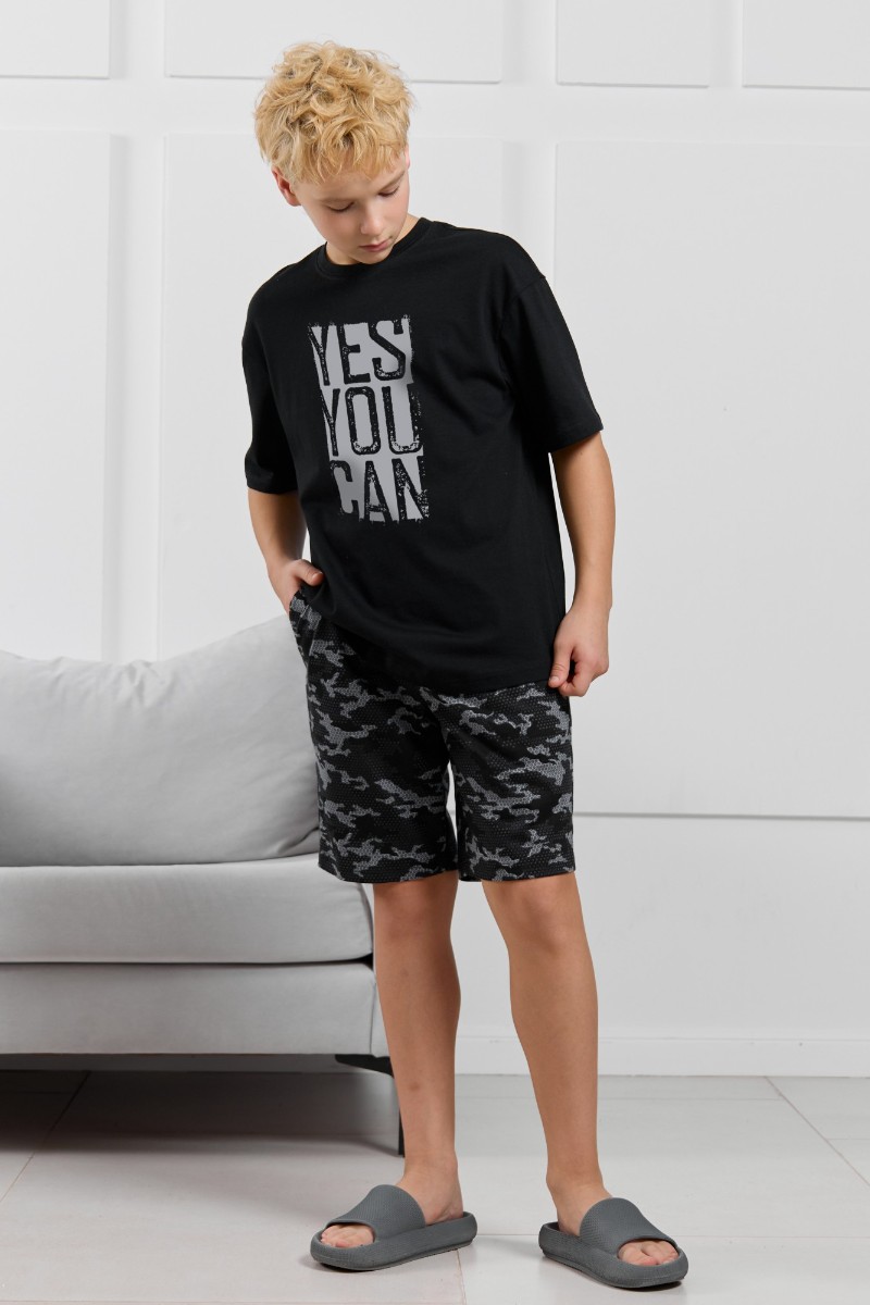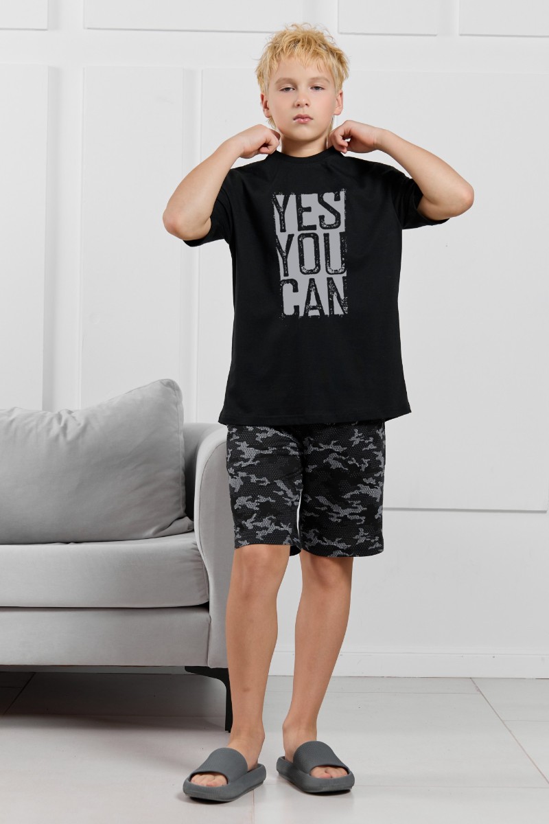 Представляем Вашему вниманию костюм для мальчика, состоящий из футболки и шорт. Футболка однотонная с принтом на груди; модель свободная, со спущенной линией плеч. Шорты из полотна с набивным рисунком эксклюзивного дизайна, с боковыми карманами с обтачными входами, на притачном поясе с отстроченной эластичной тесьмой.