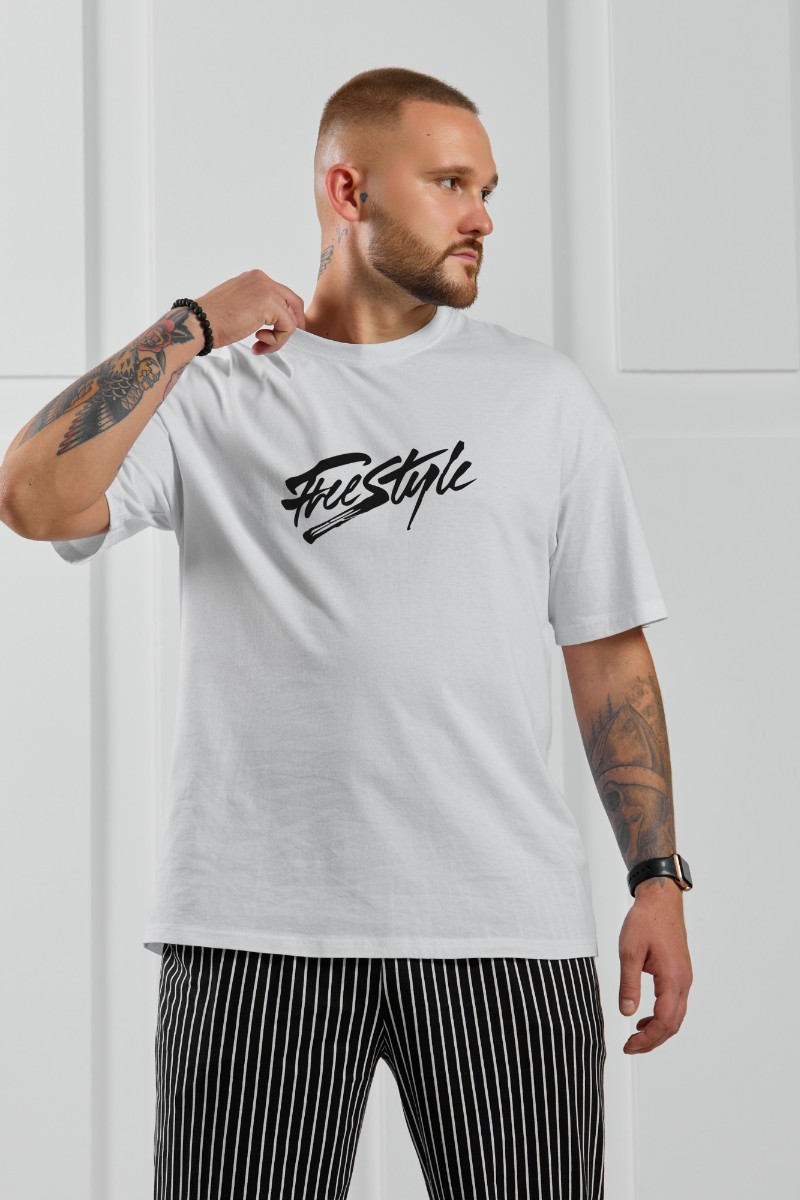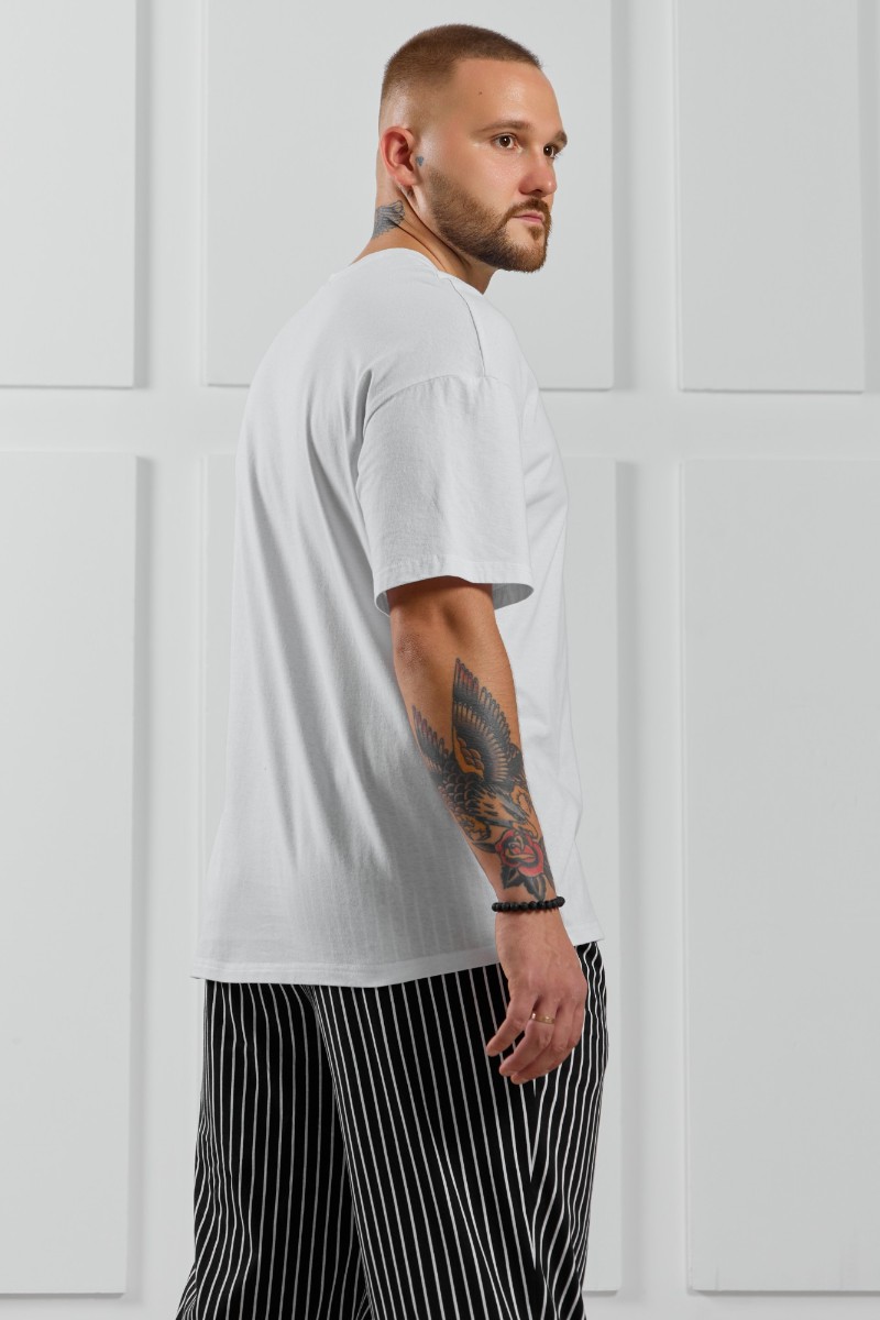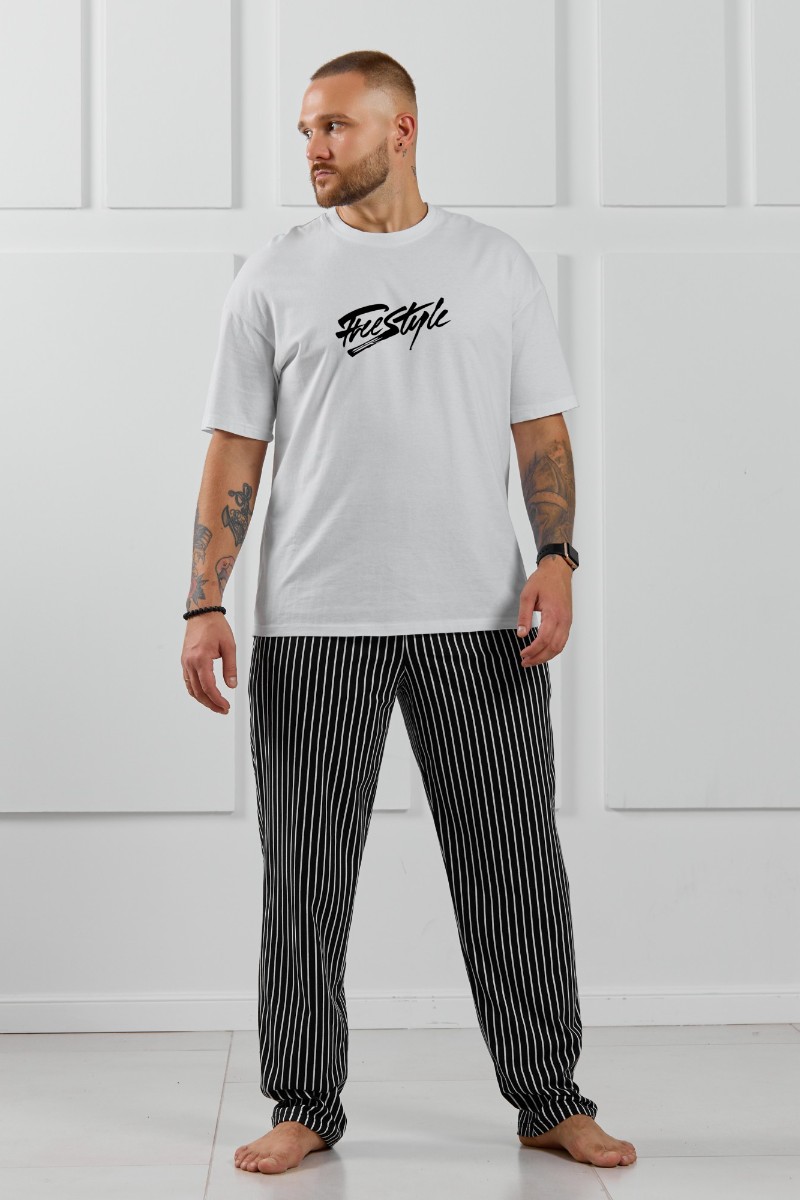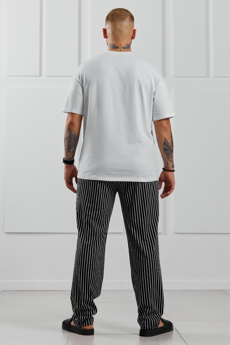 Представляем Вашему вниманию костюм мужской, состоящий из футболки и брюк. Футболка однотонная с принтом на груди; модель свободная, со спущенной линией плеч. Брюки из полотна с набивным рисунком в узкую черно-белую полоску, прямые, с боковыми карманами с обтачными входами, на притачном поясе с отстроченной эластичной тесьмой.