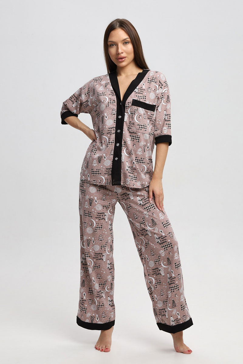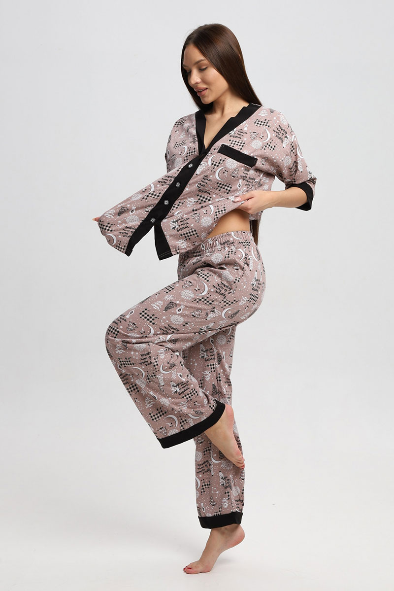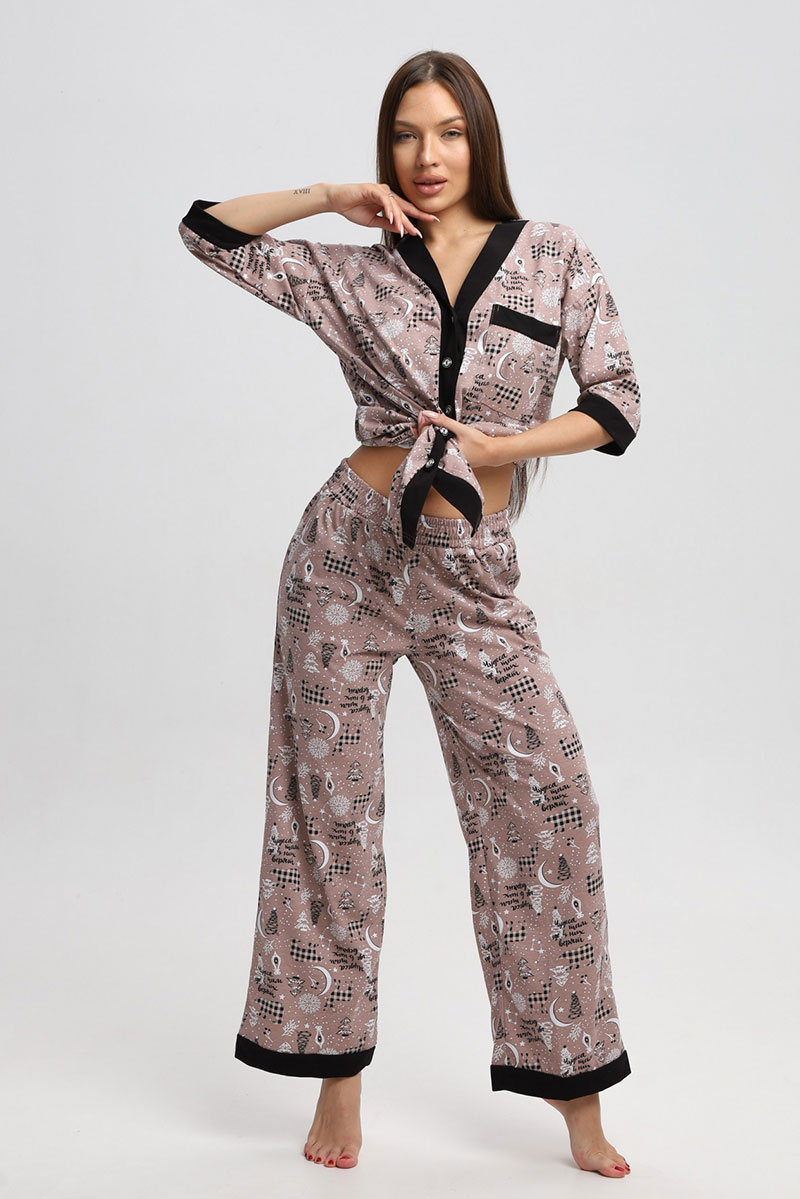 Представляем Вашему вниманию замечательную женскую пижаму, изготовленную из качественного материала. В этом наряде Вы всегда будете чувствовать себя уютно, удобно и комфортно, так как ткань очень легкая, нежная и приятная к телу. Костюм украшен стильным рисунком и эффектно смотрится. Наряд хорошо сидит на фигуре любого типа и не стесняет движений, даря Вам уверенность в себе.