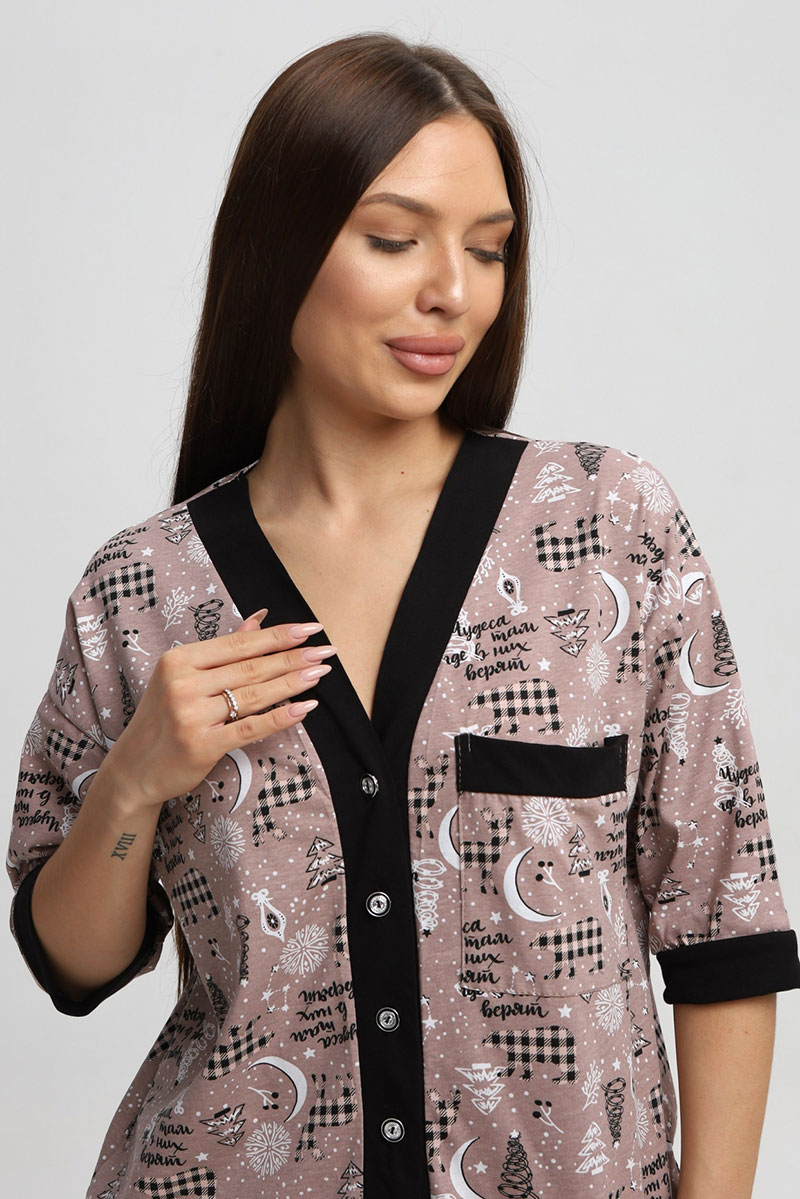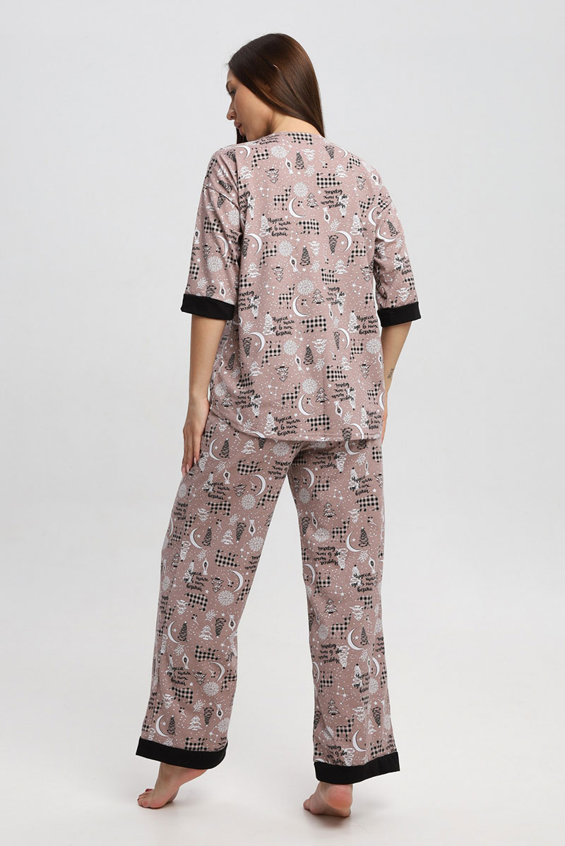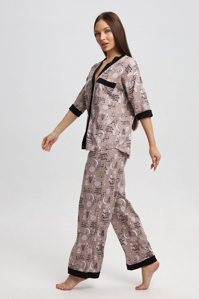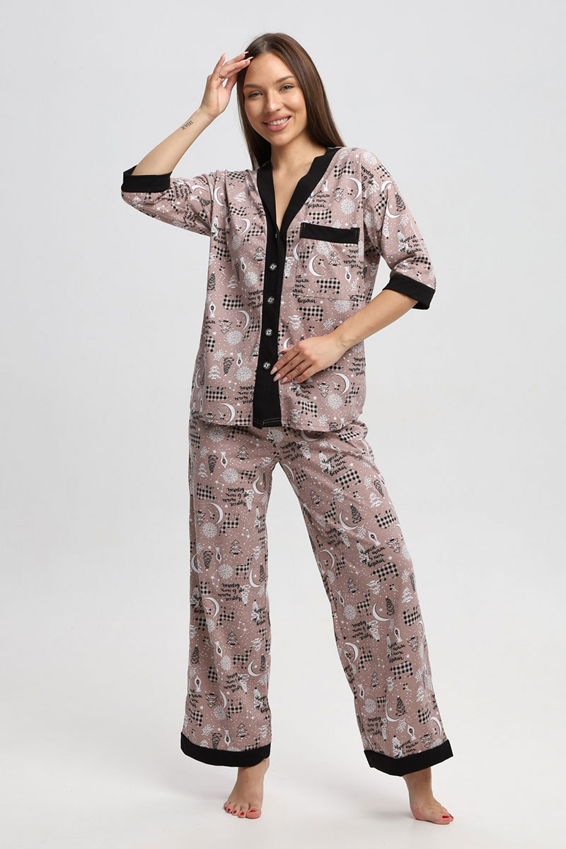 Представляем Вашему вниманию замечательную женскую пижаму, изготовленную из качественного материала. В этом наряде Вы всегда будете чувствовать себя уютно, удобно и комфортно, так как ткань очень легкая, нежная и приятная к телу. Костюм украшен стильным рисунком и эффектно смотрится. Наряд хорошо сидит на фигуре любого типа и не стесняет движений, даря Вам уверенность в себе.