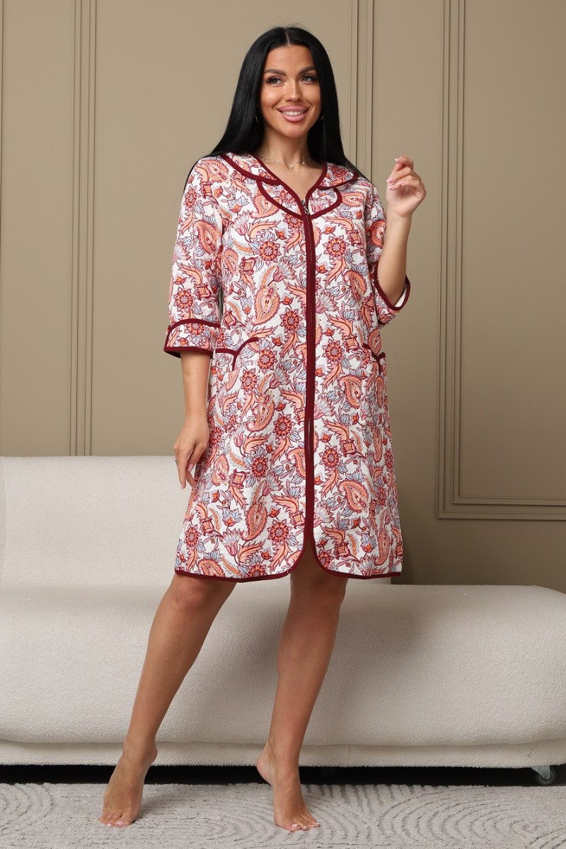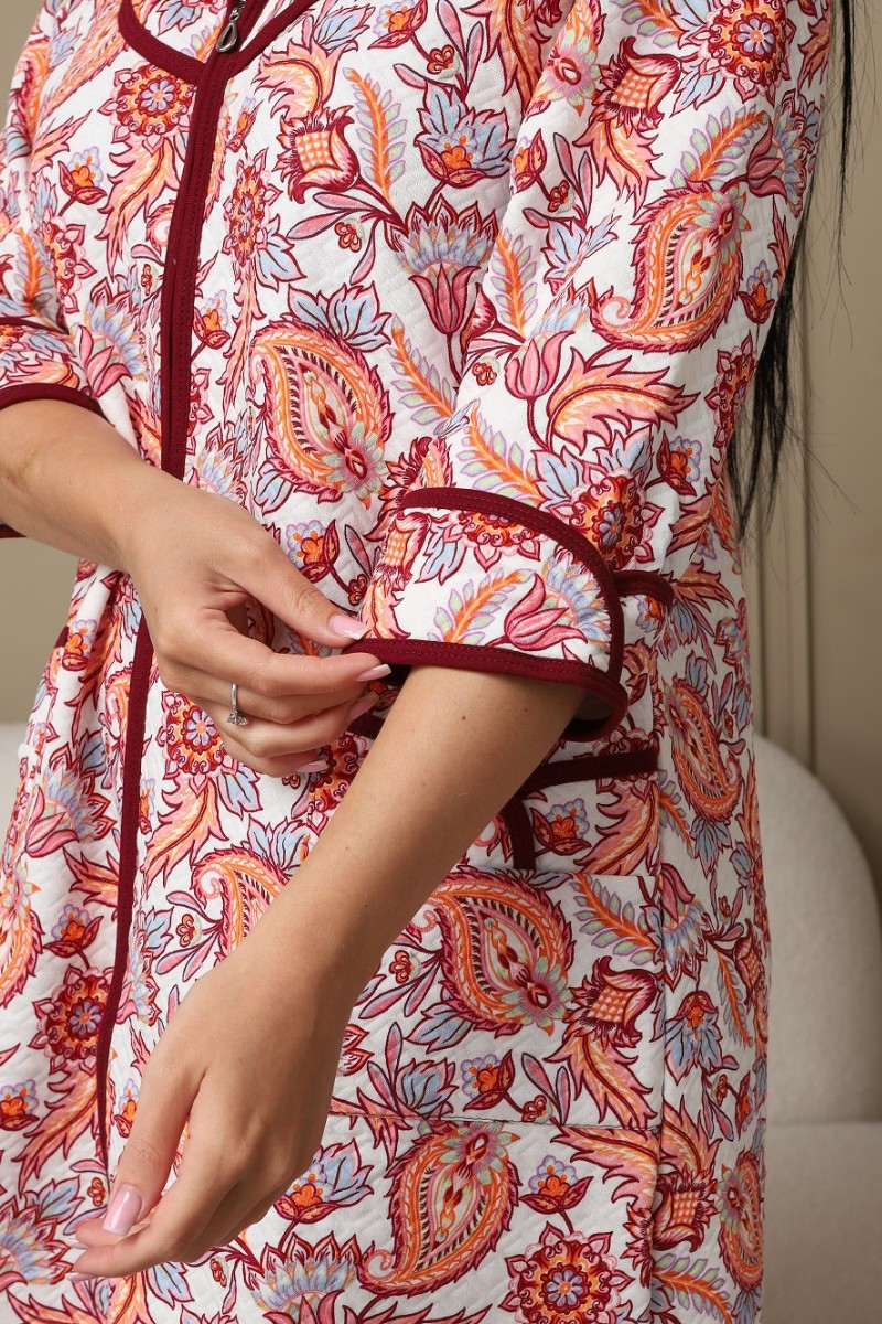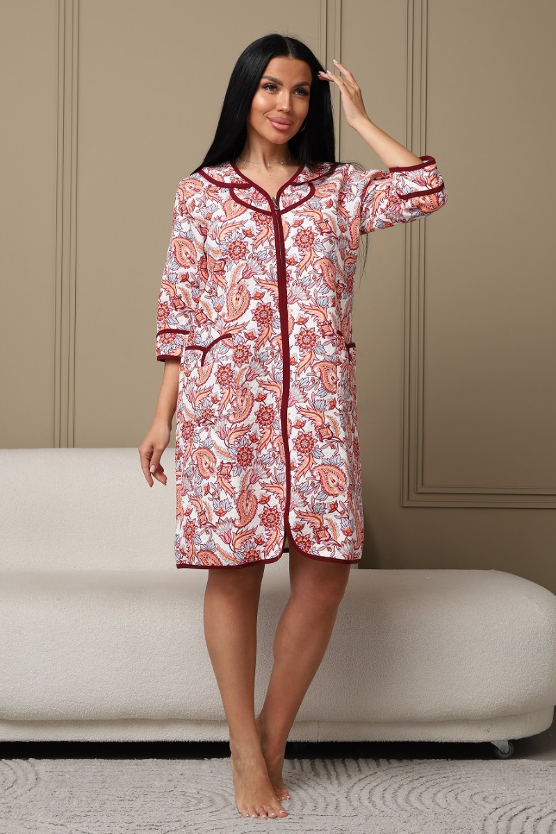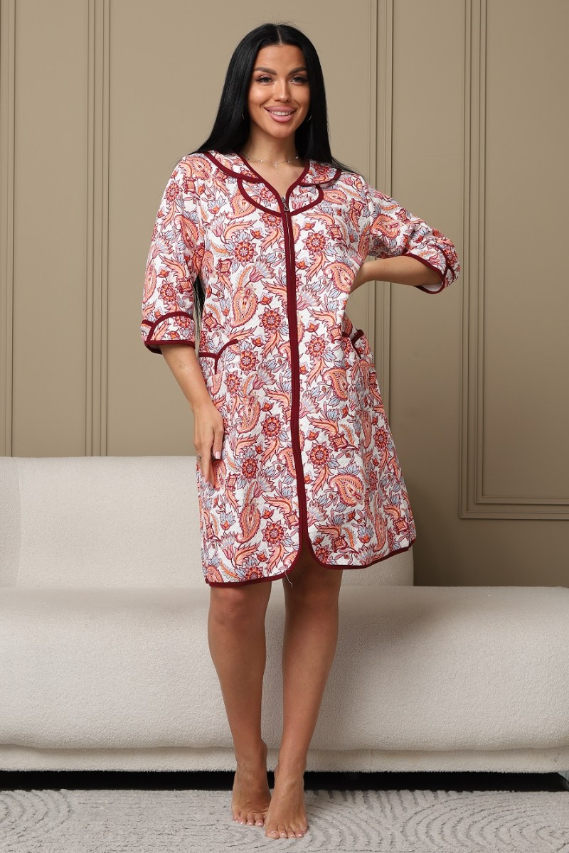Представляем Вашему вниманию уютный женский халат из капитония - дышащего хлопка. Халат с рукавом 3/4 на молнии, есть карманы. Модель имеет интересную расцветку, которая красиво смотрится и поднимает настроение. Изделие хорошо сидит на фигуре и подчеркивает её достоинства. В нём Вы будете чувствовать себя комфортно и уверенно.