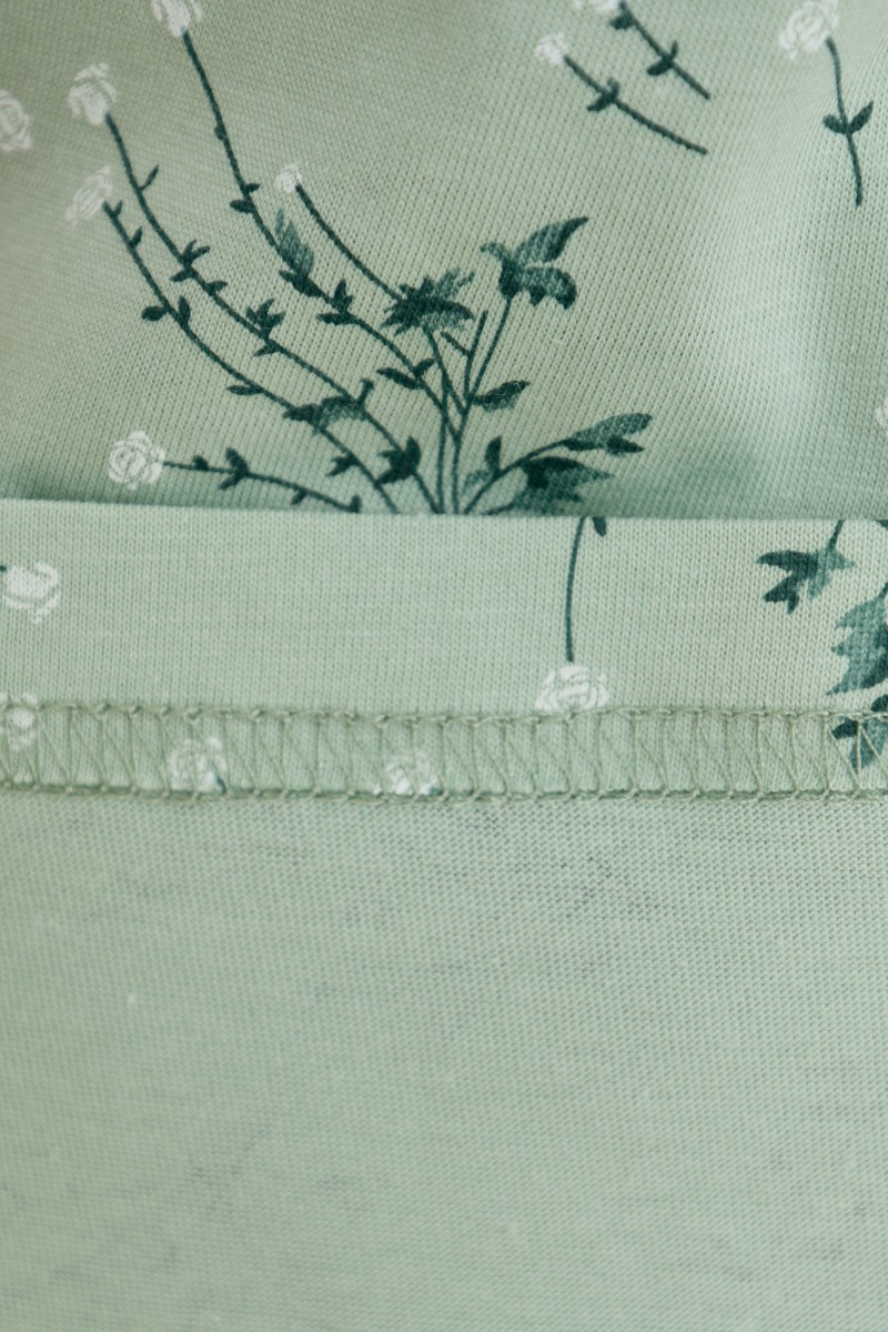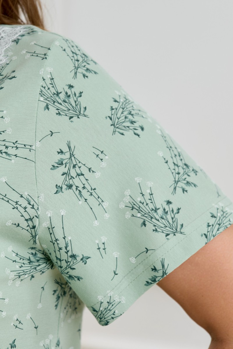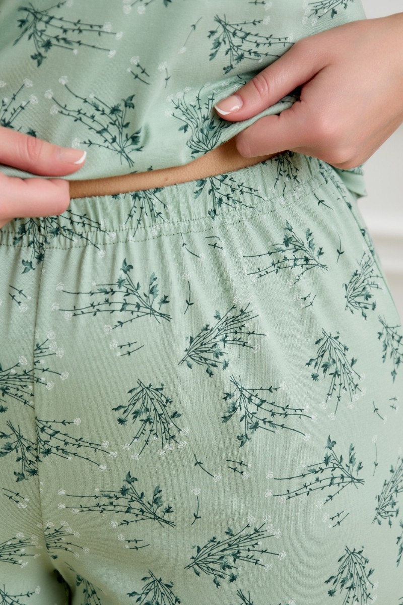 Представляем Вашему вниманию женскую пижаму из трикотажного полотна «кулирка» с набивным рисунком, состоящая из футболки и бридж. Футболка прямого кроя, с короткими втачными рукавами. Горловина V- образной формы, обработана кружевом с фестонным краем, по центру настрочен декоративный бантик из узкой атласной тесьмы.Бриджи свободные, длиной до середины икры, с эластичной тесьмой по талии.