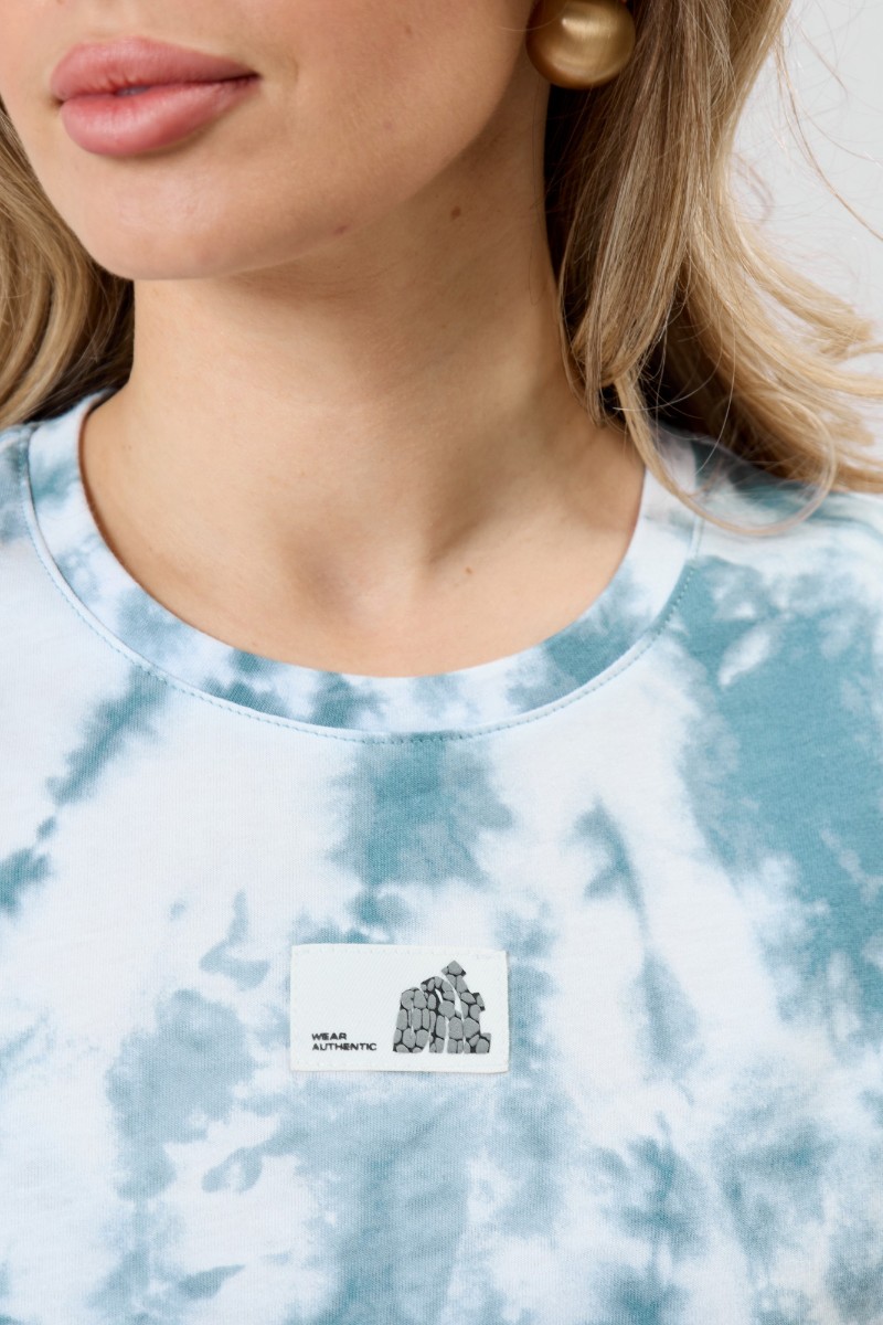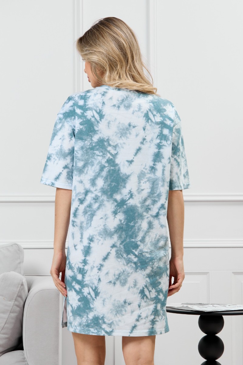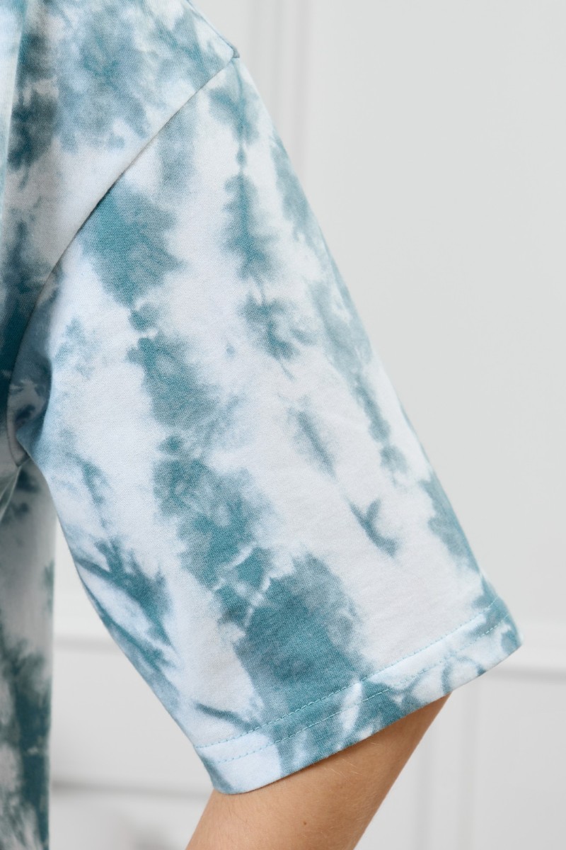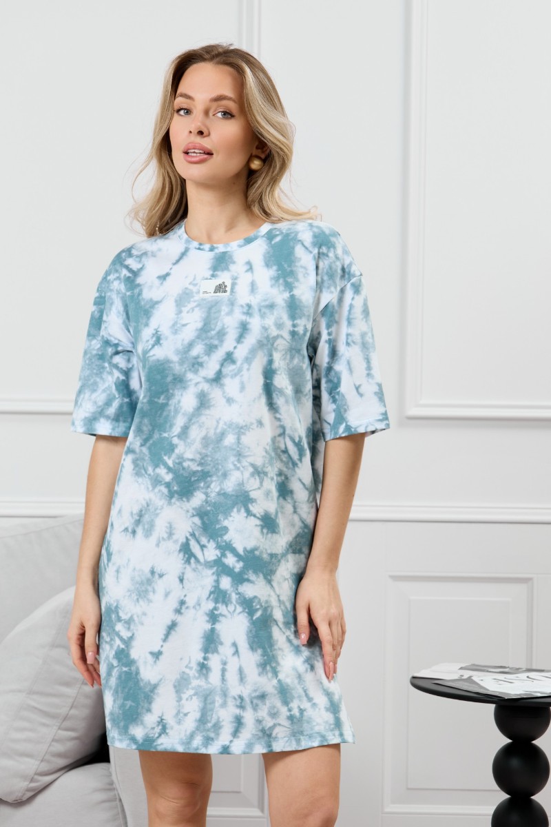 Представляем Вашему вниманию женскую тунику из трикотажного полотна «кулирка» с набивным рисунком, прямого силуэта, с короткими втачными рукавами, горловиной овальной формы, обработанной притачной бейкой из основного материала, с разрезами в боковых швах. По центру полочки рядом с горловиной настрочен декоративный элемент-нашивка.