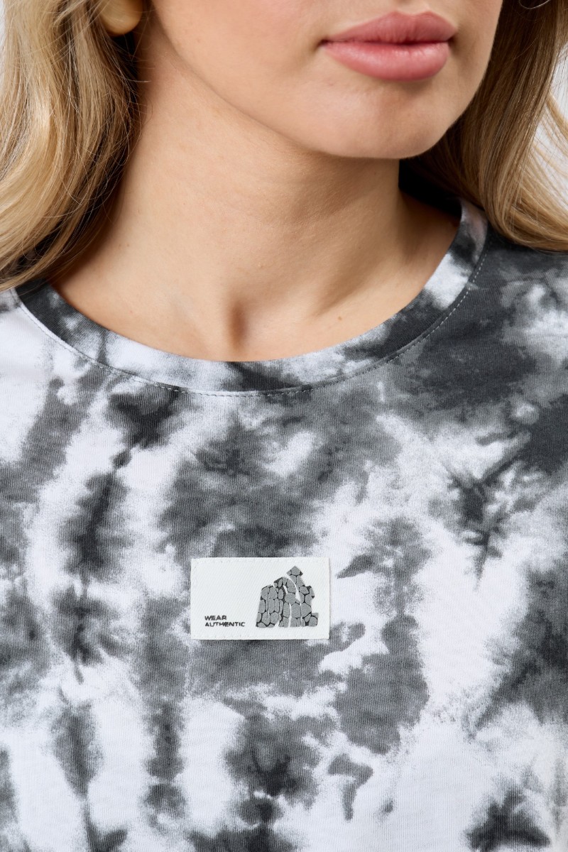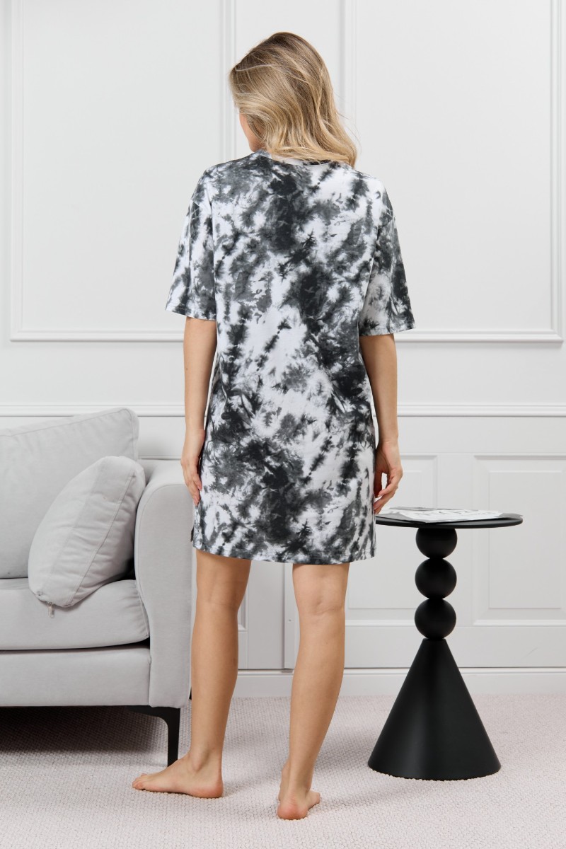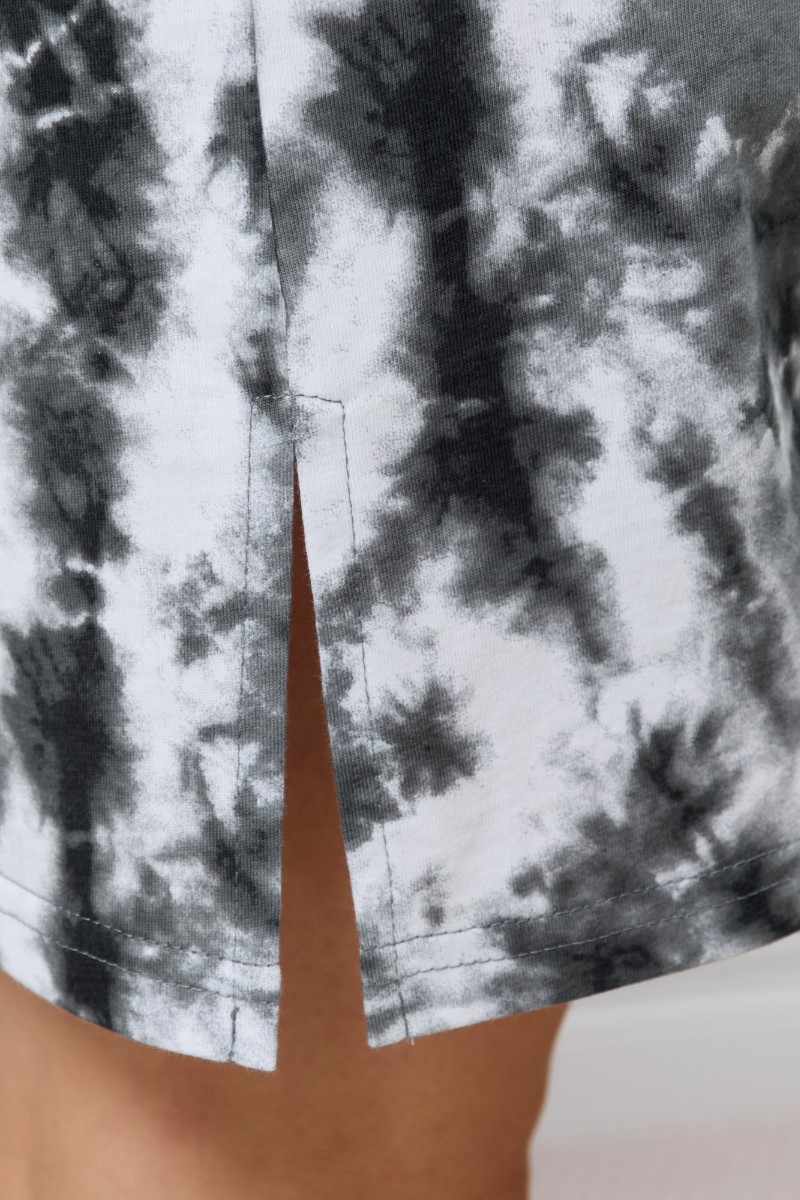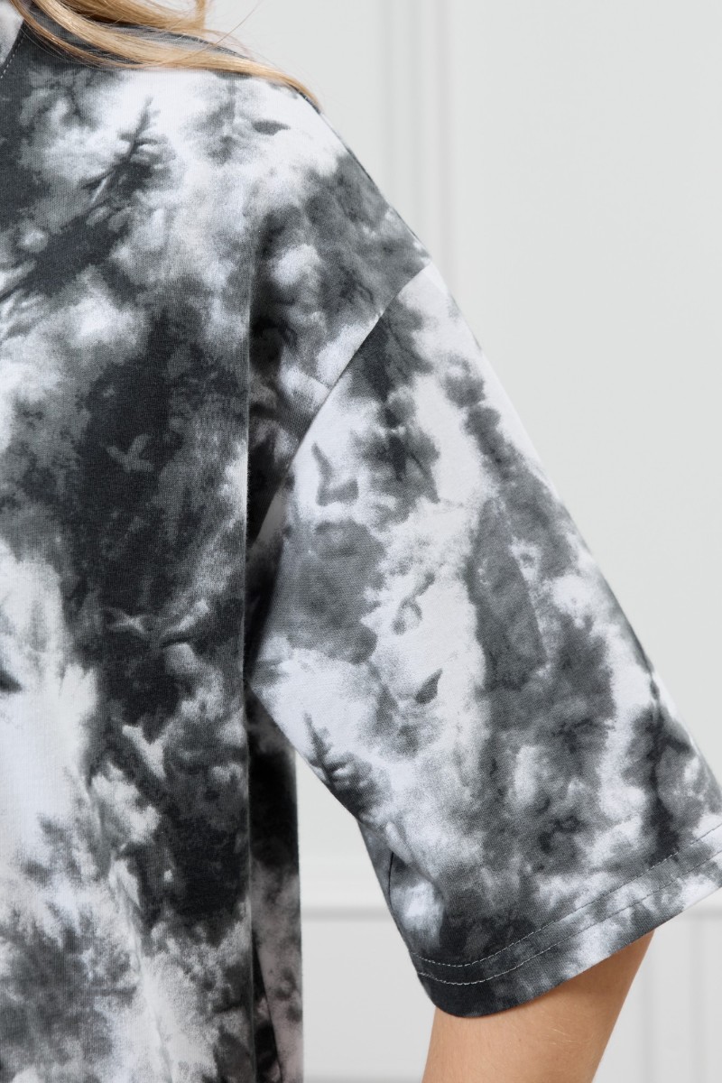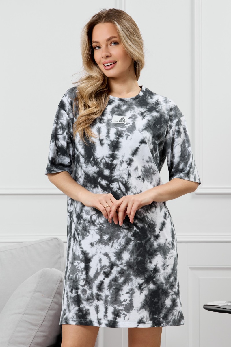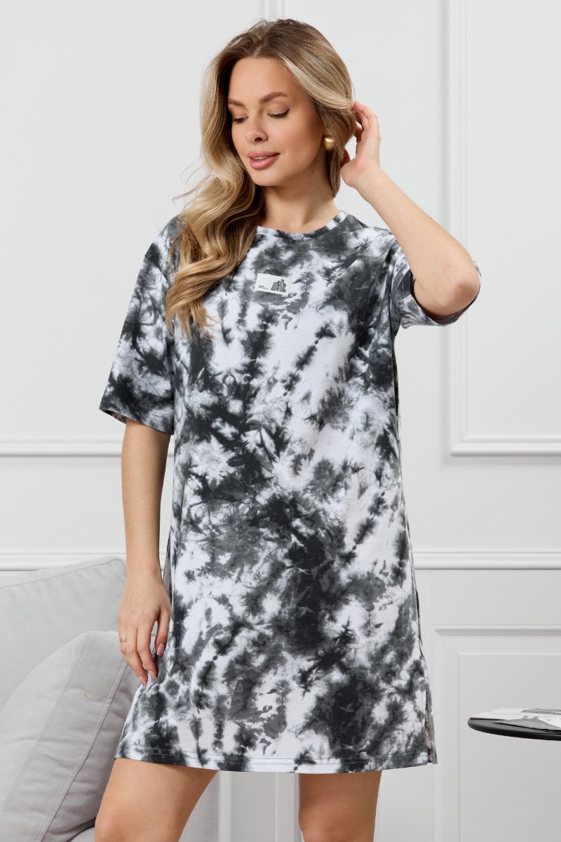 Представляем Вашему вниманию женскую тунику из трикотажного полотна «кулирка» с набивным рисунком, прямого силуэта, с короткими втачными рукавами, горловиной овальной формы, обработанной притачной бейкой из основного материала, с разрезами в боковых швах. По центру полочки рядом с горловиной настрочен декоративный элемент-нашивка.
