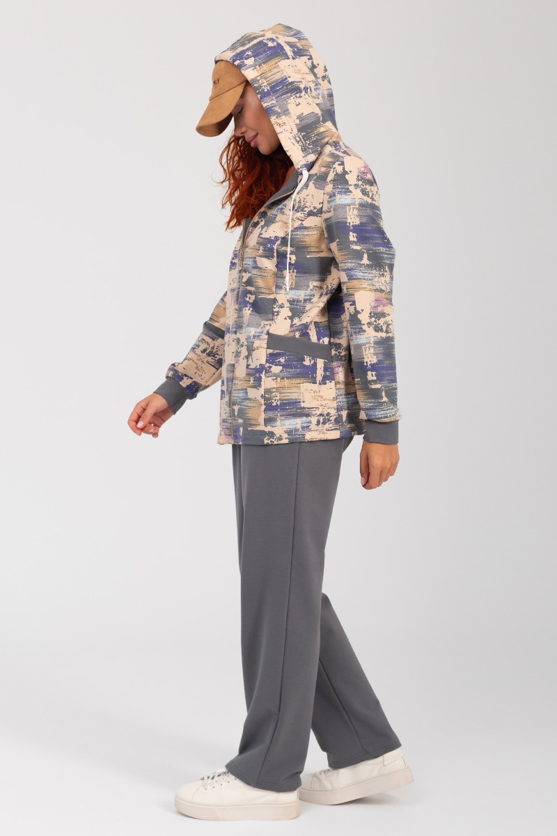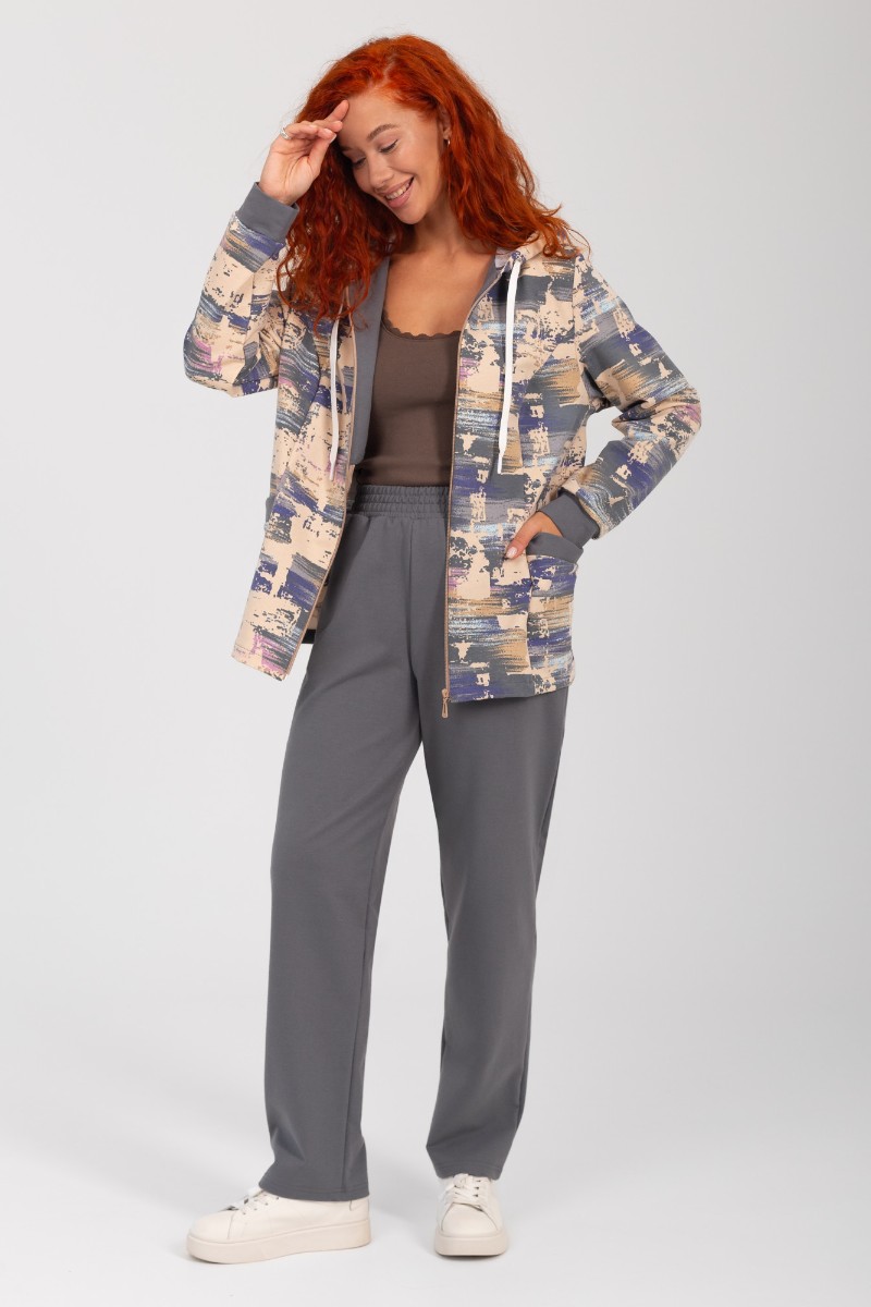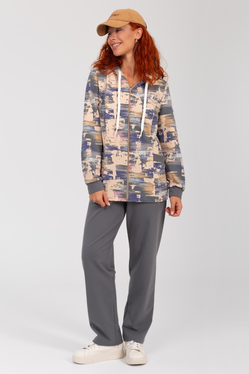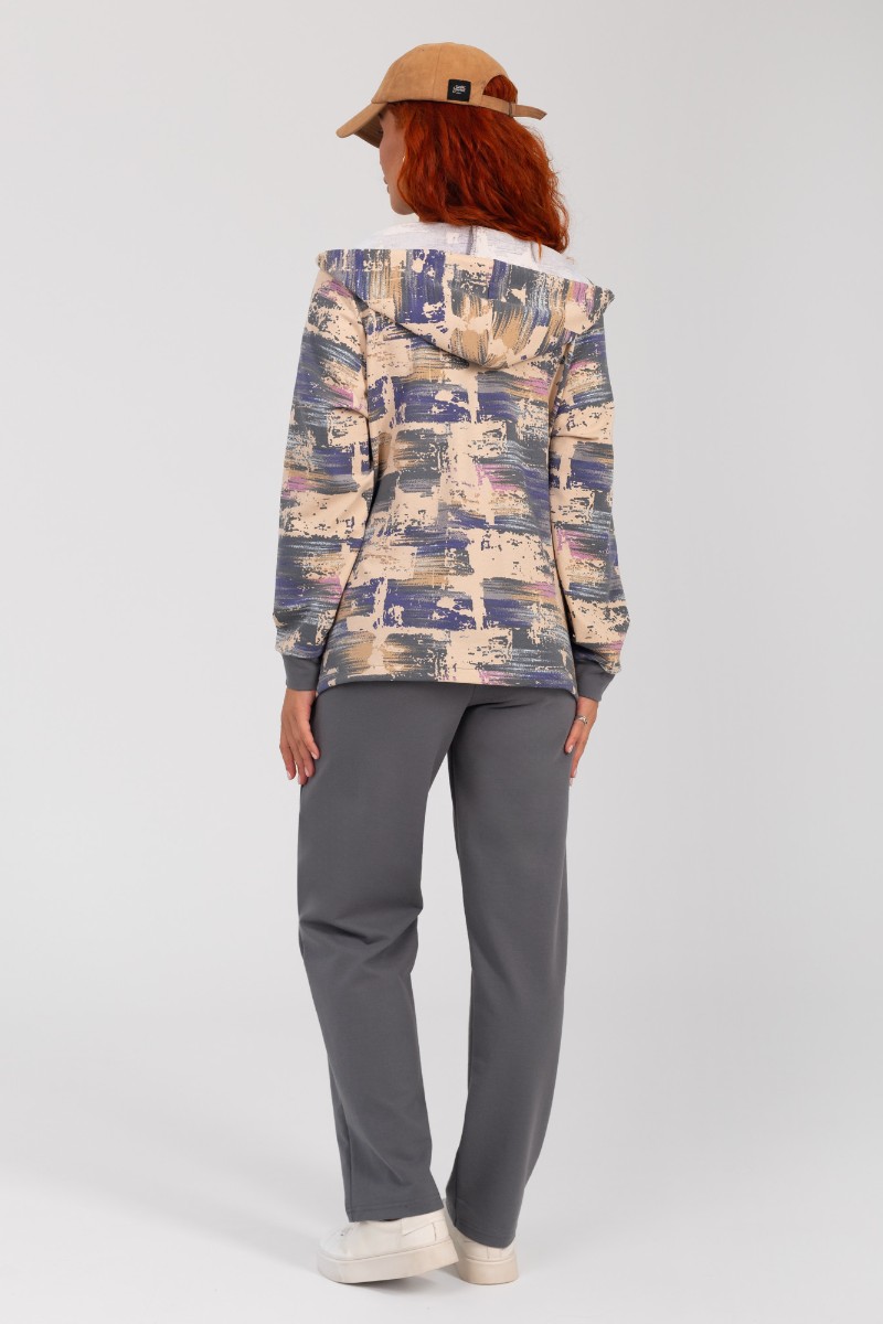 Представляем Вашему вниманию комфортный женский костюм двойку прямого силуэта, который состоит из кофты, украшенный контрастным и изящным принтом, и длинных брюк. Кофта дополнена вместительными карманами и удобным капюшоном. Комплект изготовлен из высококачественного материала, устойчивого к износу.