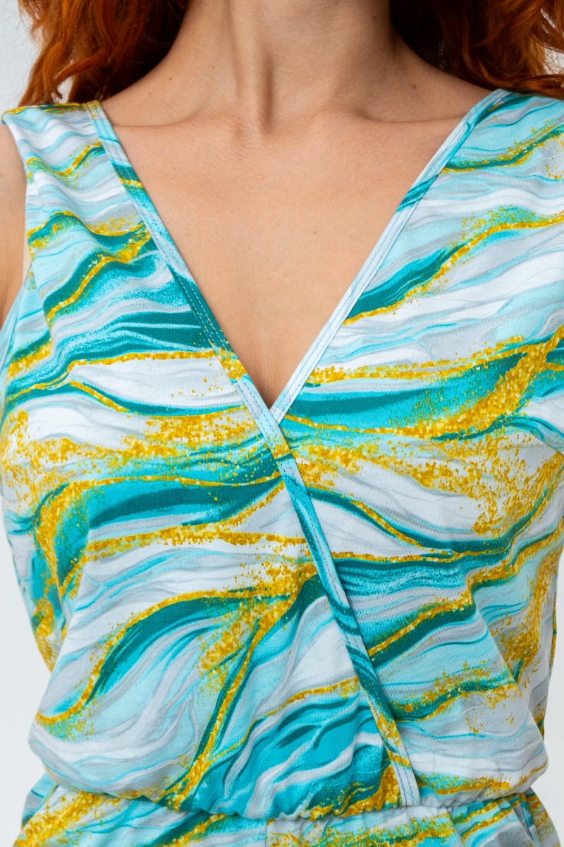 Представляем Вашему вниманию стильный и универсальный элемент летней одежды - комбинезон с шортами. Верх комбинезона соединён с шортами, тем самым создаётся непрерывный образ. Передняя и задняя части верха комбинезона состоят из двух отдельных элементов, которые соединены на запах, образуя элегантный V-образный вырез. По линии талии для удобства вшита резинка. Шорты свободные, с боковыми карманами. Надевайте его на пляж, носите с топом или купальником. Меняйте образ с помощью ремешков.